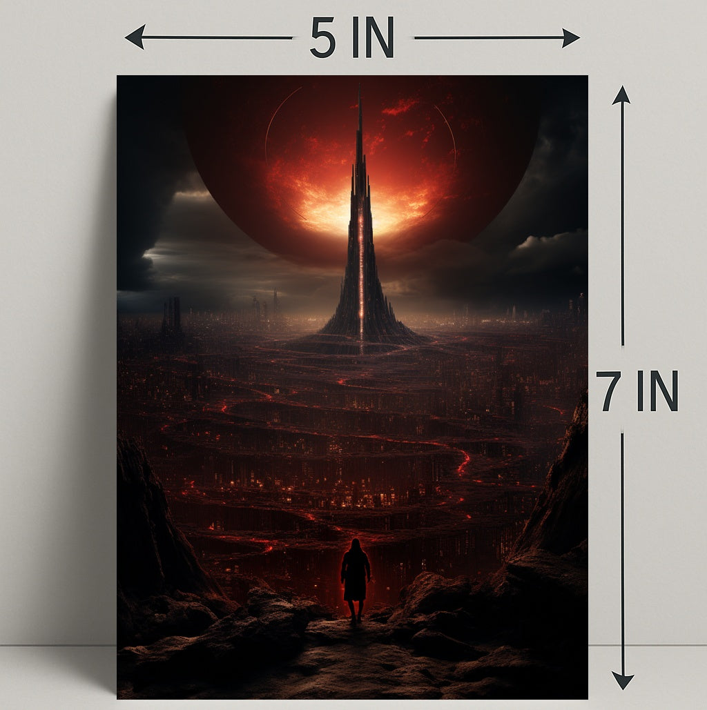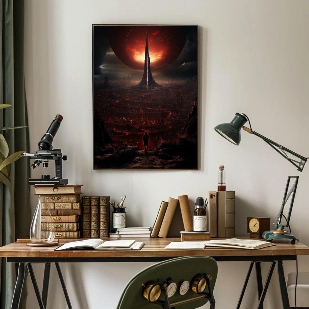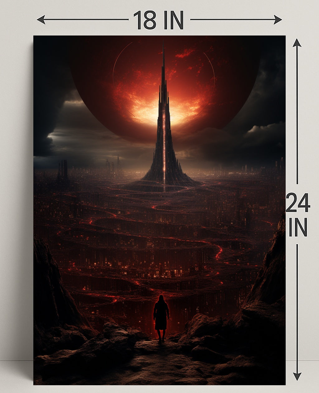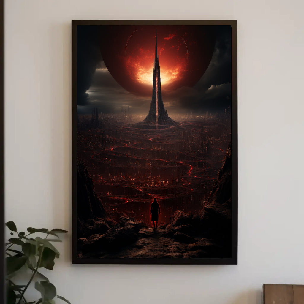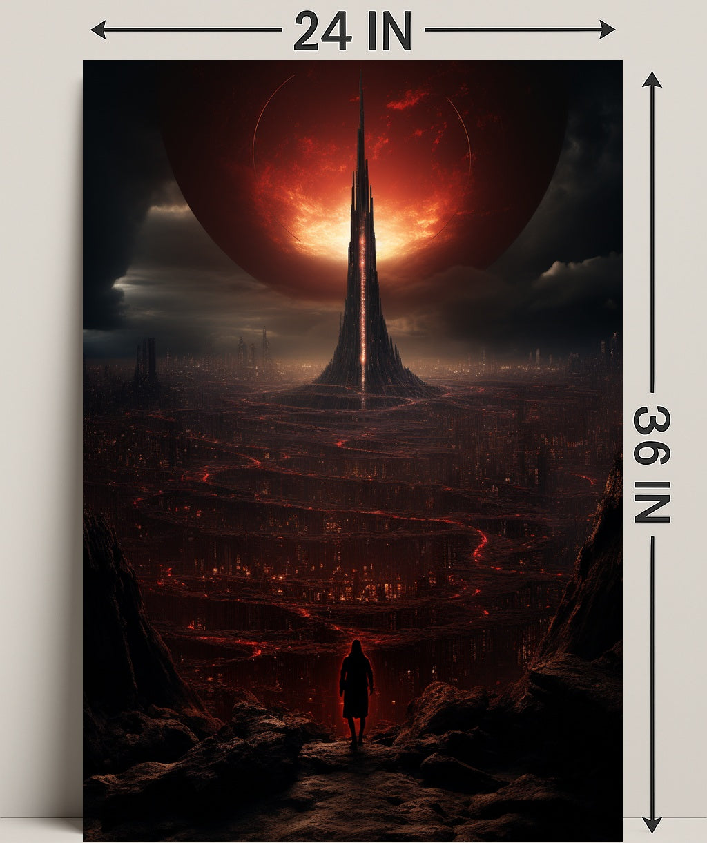 The Tower Of Dystopia Poster from PosterGoat transforms any room into a cinematic scene of dark grandeur. This high-contrast art print captures a spirelike tower rising from a layered, glowing cityscape beneath a fiery celestial body — a dramatic focal point for living rooms, offices, game rooms, or galleries.