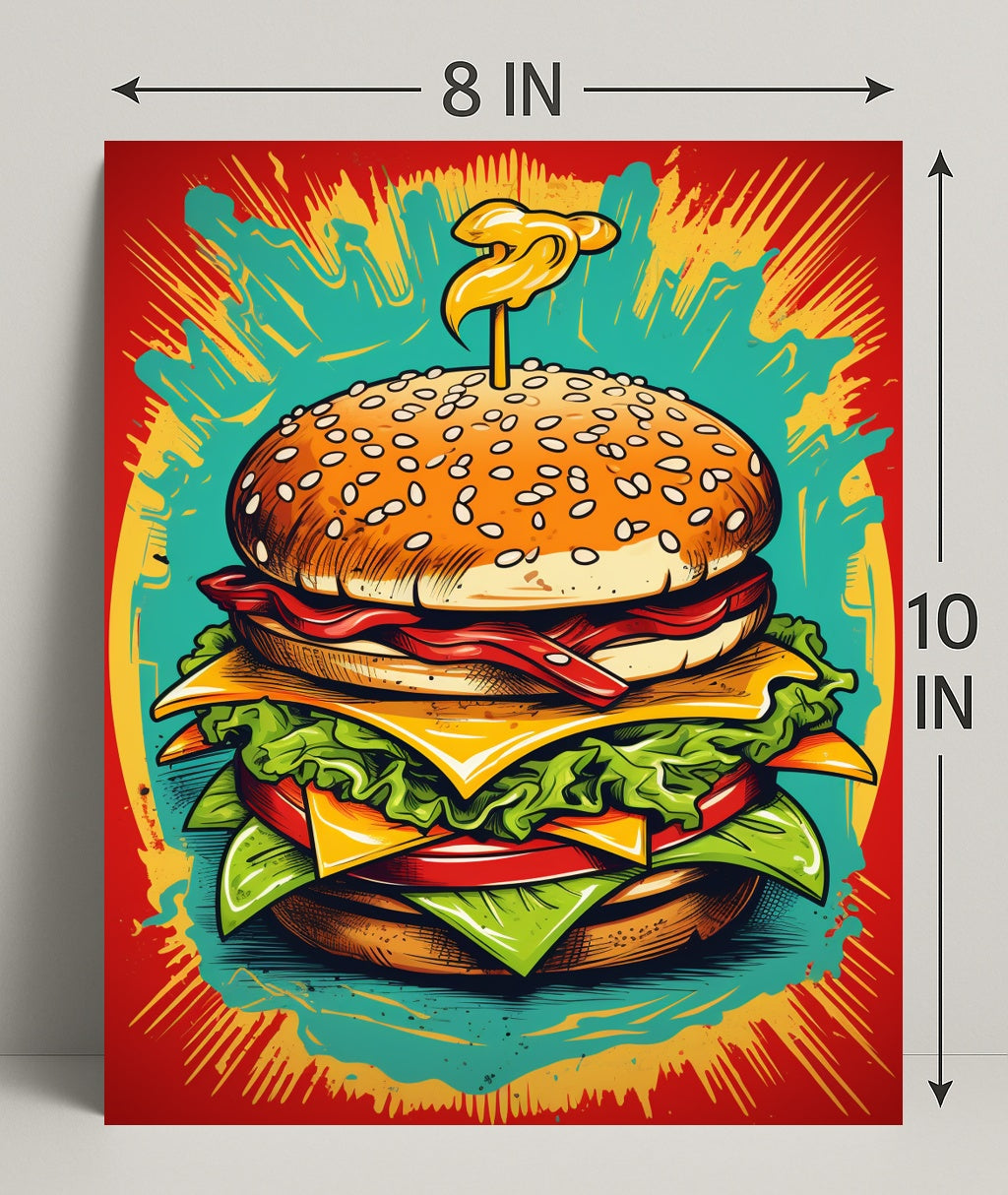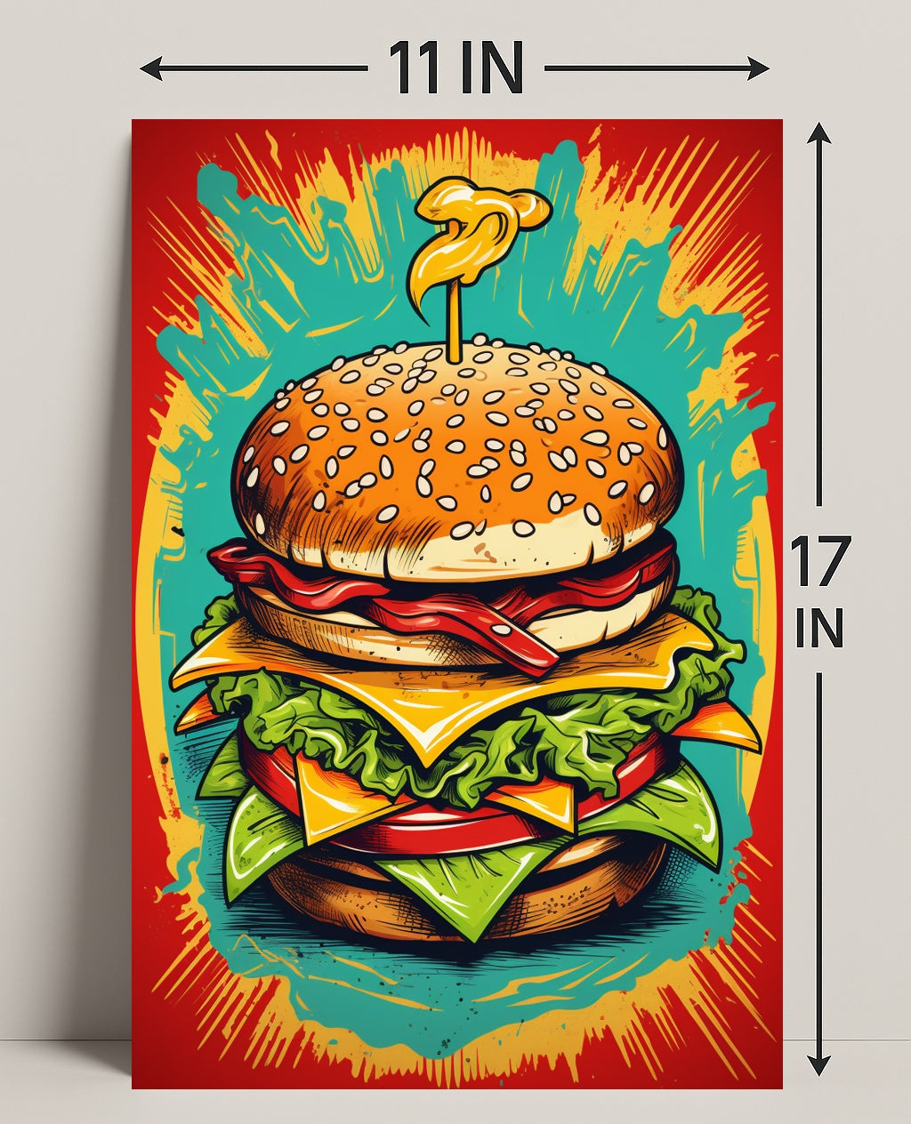 Bring bold flavor and pop-art energy to your walls with The Ultimate Burger Explosion Poster by PosterGoat. This eye-catching poster features a towering, illustrated burger—sesame-seed bun, crisp lettuce, melty cheese, ribbons of bacon and a dramatic mustard swirl—set against an explosive teal, red and yellow background that pops from across the room.