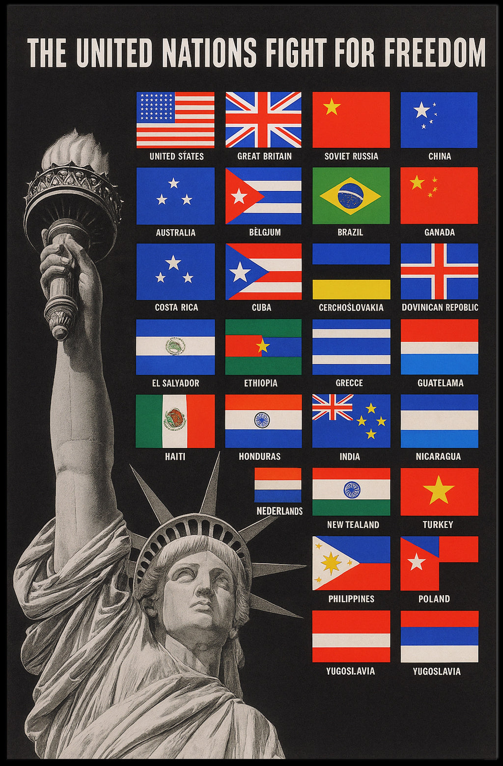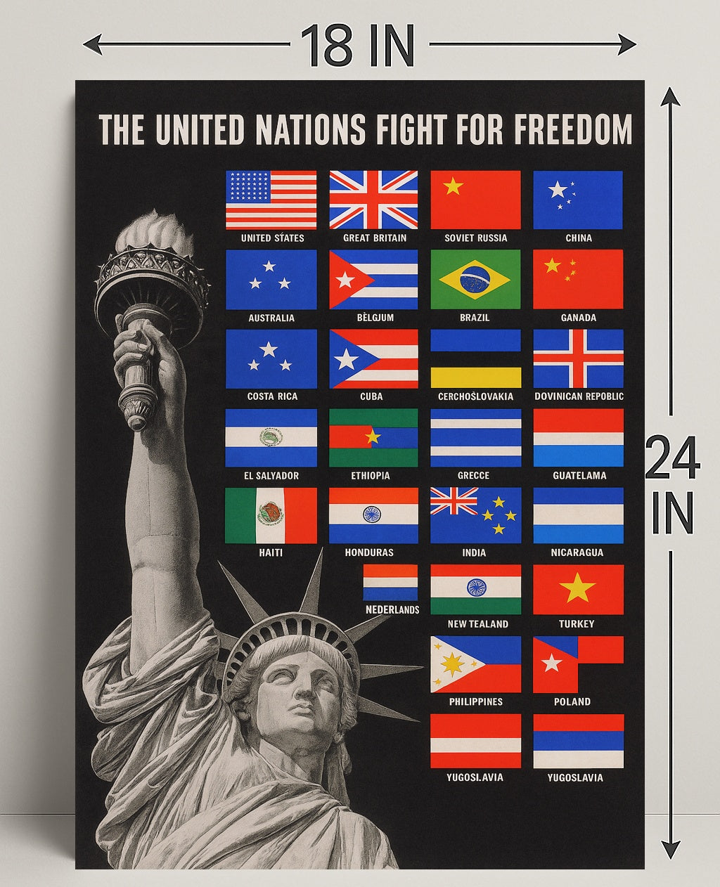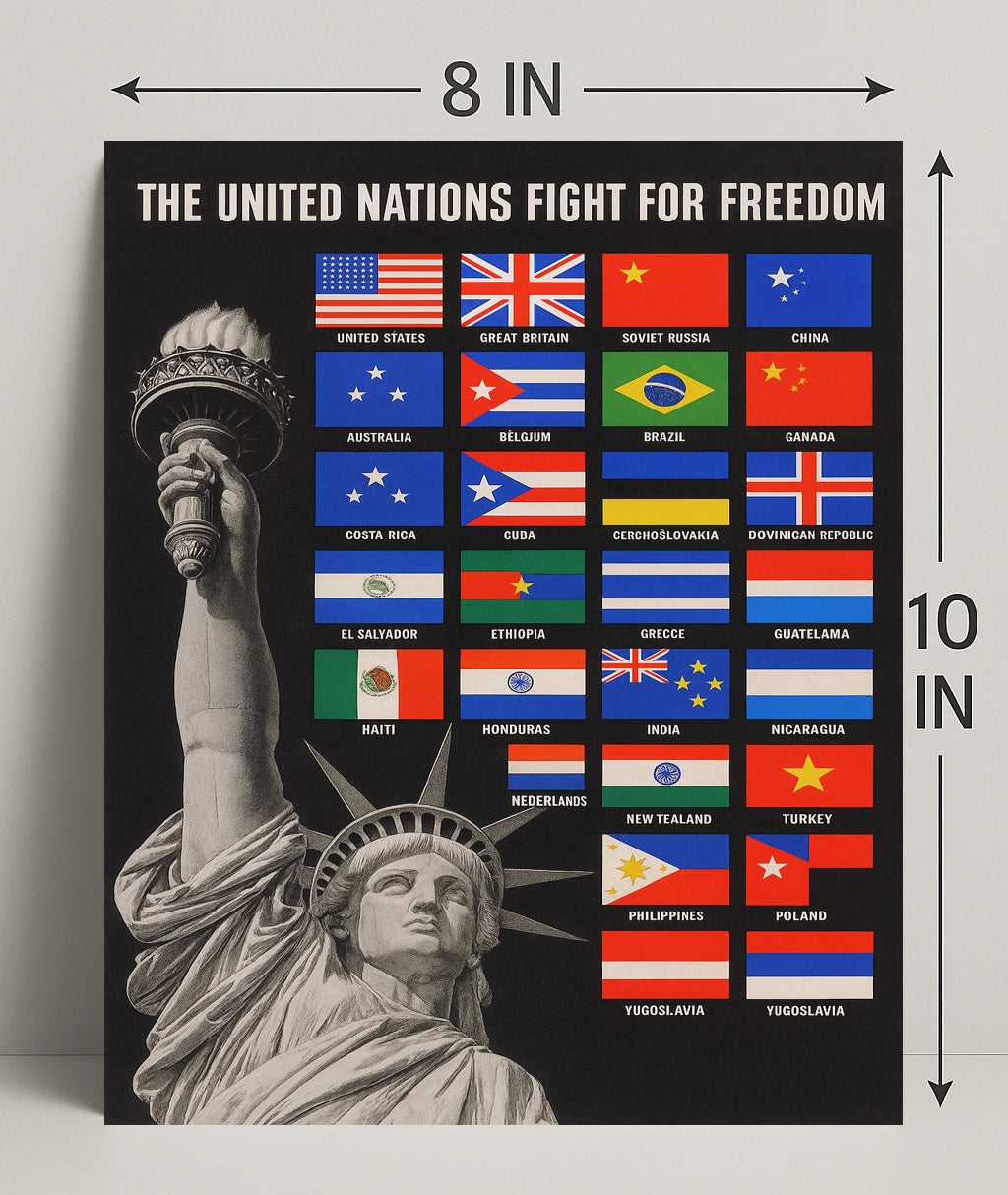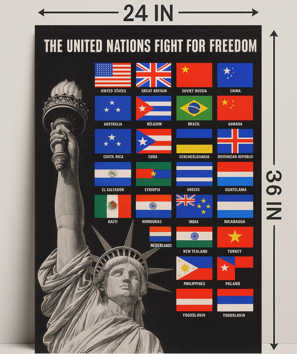 - Design: Large, high-contrast composition featuring the Statue of Liberty on a deep black background and rows of colorful national flags under the bold title "THE UNITED NATIONS FIGHT FOR FREEDOM".
