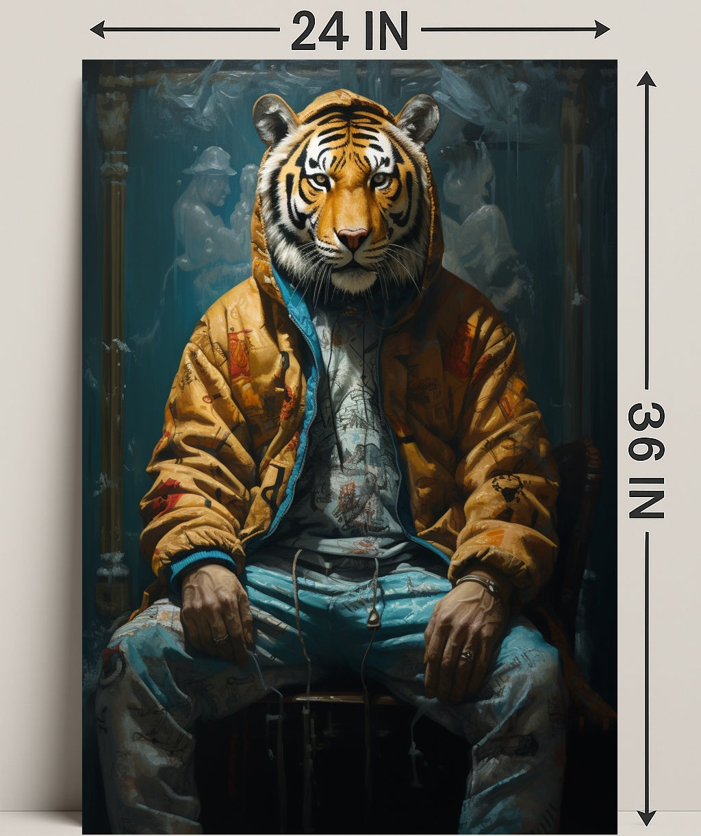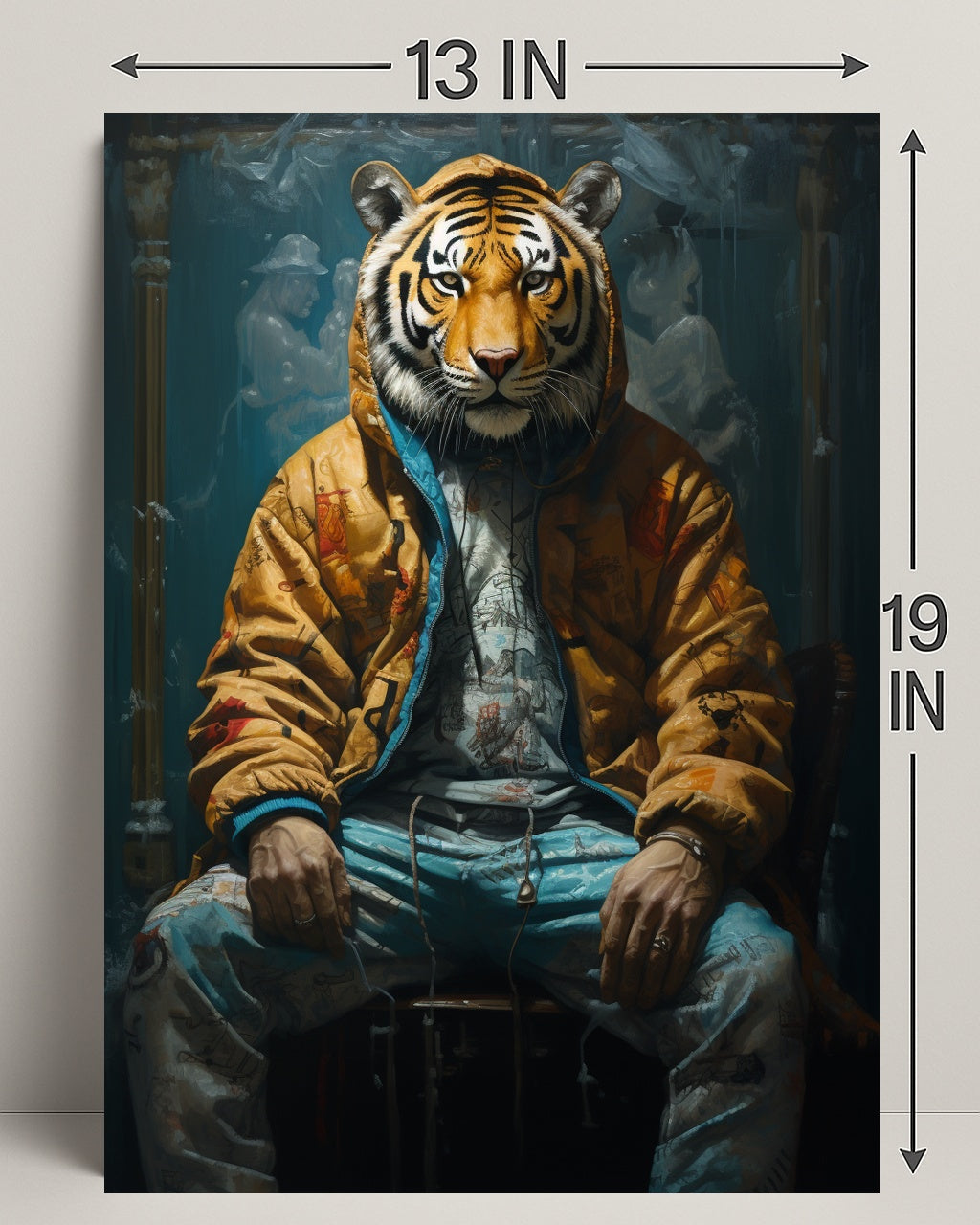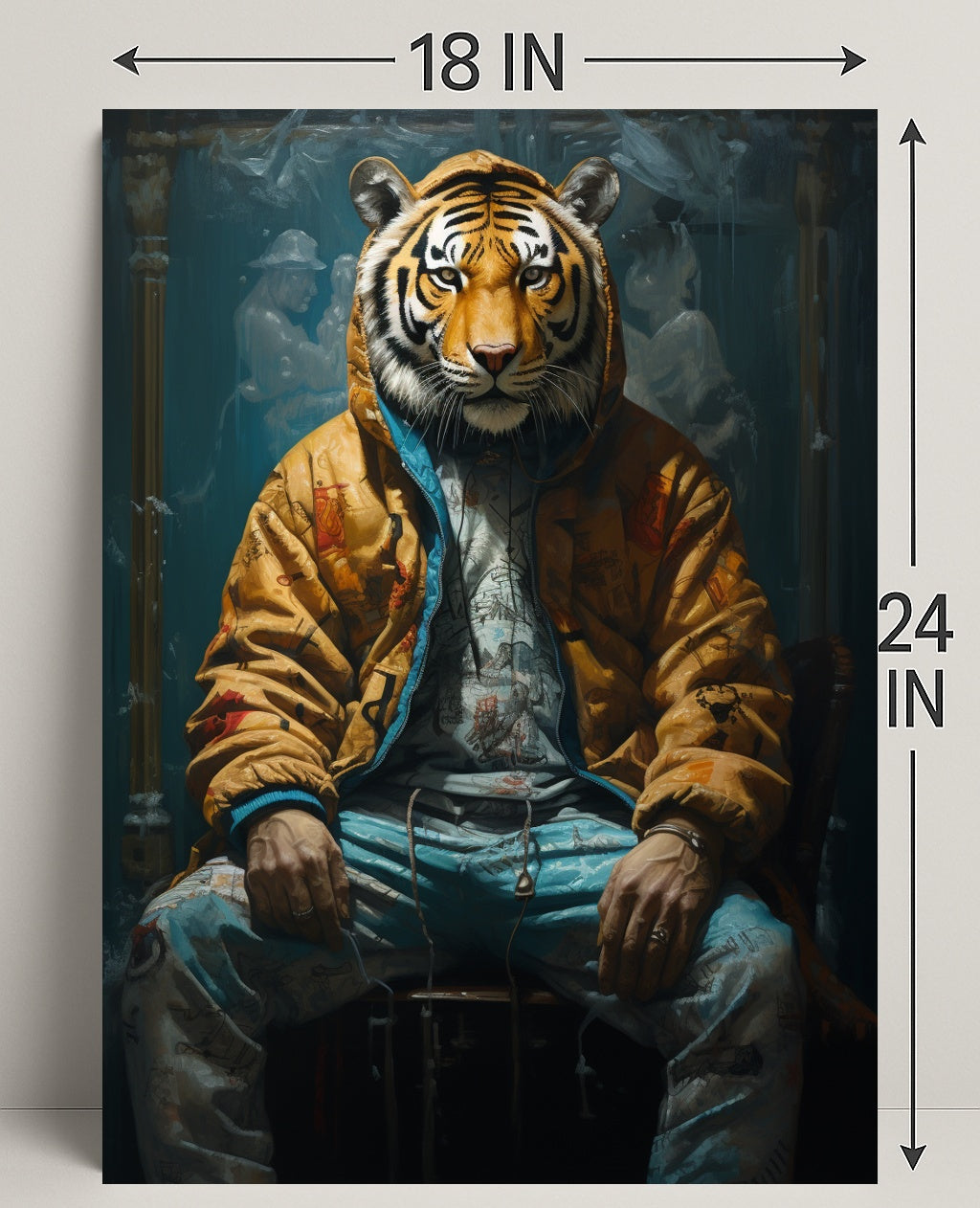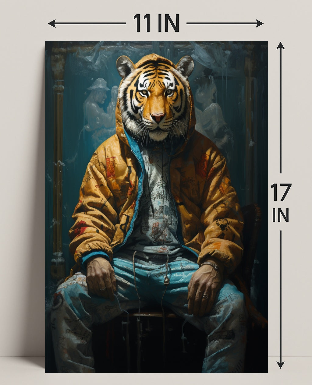 The Urban Tiger Poster from PosterGoat is a bold, conversation-starting piece of wall art that blends streetwise attitude with fine-art detail. This striking poster features a photorealistic tiger head set atop a human body dressed in a layered hooded jacket and patterned joggers—an urban, pop-art twist that brings energy and personality to any living room, office, or gallery wall.