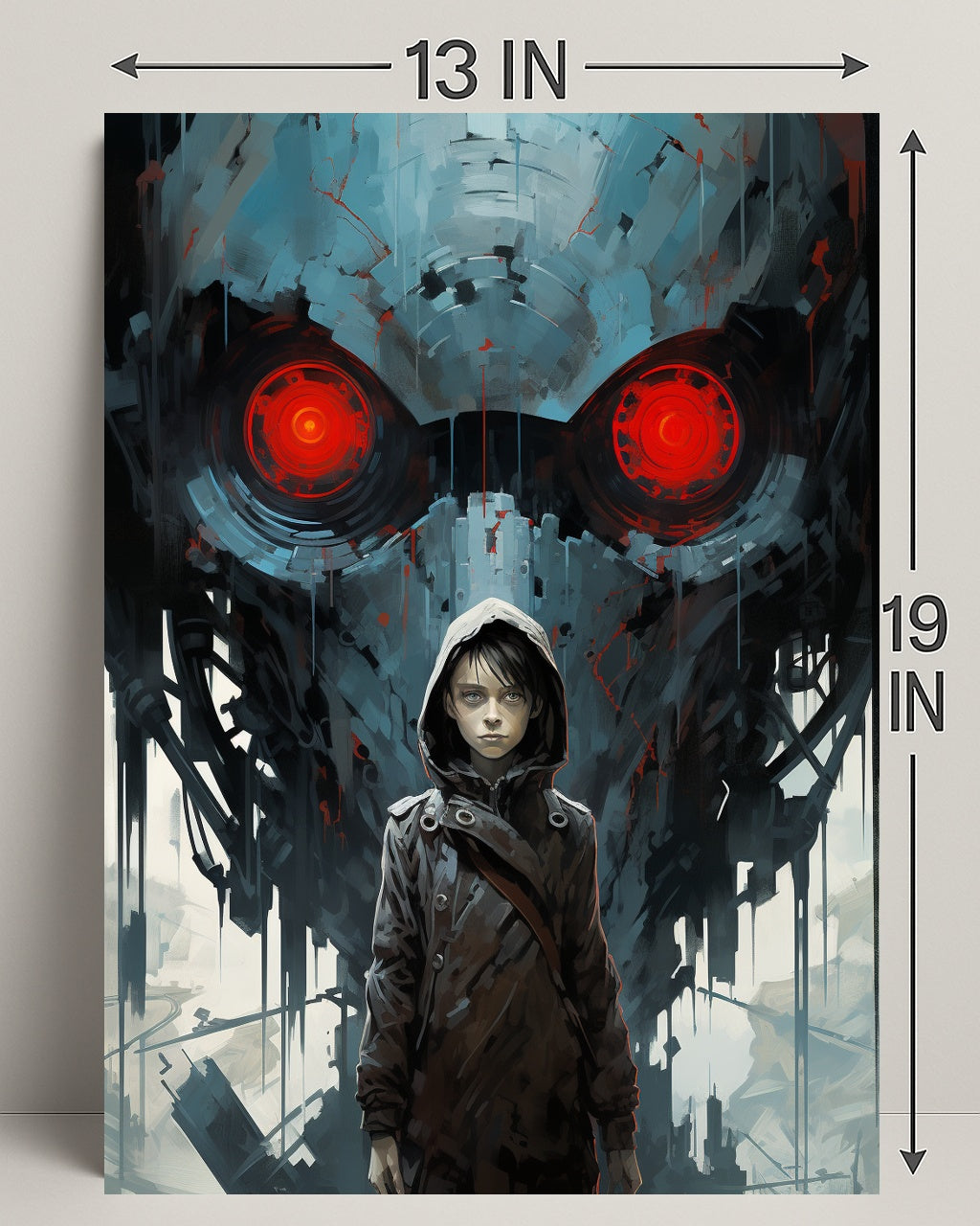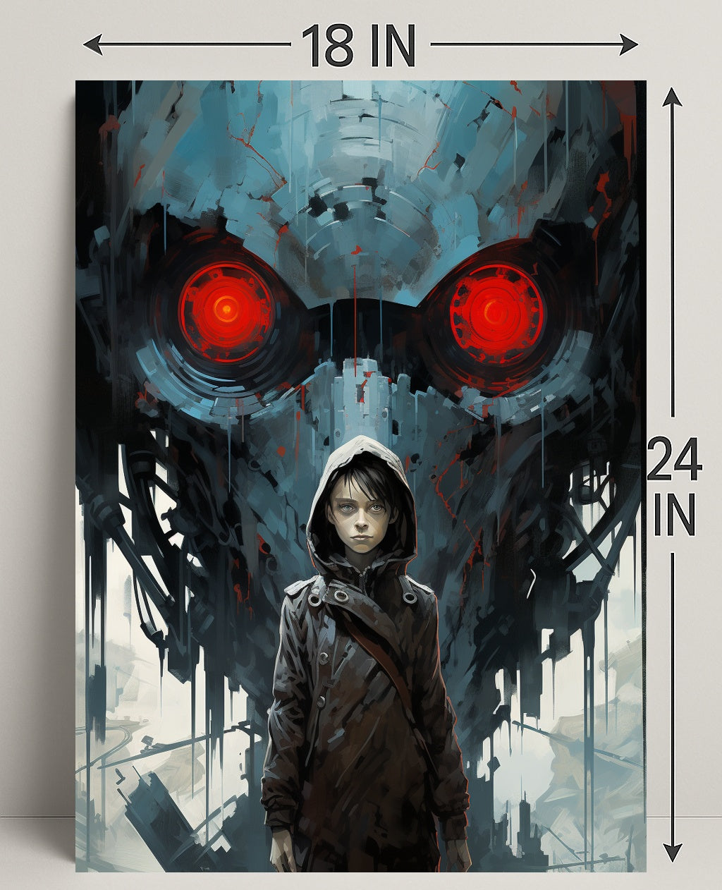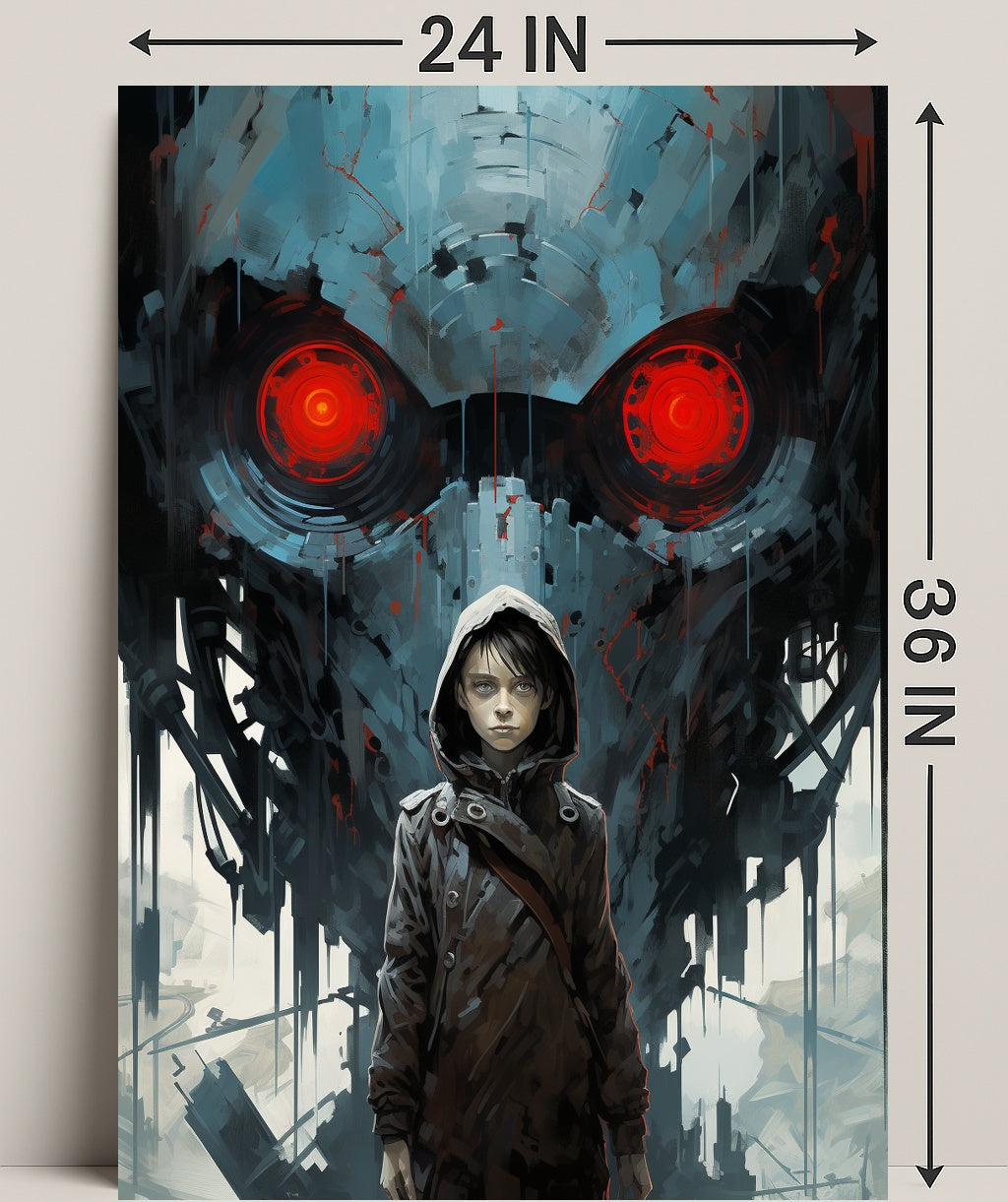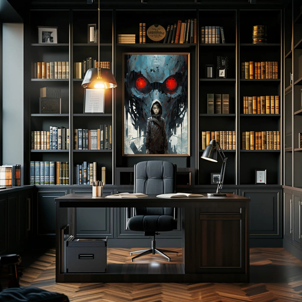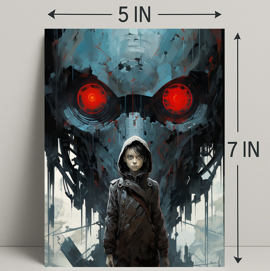 The Watchful Machine Poster by PosterGoat brings cinematic storytelling to your walls — a striking art print that blends minimalist composition with dramatic, sci‑fi imagery. A hooded youth stands resolute in the foreground while a massive, mechanical visage with glowing red eyes looms behind, creating a powerful contrast of human vulnerability and machine menace. This poster makes a bold focal point for living rooms, studios, game rooms, and contemporary interiors.