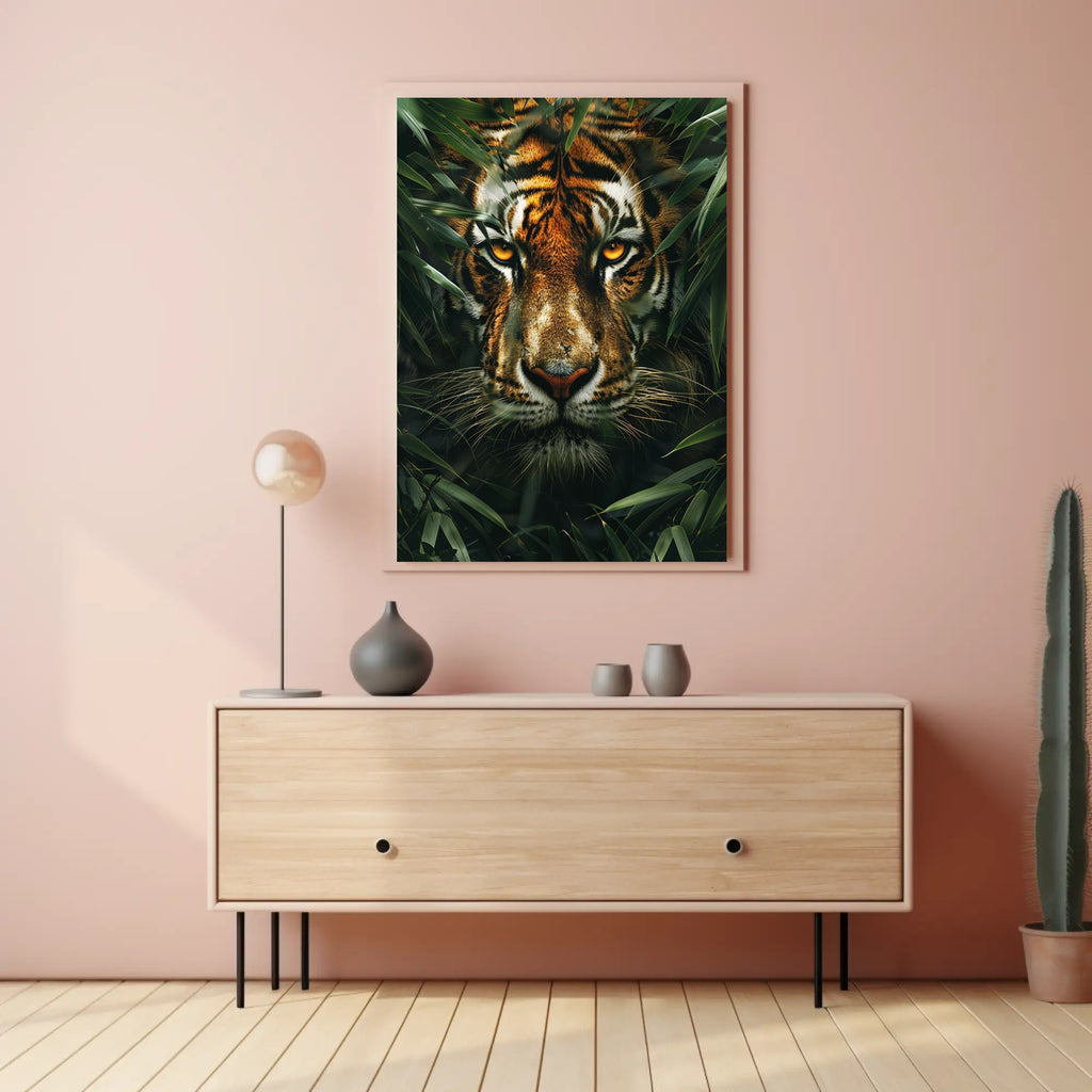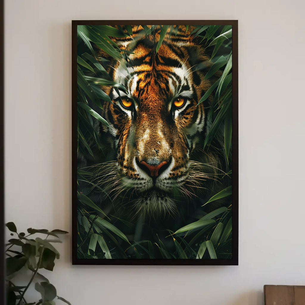 Bring raw wildlife power into your home with The Watchful Tiger Wall Art Poster Print for Home Decor by PosterGoat. This striking poster captures a close-up, photo-realistic tiger face emerging through dense jungle foliage — golden eyes locked on the viewer, impeccable fur detail, and deep, verdant greens that make a bold focal point in any room.