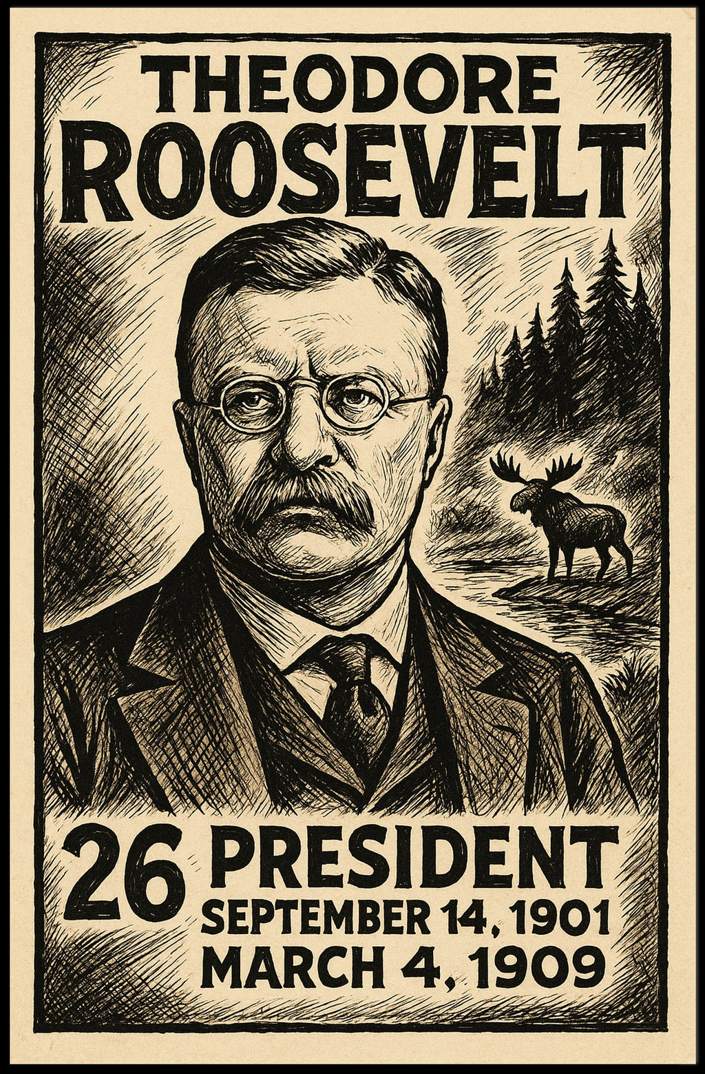 Capture history with bold, monochrome style. This black-and-white poster features Theodore Roosevelt, the 26th President of the United States, rendered in clean line art for a striking wall statement.