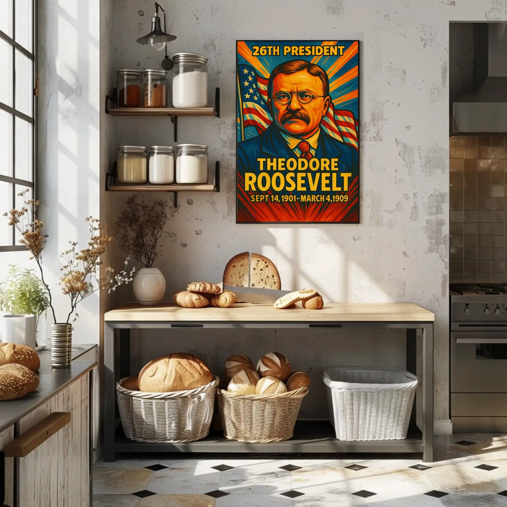 Perfect as Theodore Roosevelt poster wall art, this piece serves as a tribute to American politics, leadership, and the enduring legacy of the USA. A vibrant addition to any space that values history, portraiture, and vintage-inspired modern art.