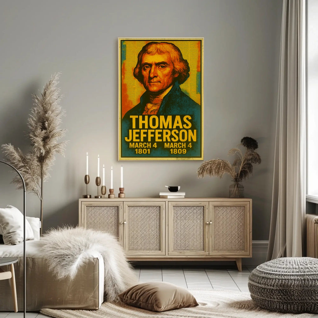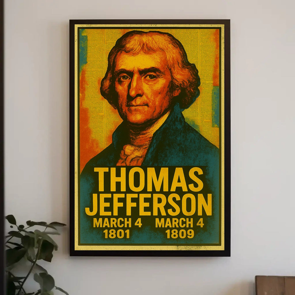 Celebrate American history with this Thomas Jefferson Vintage Patriotic Poster Print, a striking tribute to the third President of the United States. This vintage poster captures Jefferson's influential era with dates marking his presidential terms from March 4, 1801, to March 4, 1809. The design blends a bold, posterized effect with a warm yellow and deep blue palette, evoking a sense of historical significance and patriotic pride. Perfect for history enthusiasts and collectors, this poster adds a formal, authoritative touch to any space, honoring Jefferson's enduring legacy and contributions to the nation.