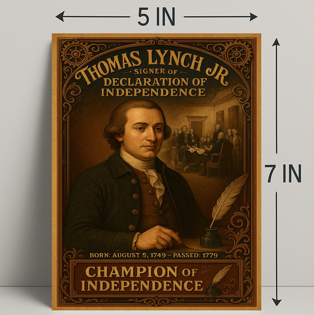 Historic details: Features period elements like a quill and inkwell, engraved-style border work, and commemorative text including birth and passing dates for Thomas Lynch Jr.