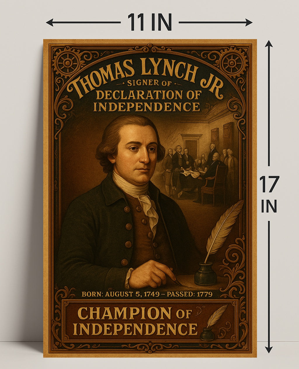Bring a piece of American history into your home with the Thomas Lynch Jr. Signer of the Declaration of Independence poster from PosterGoat. This museum-quality poster features a richly detailed, sepia-toned portrait framed by ornate, vintage-inspired borders, a historic assembly scene in the background, and classic typographic accents reading “Champion of Independence.” It’s a striking decorative artwork designed for lovers of history and refined interiors.