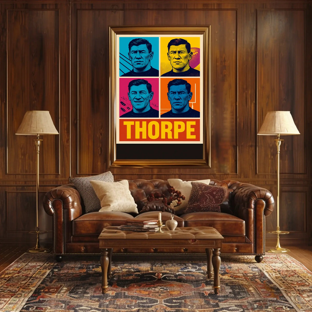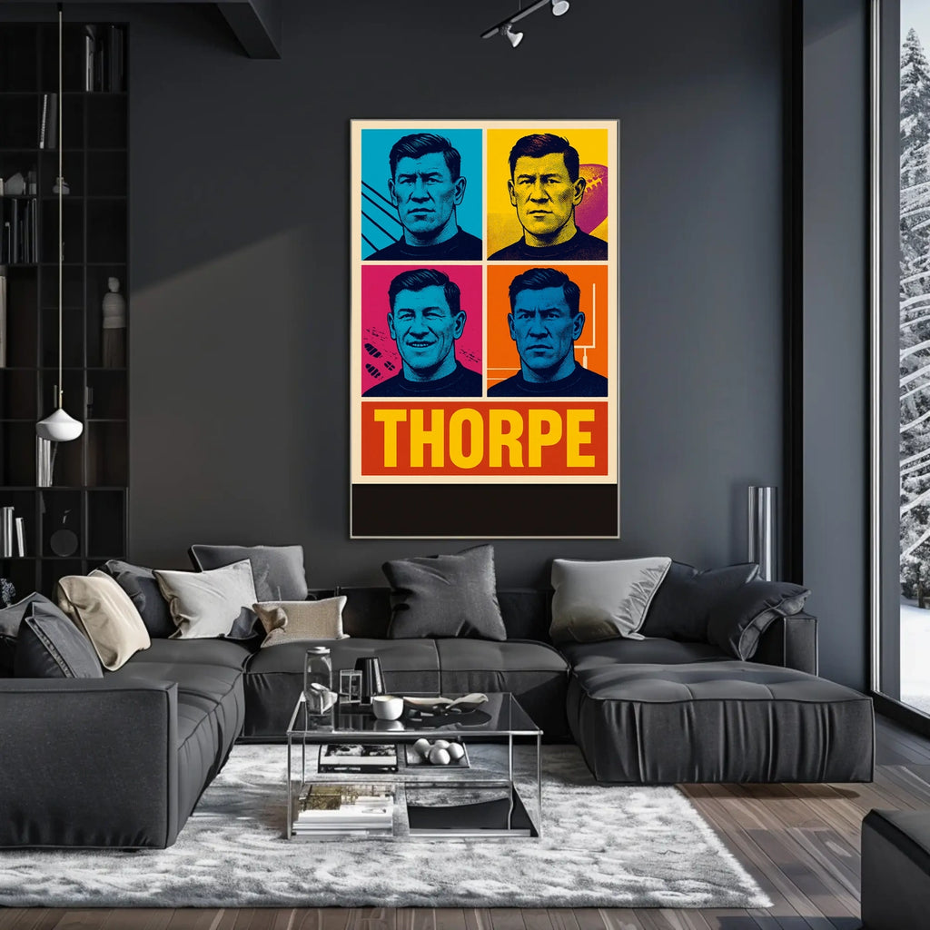 Celebrate the legendary Thorpe with this captivating pop-art style poster. Featuring a vivid color palette and dynamic portraits, it captures the essence of a multifaceted legacy and makes a bold statement in any room.