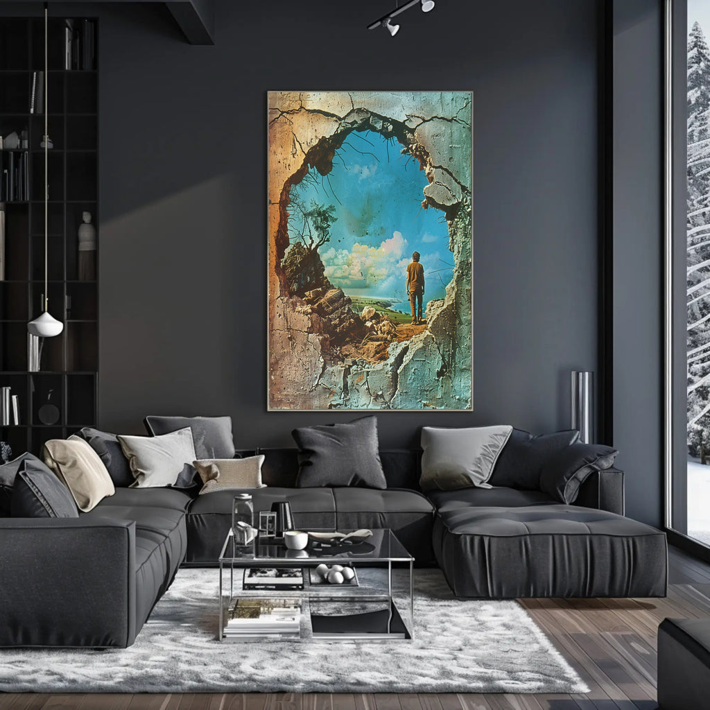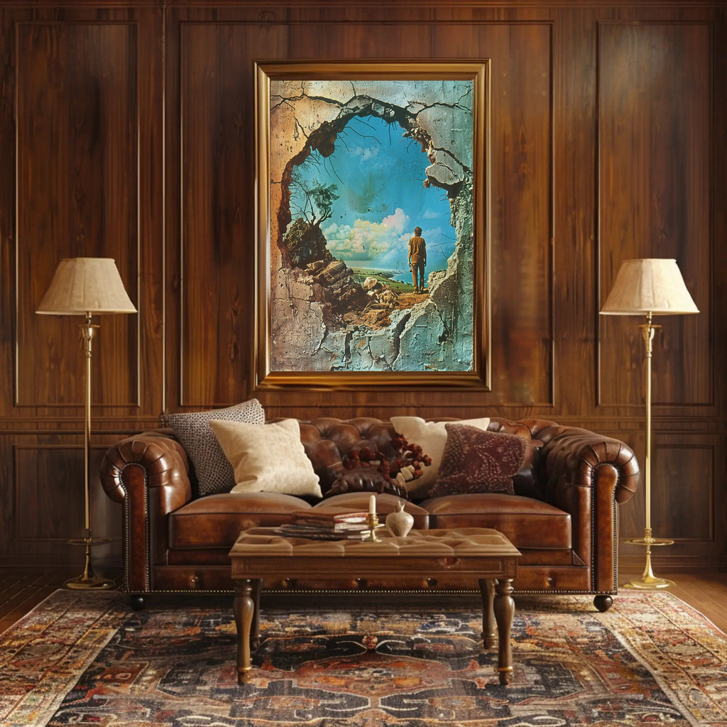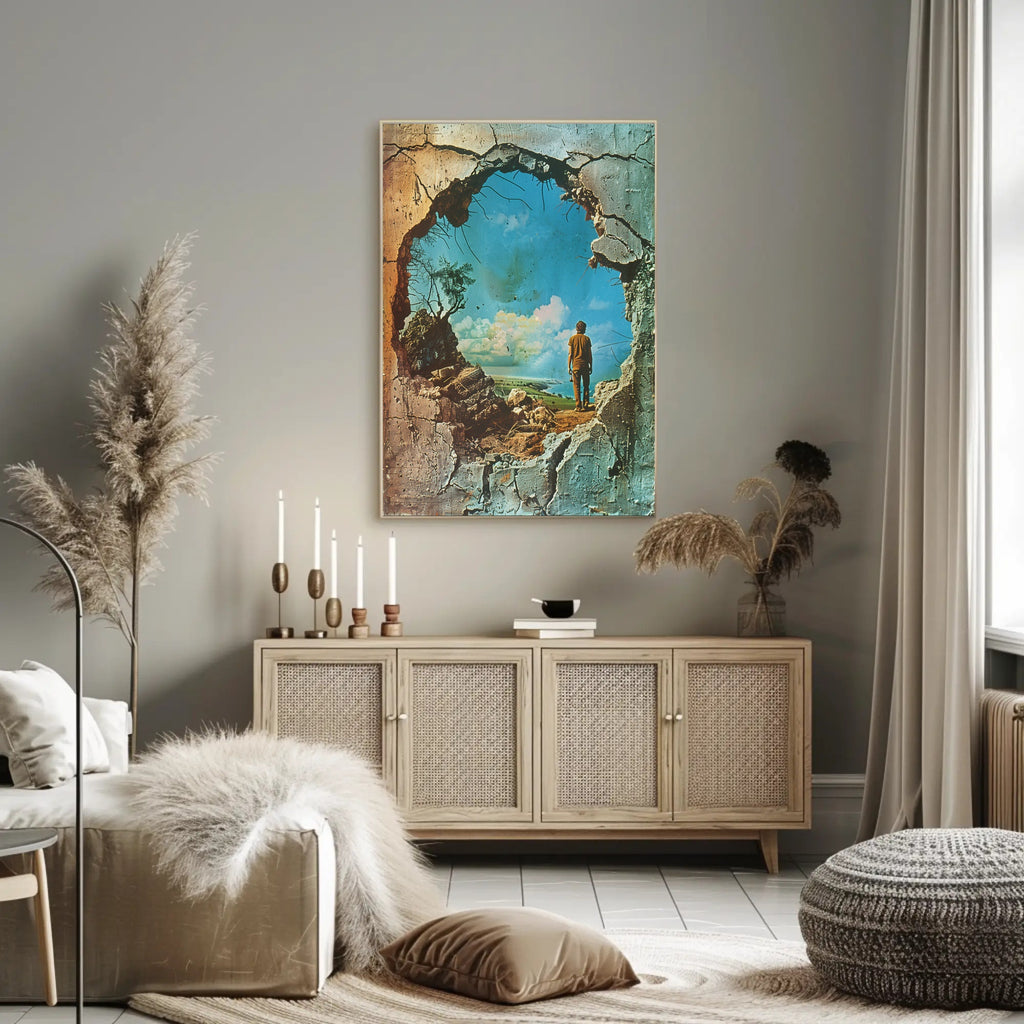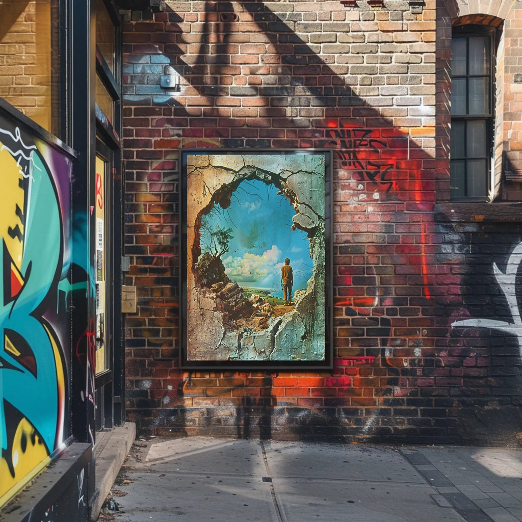 Bring a sense of discovery to your walls with the "Through The Cracks" Poster by PosterGoat — a striking art print that frames a panoramic world through a weathered, cracked concrete opening. This evocative poster blends rugged texture and serene landscape to create a minimalist yet deeply atmospheric focal point for any room.