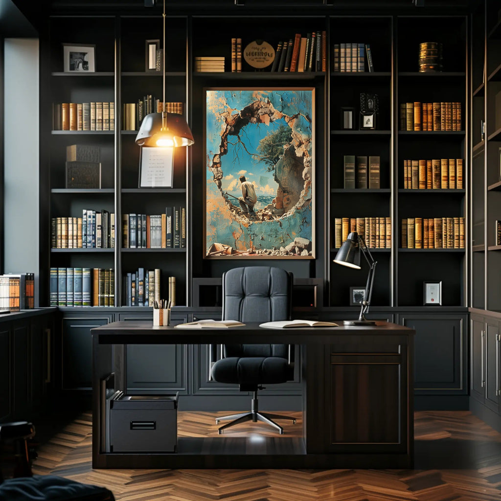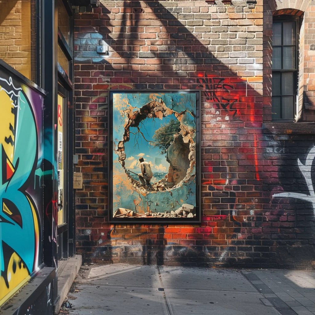 Bring a moment of discovery to your walls with the "Through The Crumbling Wall" poster from PosterGoat — a striking art print that fuses urban decay with expansive natural beauty. A large circular breach in a weathered blue plaster wall frames a serene sky, distant mountains and a lone figure kneeling with a hammer, creating a narrative of exploration, resilience and quiet wonder. This minimalist yet richly textured print makes a dramatic focal point for modern interiors, adventure decor and contemporary wall art collections.