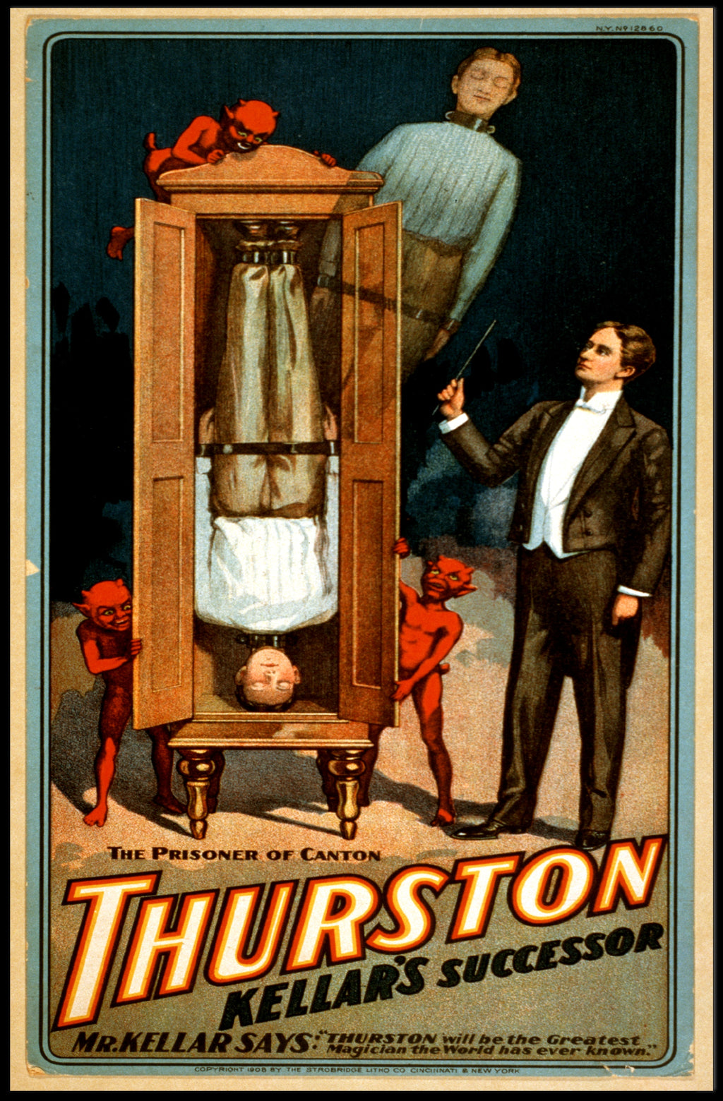 Step into the golden age of spectacle with the Thurston Magician Illusion Vintage Early 1900s Artistic Poster from PosterGoat — an arresting reproduction that brings classic magic show art to your home or collection. Richly illustrated with a dapper magician in full evening dress, an inverted prisoner trapped inside a wooden cabinet, and mischievous red imps peeking from the scene, this poster captures the drama and theatrical charm of early 20th-century performance posters.