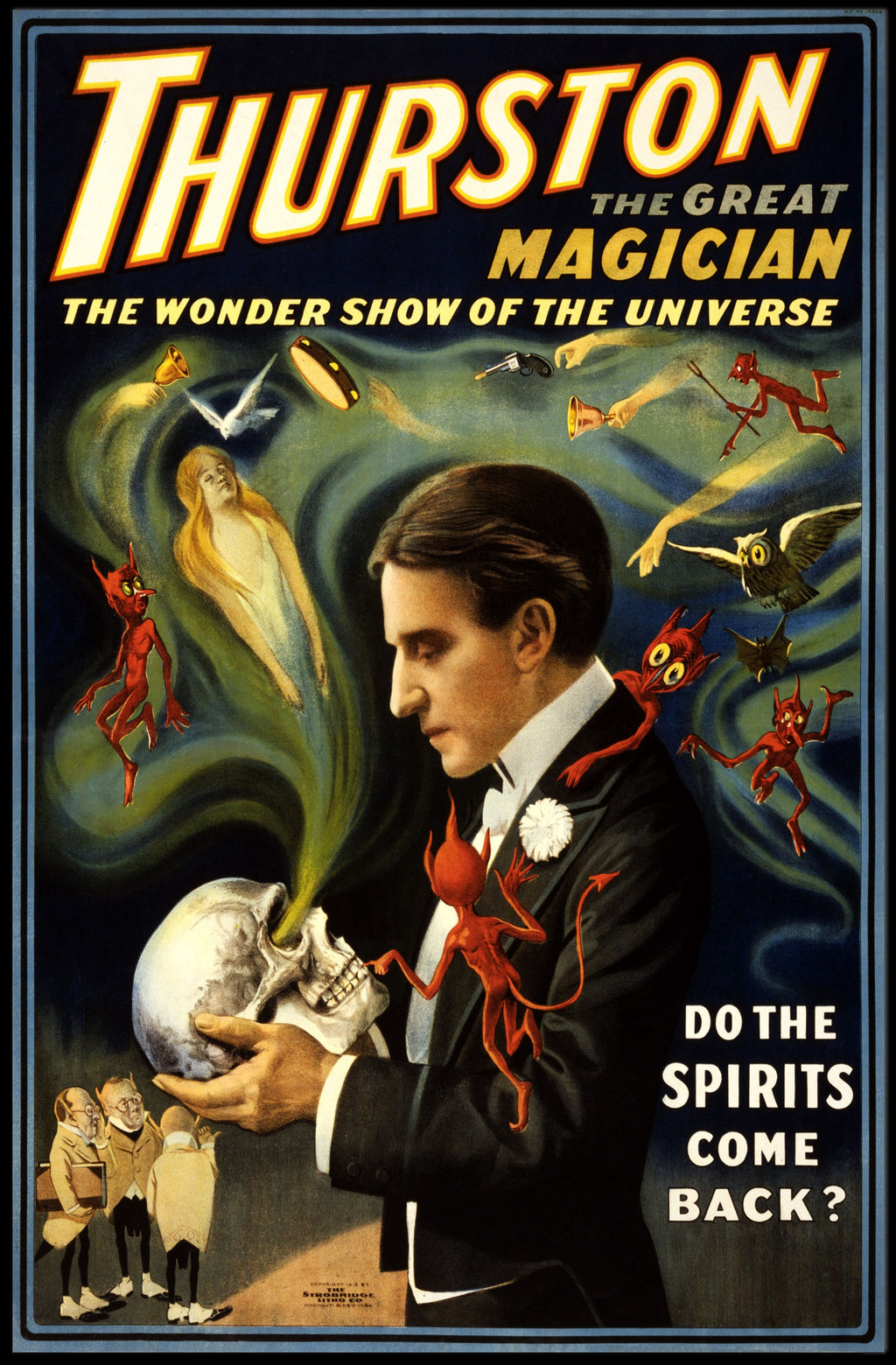 Immerse your space in theatrical nostalgia with the Thurston the Great Magician Historical and Cultural Poster from PosterGoat. This striking 18x24 vintage-style print recreates a classic magician's poster—bold "THURSTON" typography, a tuxedoed illusionist cradling a skull, and swirling spirits and mischievous red imps—bringing dramatic storytelling and historic charm to any wall.
