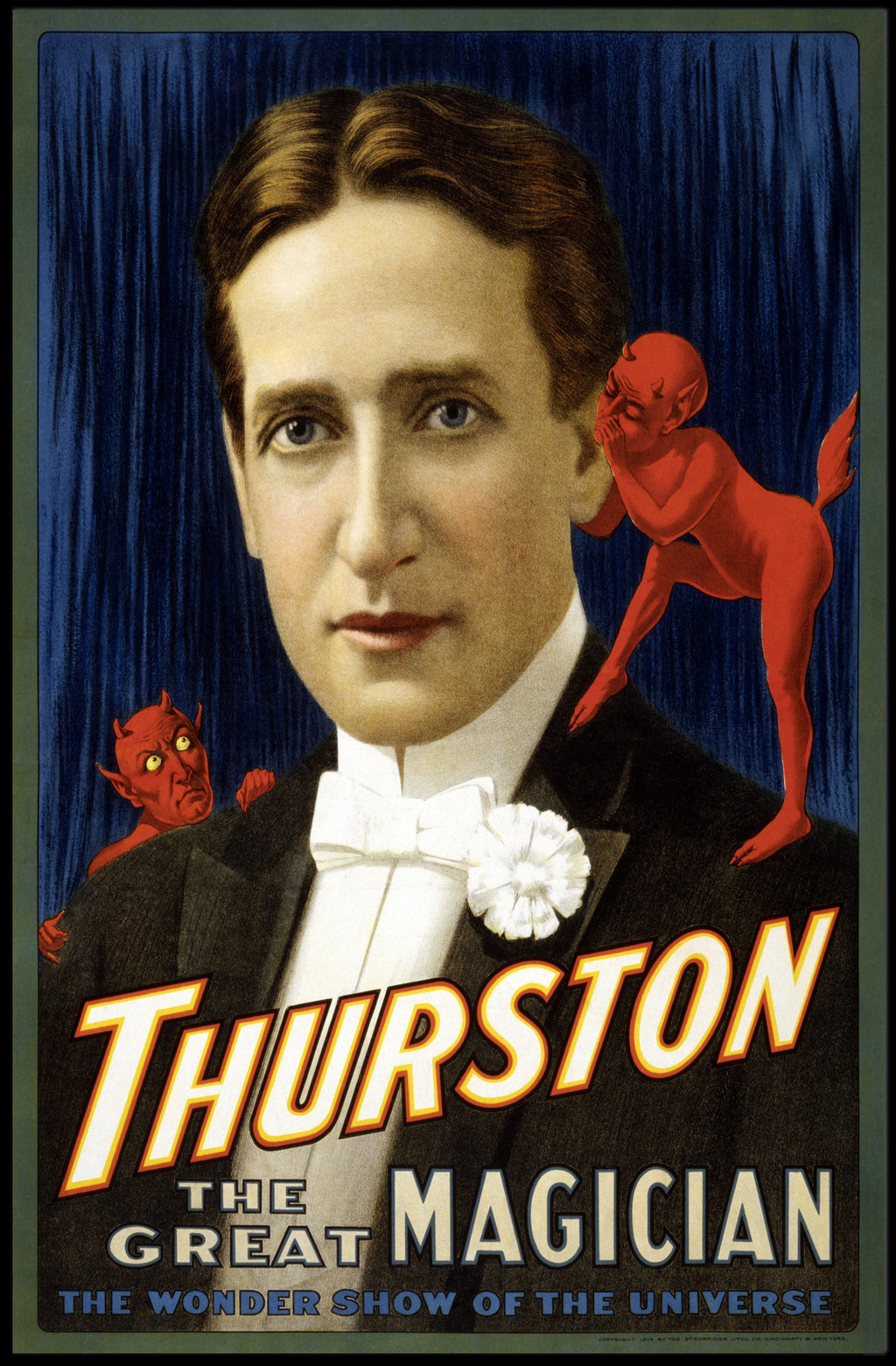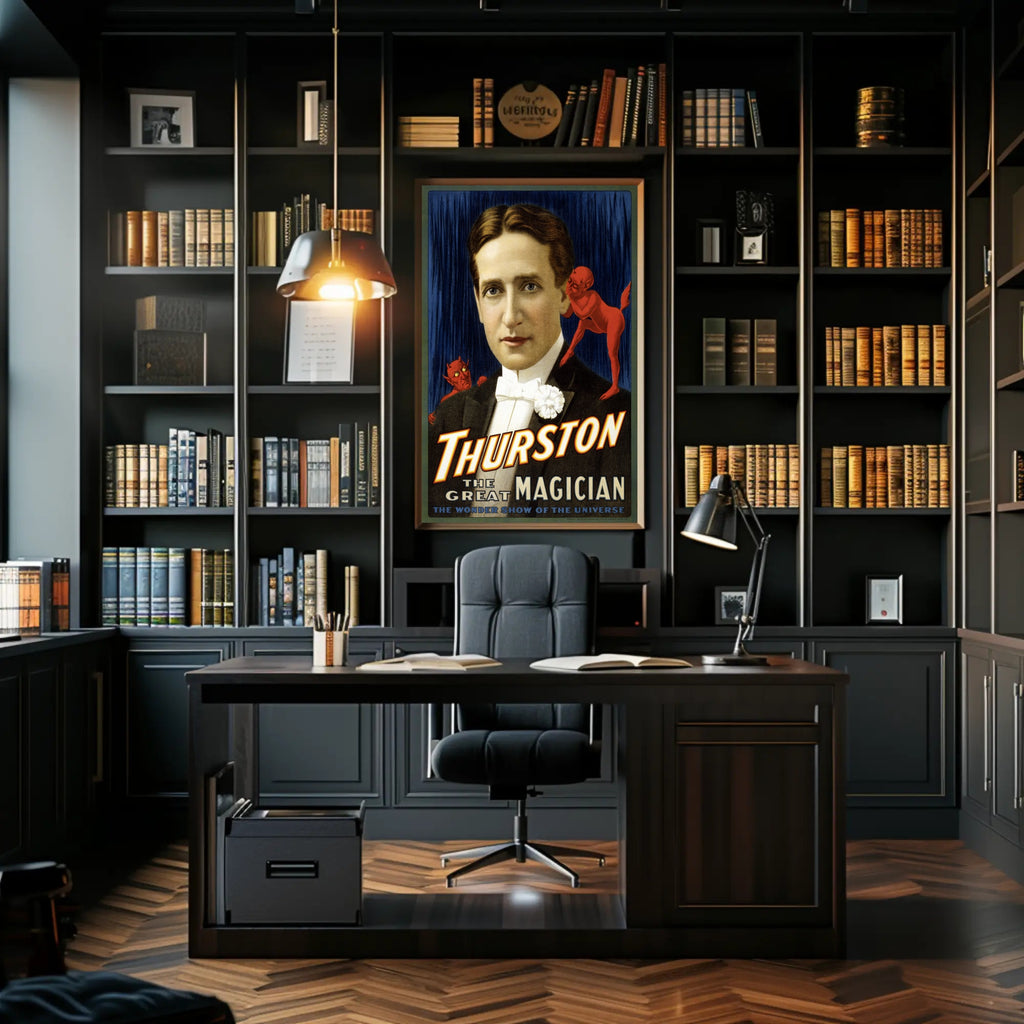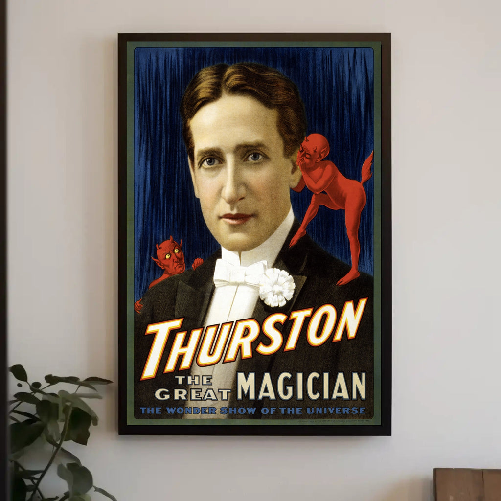 Bring the glamour and mystery of early 20th-century theatre into your space with the Thurston The Great Magician Vintage Entertainment Poster by PosterGoat. This richly detailed poster features a striking close-up portrait of Thurston in a sharp tuxedo and white carnation, set against a deep blue stage curtain and accented by mischievous red devils—an arresting composition that immediately commands attention.