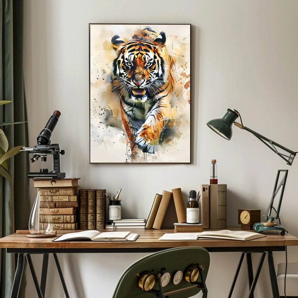 Bring untamed energy into your space with "Tiger in Motion: Bold Artistic Animal Poster" from PosterGoat — a modern poster that fuses fierce realism with expressive watercolor splashes. This striking artwork captures a majestic tiger mid-stride, its piercing eyes and dynamic posture leaping off the page and commanding attention in any room.