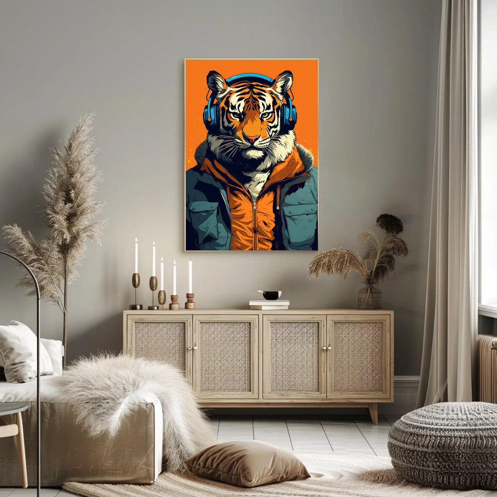 Tiger in Street Style Pop Culture Poster — a bold, modern print from PosterGoat that fuses pop art energy with urban fashion. This stylized tiger wears oversized headphones and a bright orange puffy jacket under a teal coat, set against an intense orange backdrop that commands attention and energizes any room.
