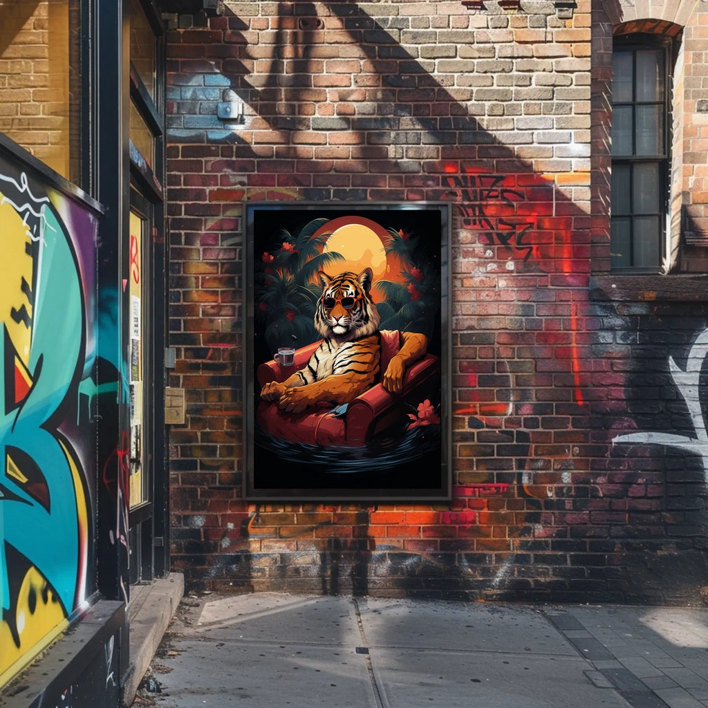 Step into a vibrant, relaxing tropical escape with the Tiger Lounges in Armchair Tropical Jungle Animal Poster. This striking wall art features a majestic tiger lazily reclining in a classic armchair, enveloped by lush greenery of palm trees and vivid hibiscus blooms. The large, setting sun imbues the scene with a warmth that echoes a perfect, serene ending to a day in paradise.