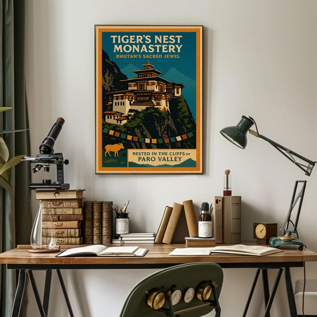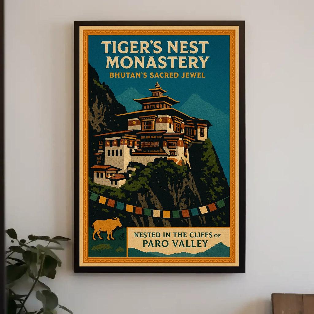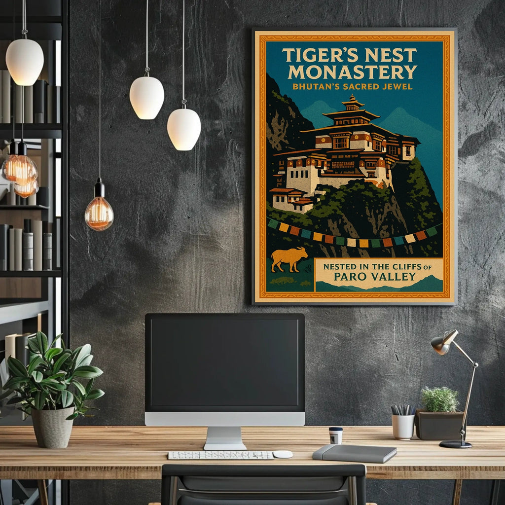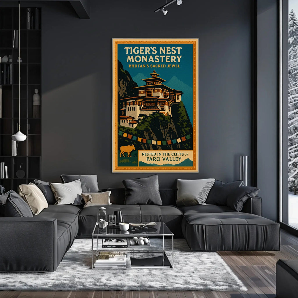 - Striking Bhutanese scenery — A dramatic rendering of Tigers Nest Monastery that adds depth, awe, and a sense of adventure to any wall.