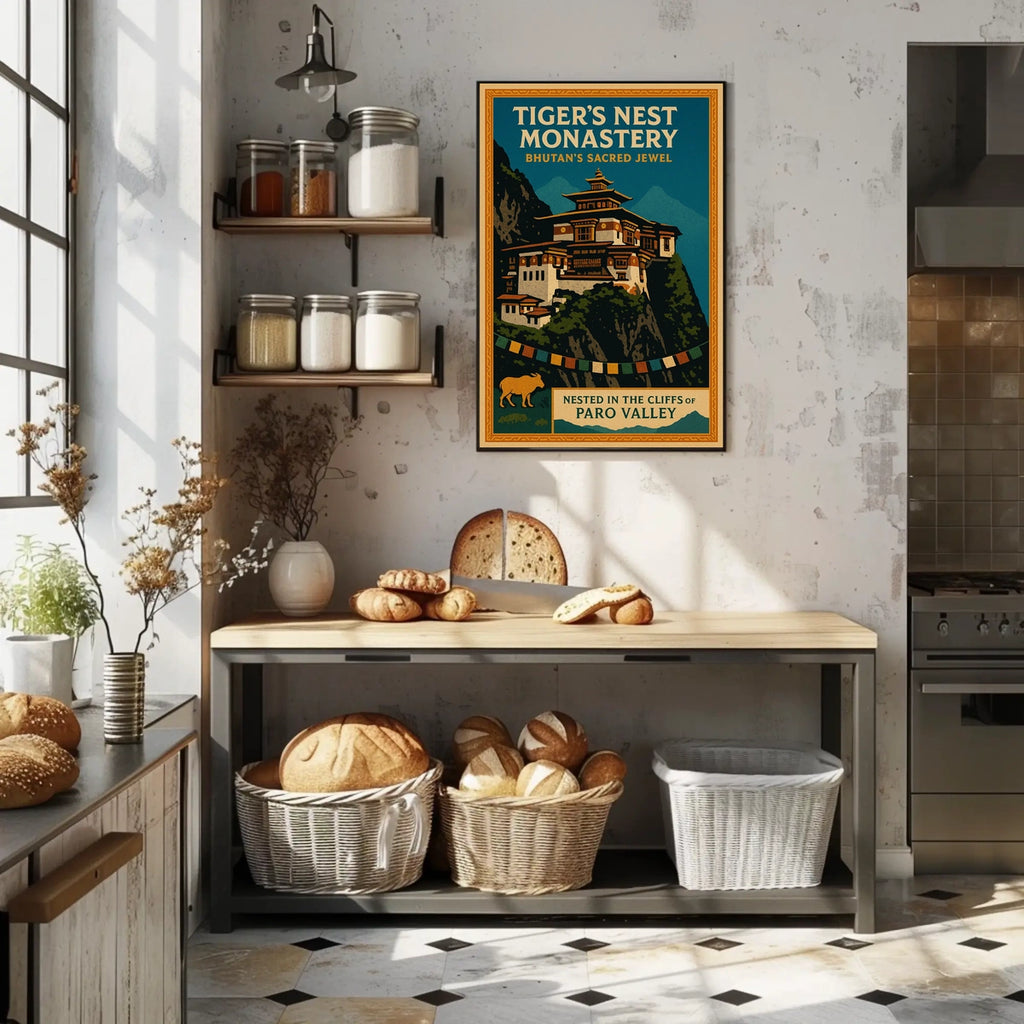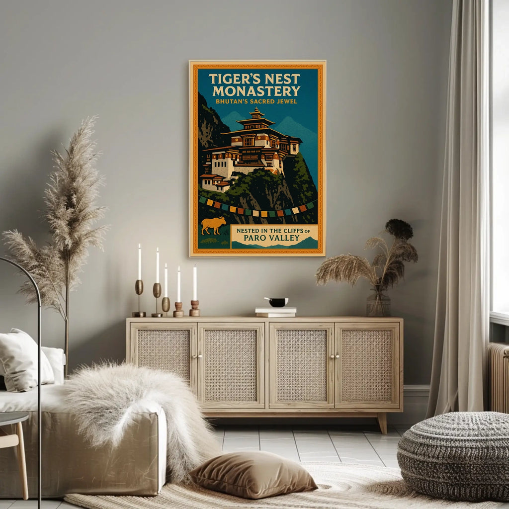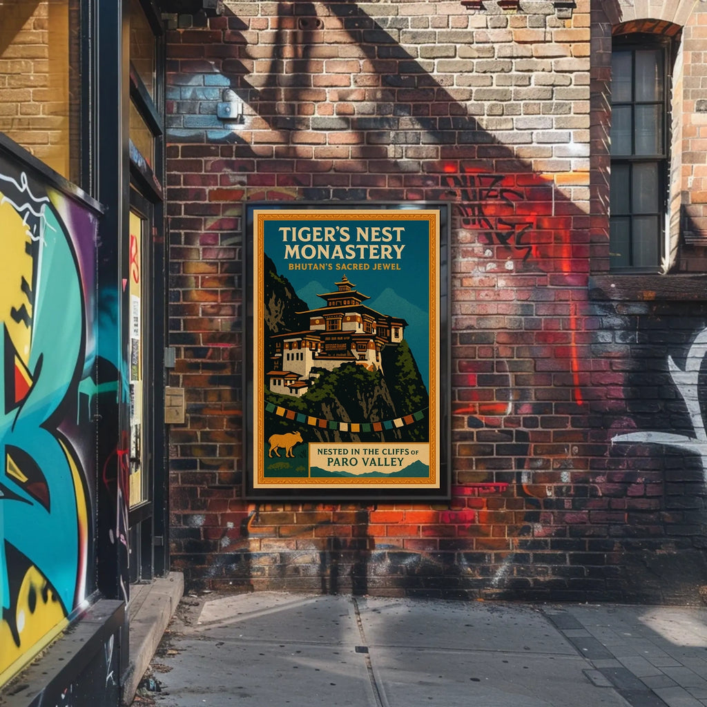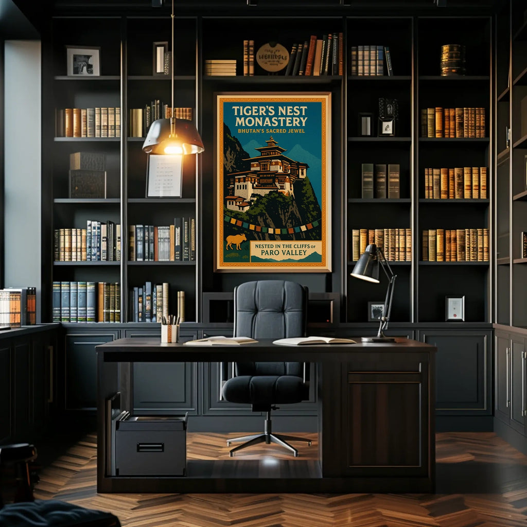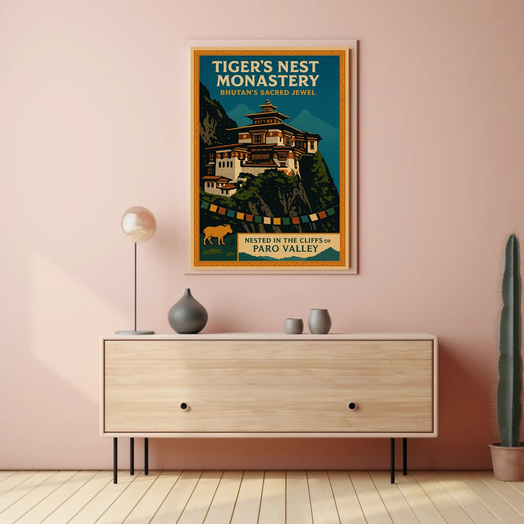 - Striking Bhutanese scenery — A dramatic rendering of Tigers Nest Monastery that adds depth, awe, and a sense of adventure to any wall.