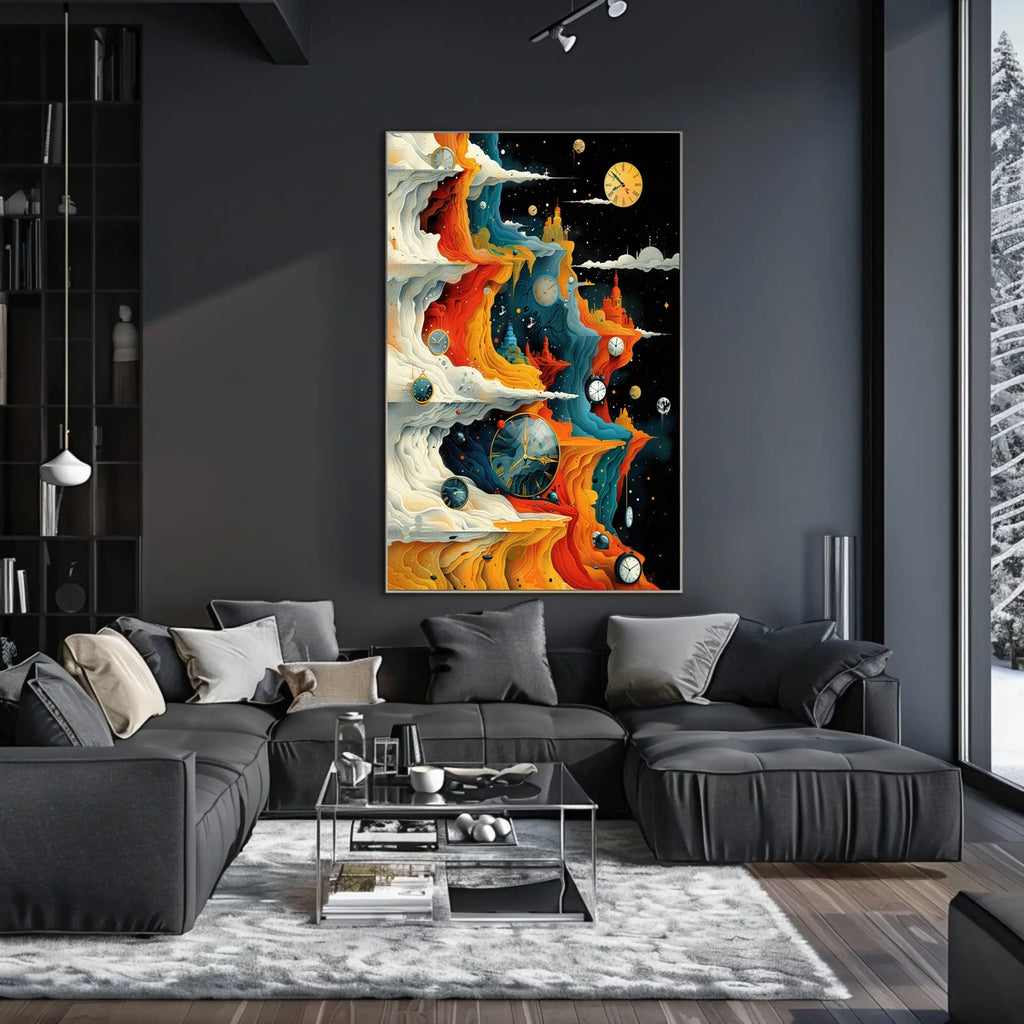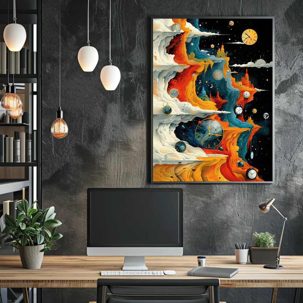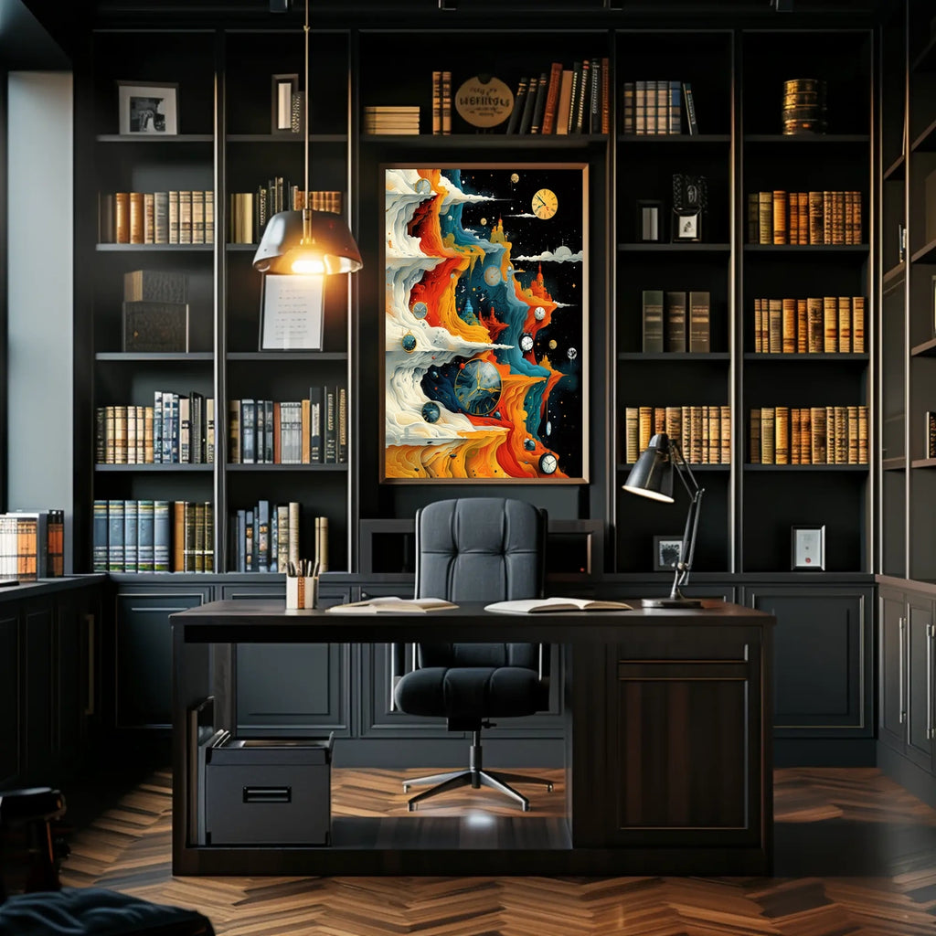 Timeless Horizons offers a captivating escape into imagination and a sophisticated centerpiece for any room. Embrace time, space, and wonder—add this artwork to your collection today and elevate your space. Shop now to transform your environment.