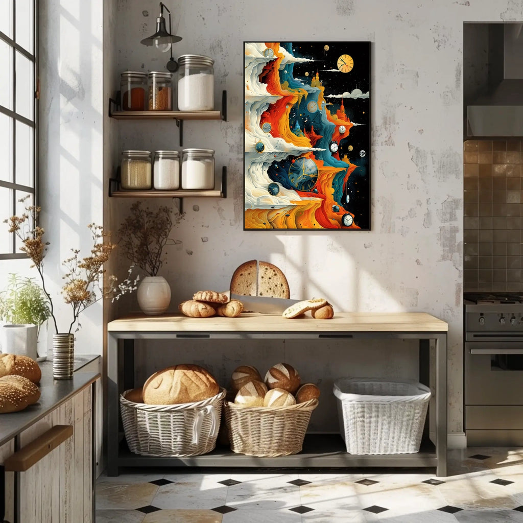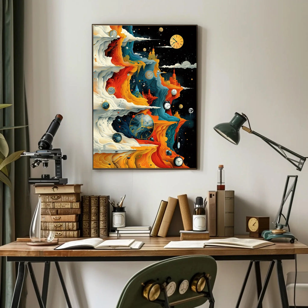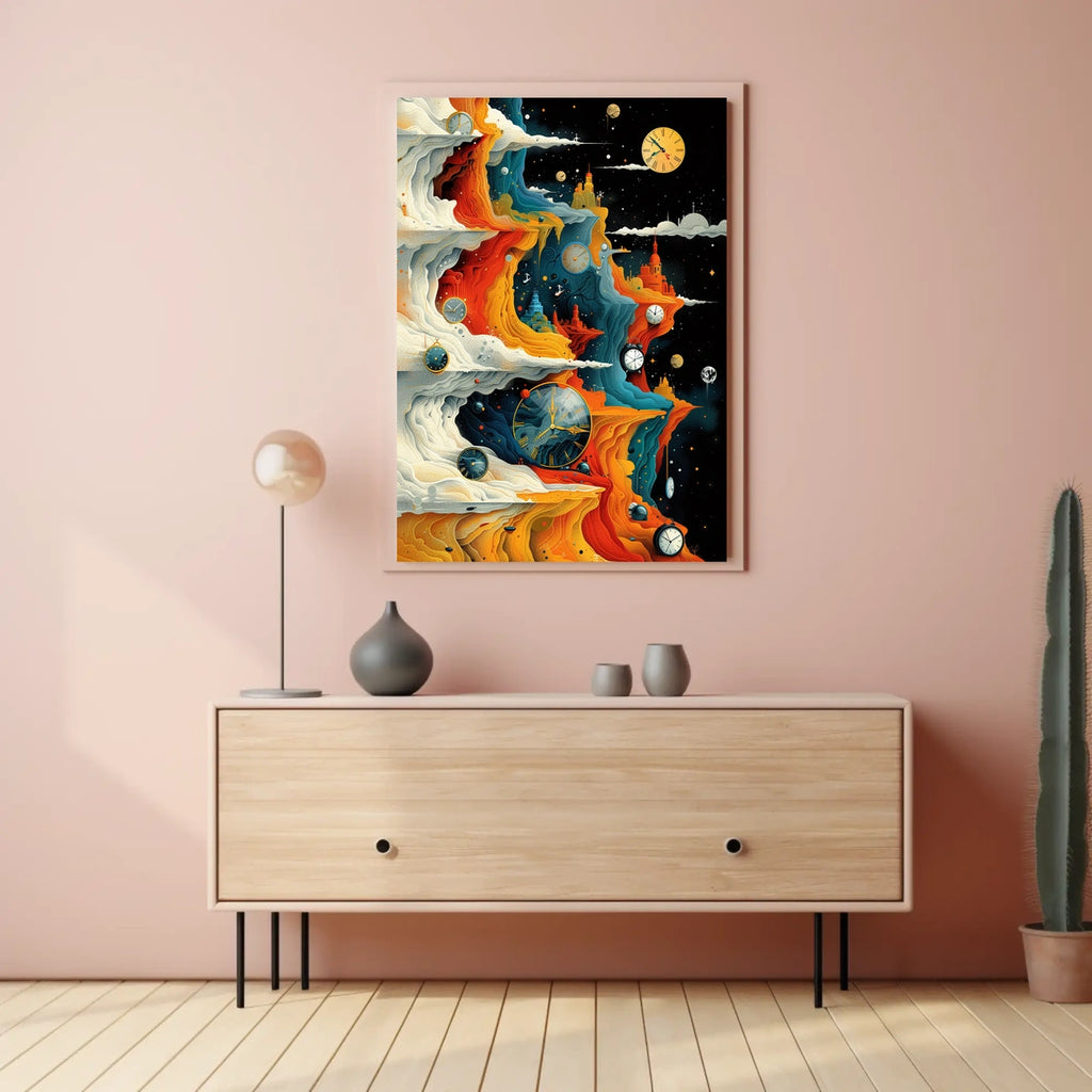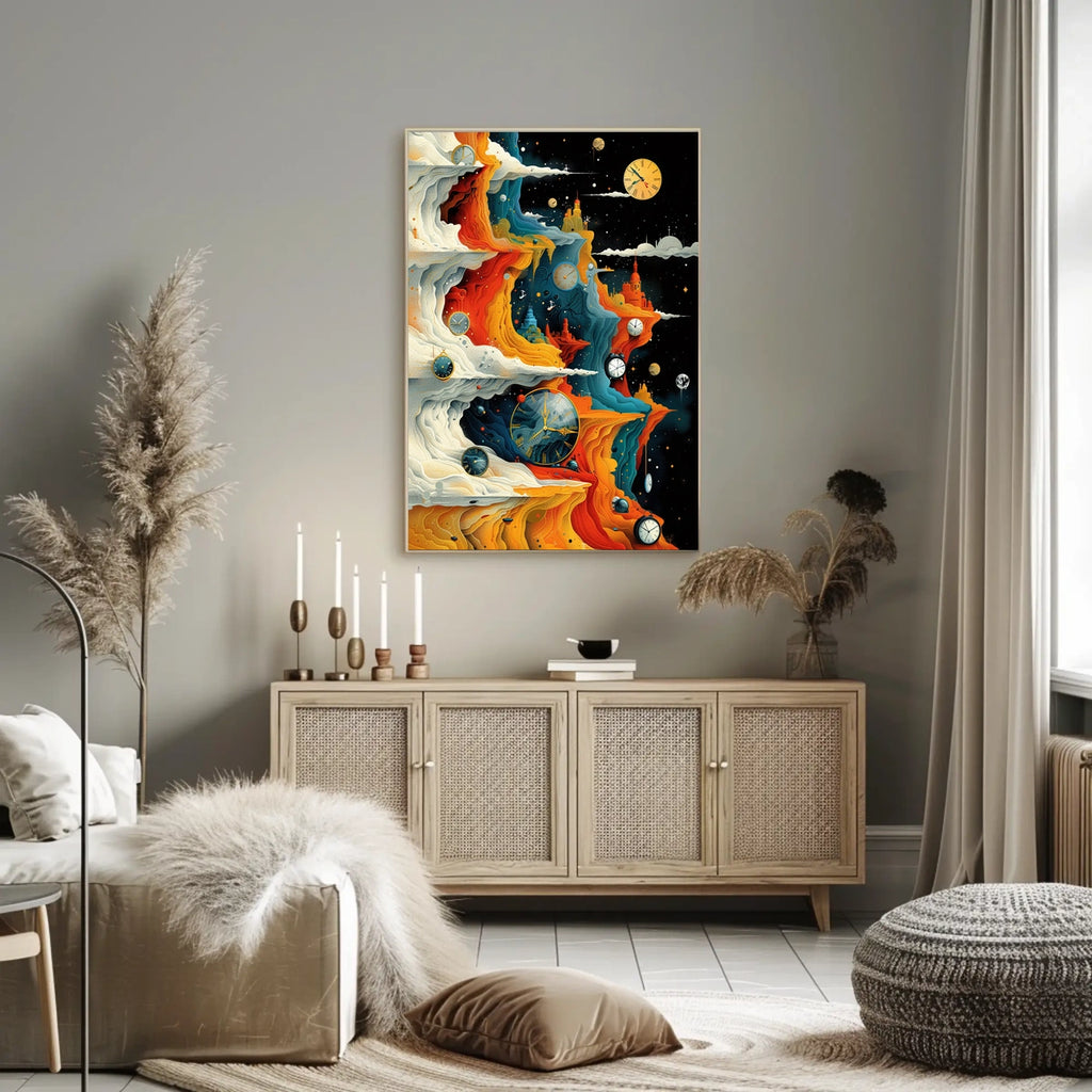 Timeless Horizons offers a captivating escape into imagination and a sophisticated centerpiece for any room. Embrace time, space, and wonder—add this artwork to your collection today and elevate your space. Shop now to transform your environment.