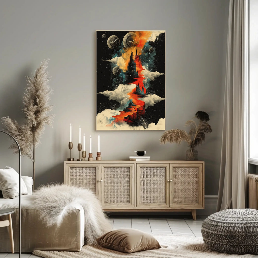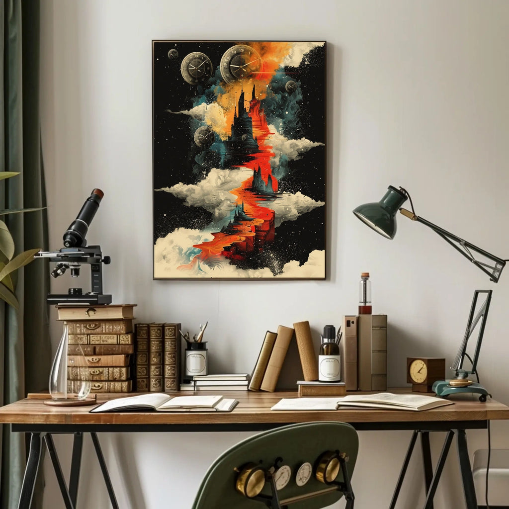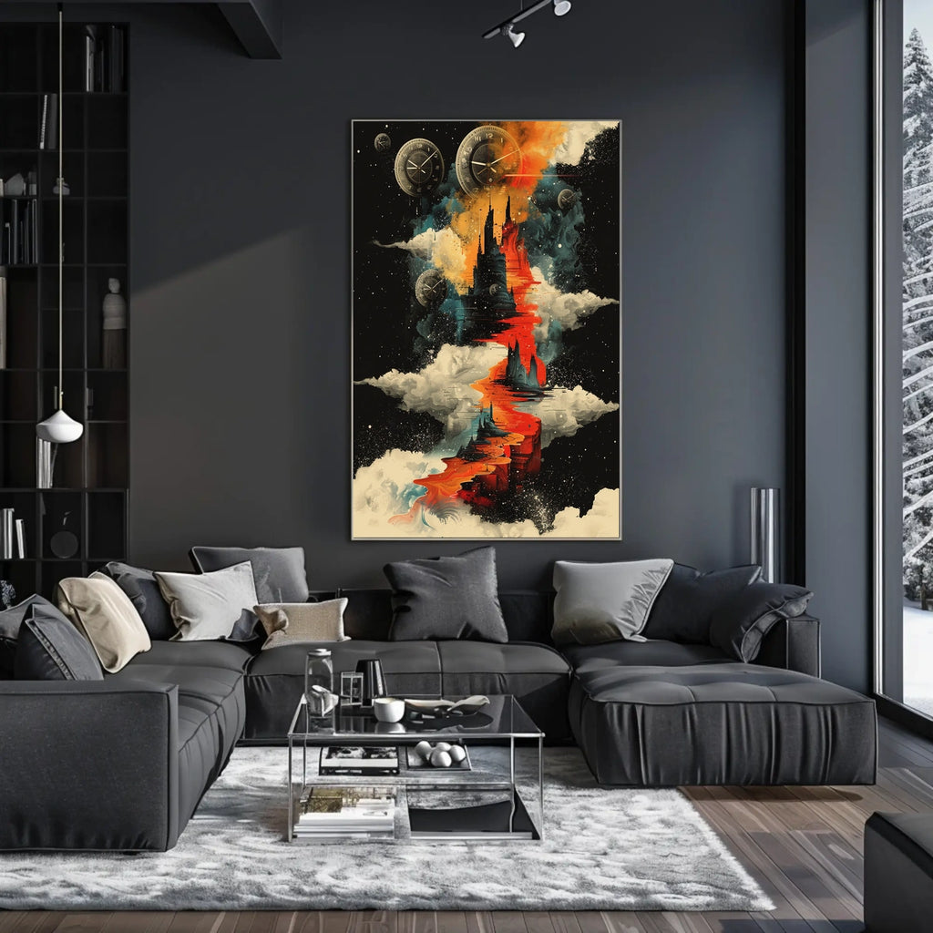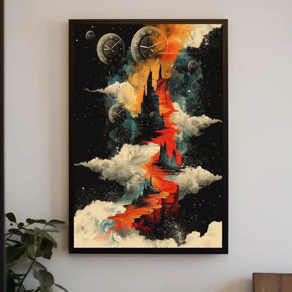 Intro: Timeless Journey invites you into a surreal realm where time and space converge in a mesmerizing dance. This captivating artwork features floating clocks and ethereal castles rising from a vivid, dreamlike landscape, where clouds meet cosmic elements to craft a mystical, conversation-starting centerpiece for any room.