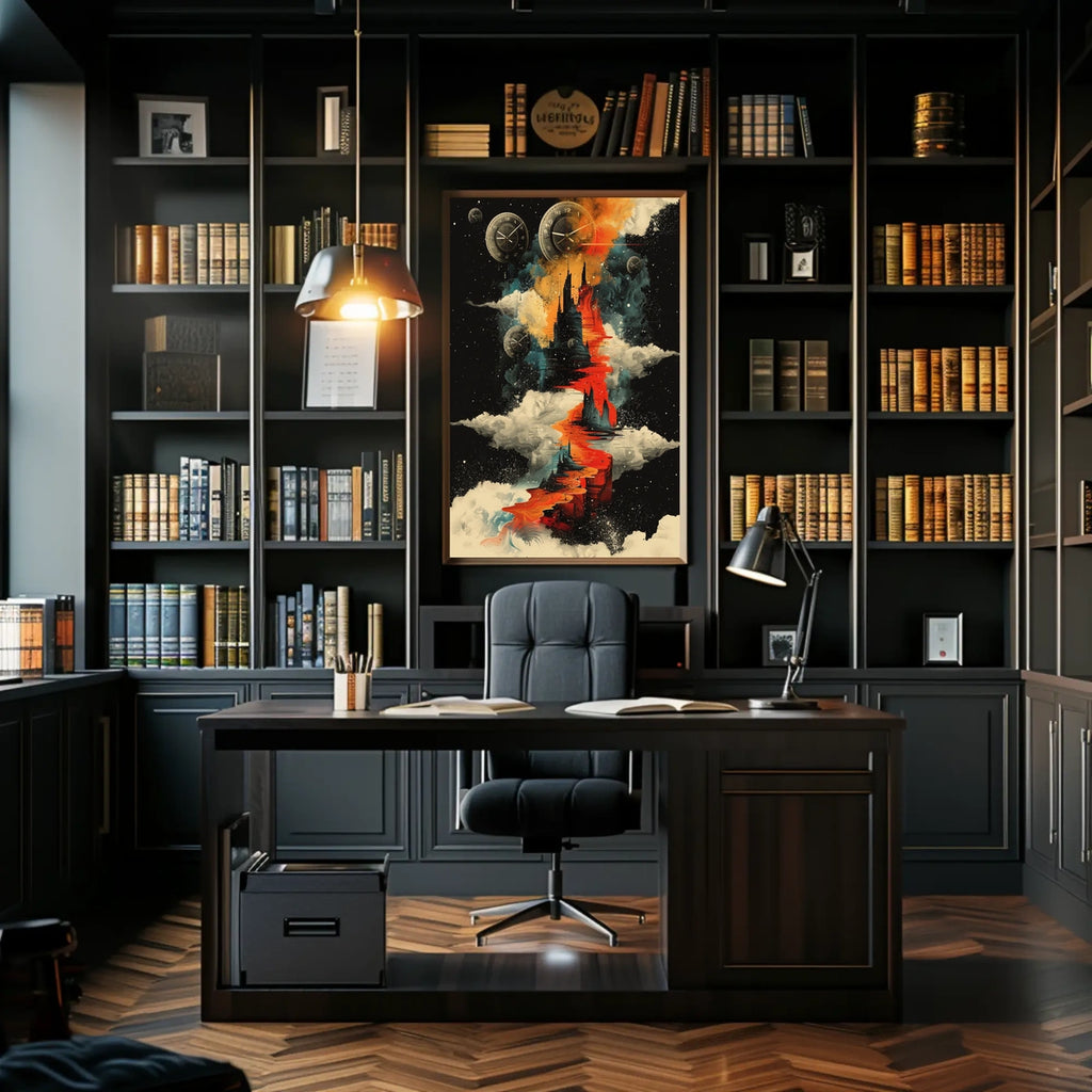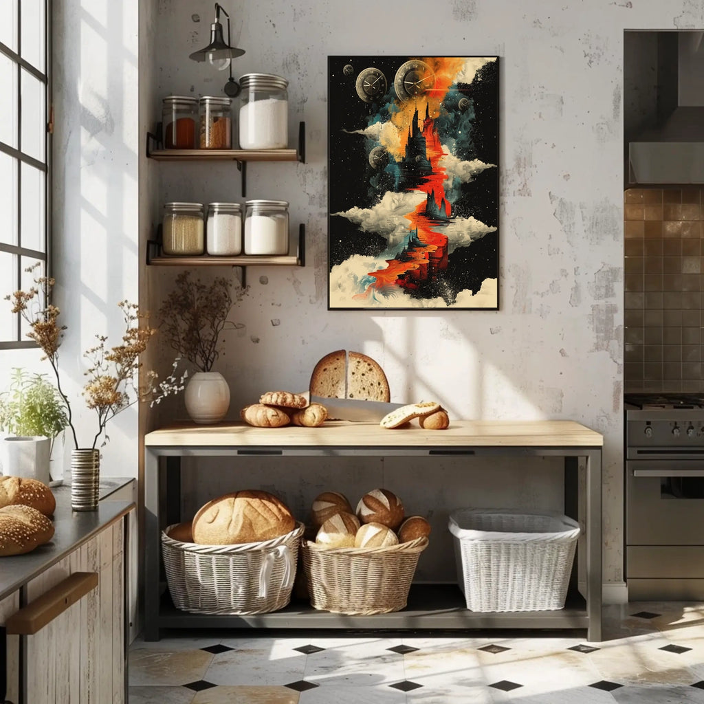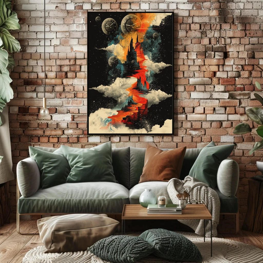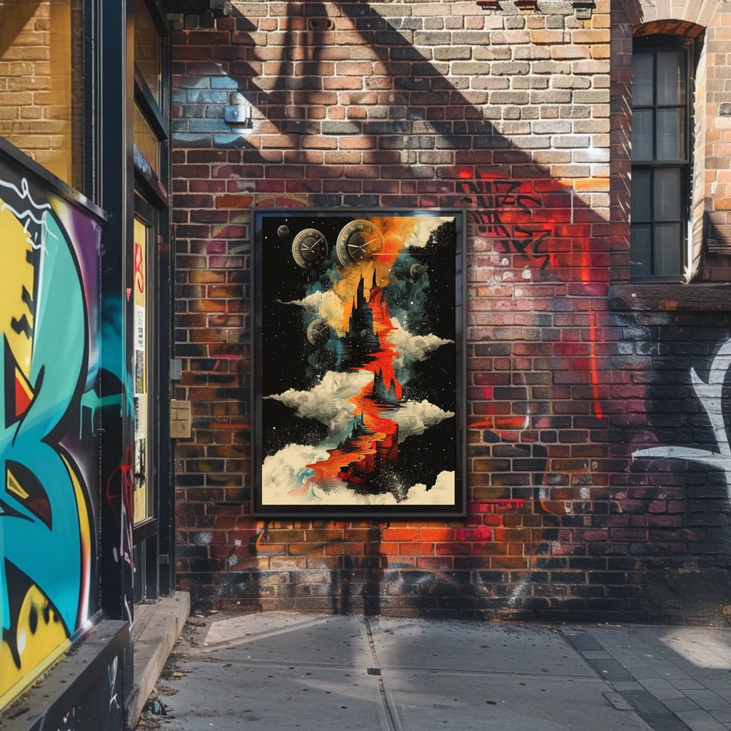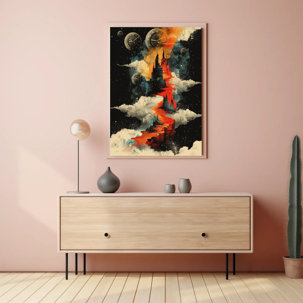 Intro: Timeless Journey invites you into a surreal realm where time and space converge in a mesmerizing dance. This captivating artwork features floating clocks and ethereal castles rising from a vivid, dreamlike landscape, where clouds meet cosmic elements to craft a mystical, conversation-starting centerpiece for any room.