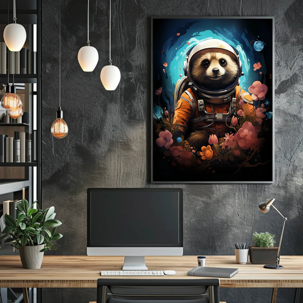 Introducing Title Cosmic Explorer: The Astronaut Raccoon Poster — a bold art print that blends cosmic wonder with playful storytelling. A fearless raccoon in a space suit glides through a nebula, delivering striking style and whimsy to your living or working space.