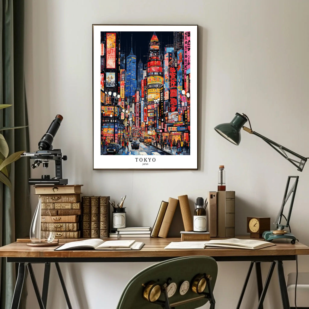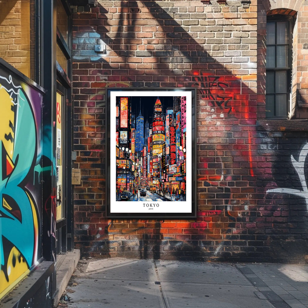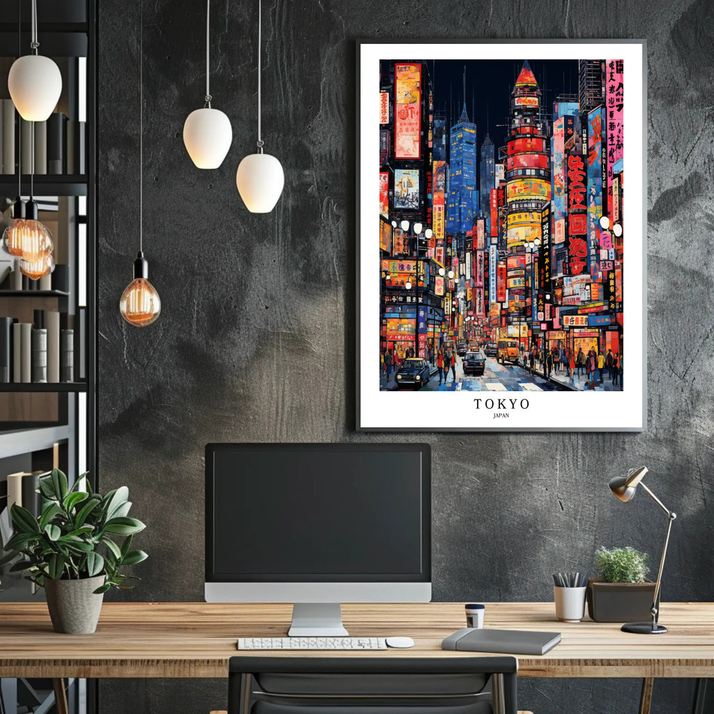 Immerse your space in the electric energy of Tokyo Nights — a vibrant cityscape poster from PosterGoat that turns any wall into a window on late‑night urban life. This art print captures the neon-lit avenues, layered signage, and bustling streets of Tokyo with bold color, crisp detail, and a minimalist white border that frames the scene for a modern, gallery-ready look.