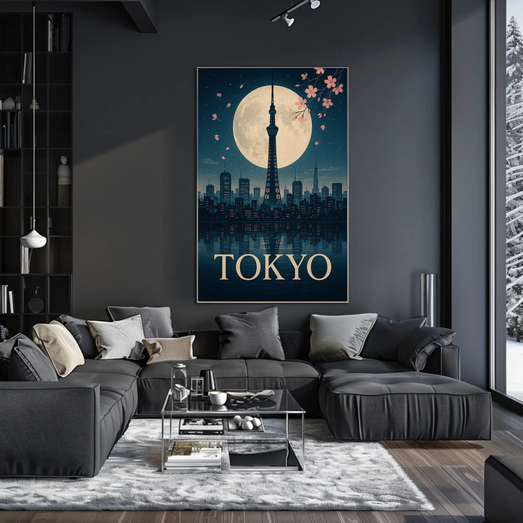 High-impact focal point: Large, bold "TOKYO" lettering and a dramatic skyline silhouette deliver museum-quality presence at an accessible price.