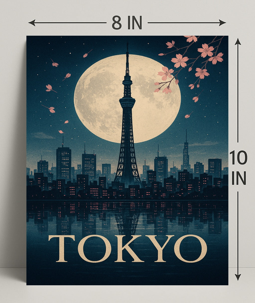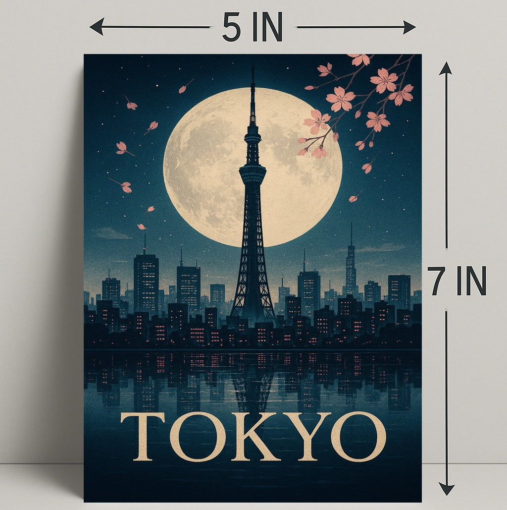 Capture the magic of Japan's capital with the Tokyo Nightscape Poster from PosterGoat — a minimalist travel-inspired artwork that brings moonlit serenity and urban energy to any room. This striking poster features an oversized full moon behind Tokyo's iconic tower, delicate cherry blossoms drifting across a starry sky, and a perfect mirrored reflection on calm water — an elegant focal point for living rooms, bedrooms, offices, or gallery-style walls.