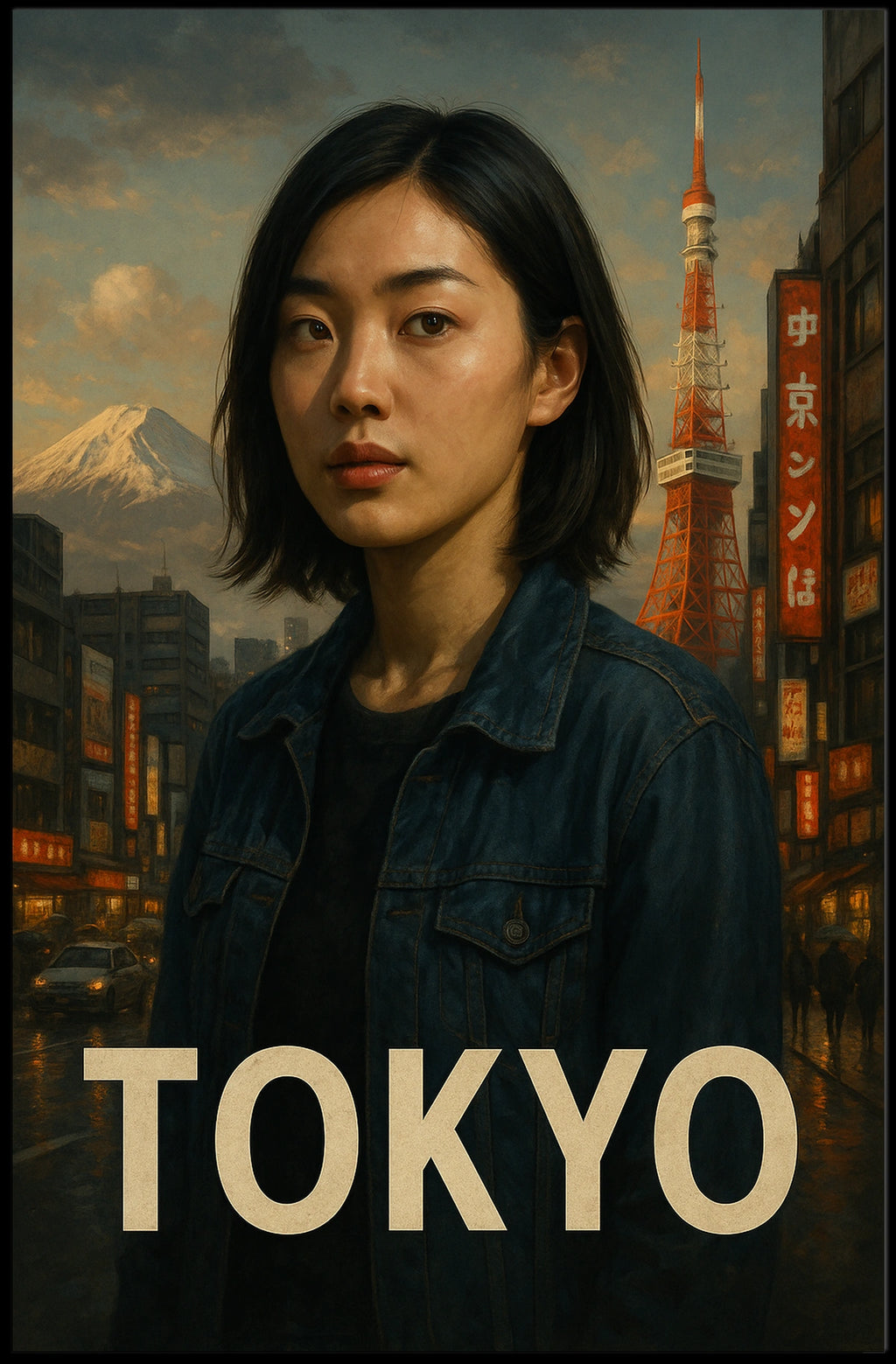 - Detailed design highlighting Tokyo's neon-lit skyline and street-level charm