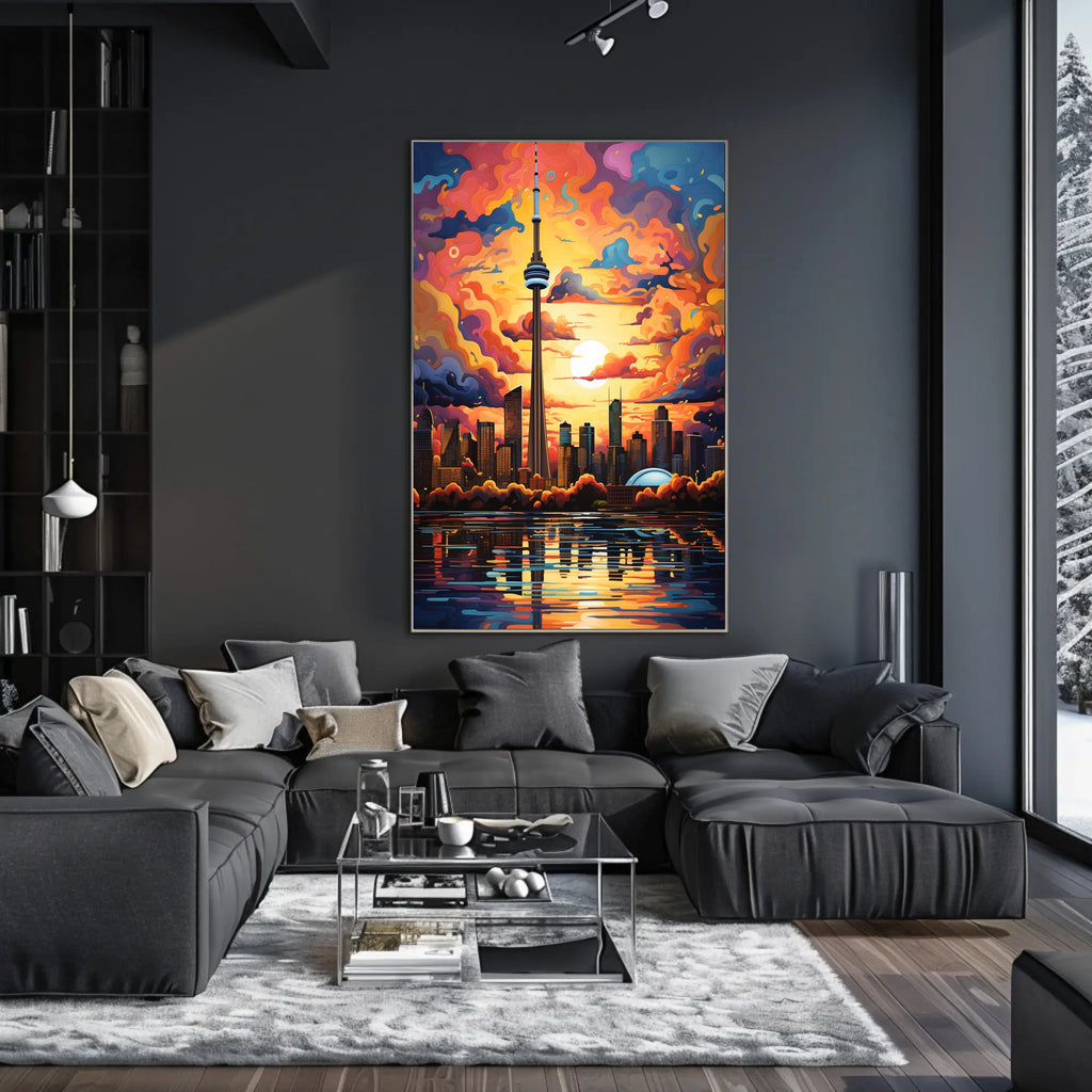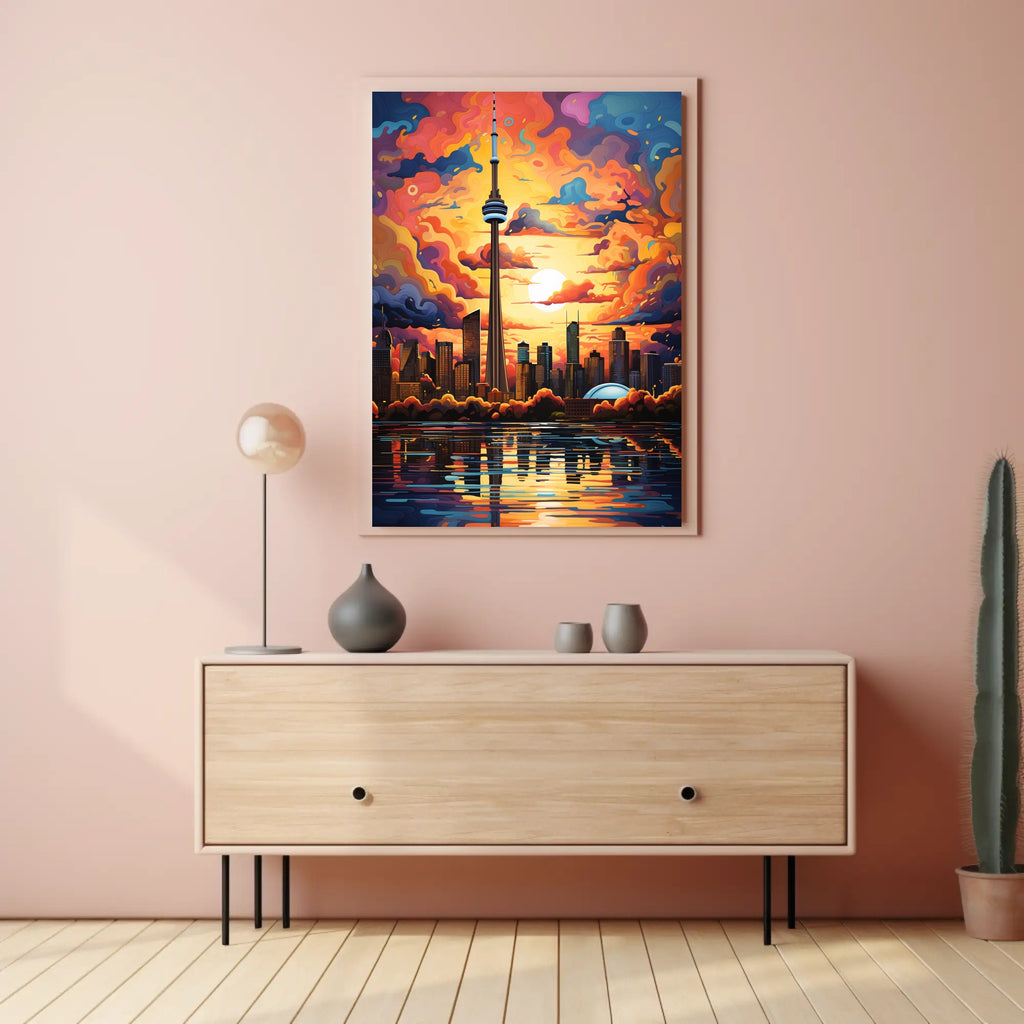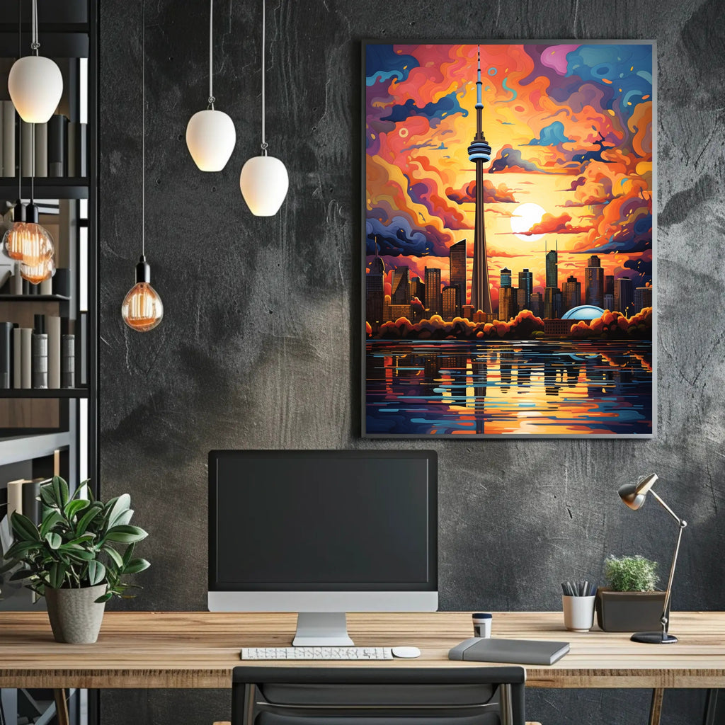 Why choose this poster? Its cinematic sunset palette and stylized, almost tactile brush-like forms make it more than decor — it’s a conversation piece and a daily reminder of Toronto’s energy and charm.