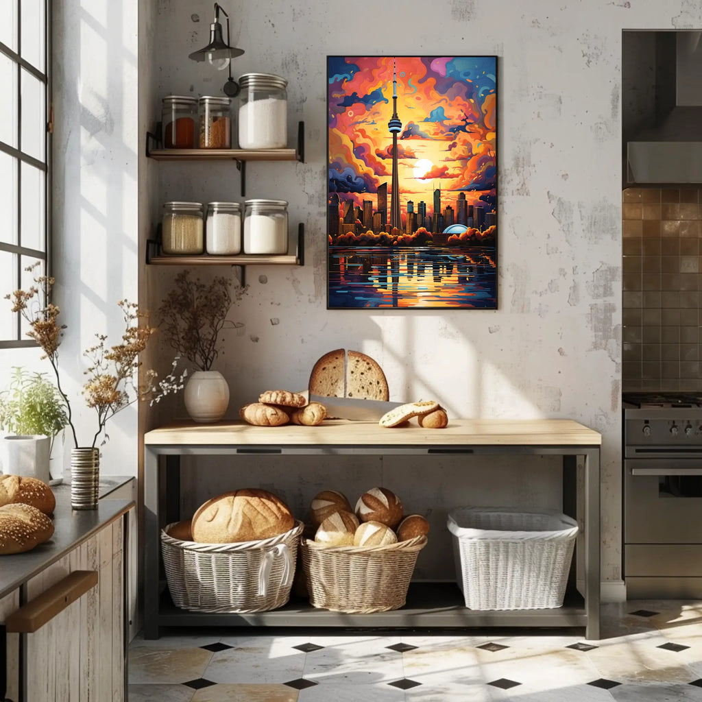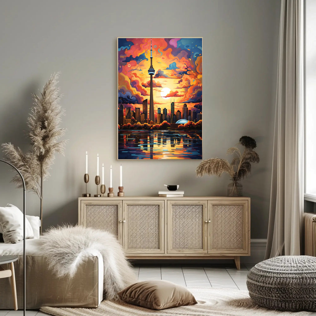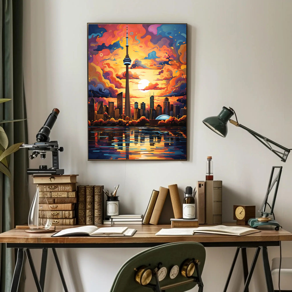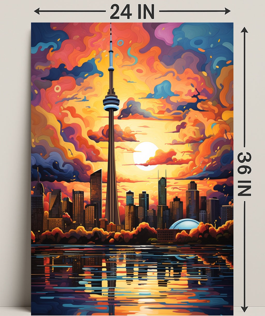 Why choose this poster? Its cinematic sunset palette and stylized, almost tactile brush-like forms make it more than decor — it’s a conversation piece and a daily reminder of Toronto’s energy and charm.