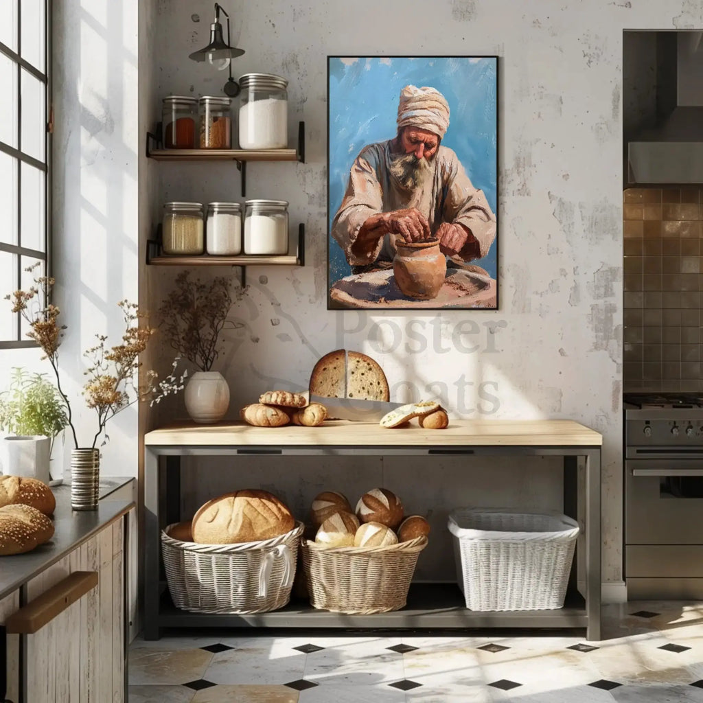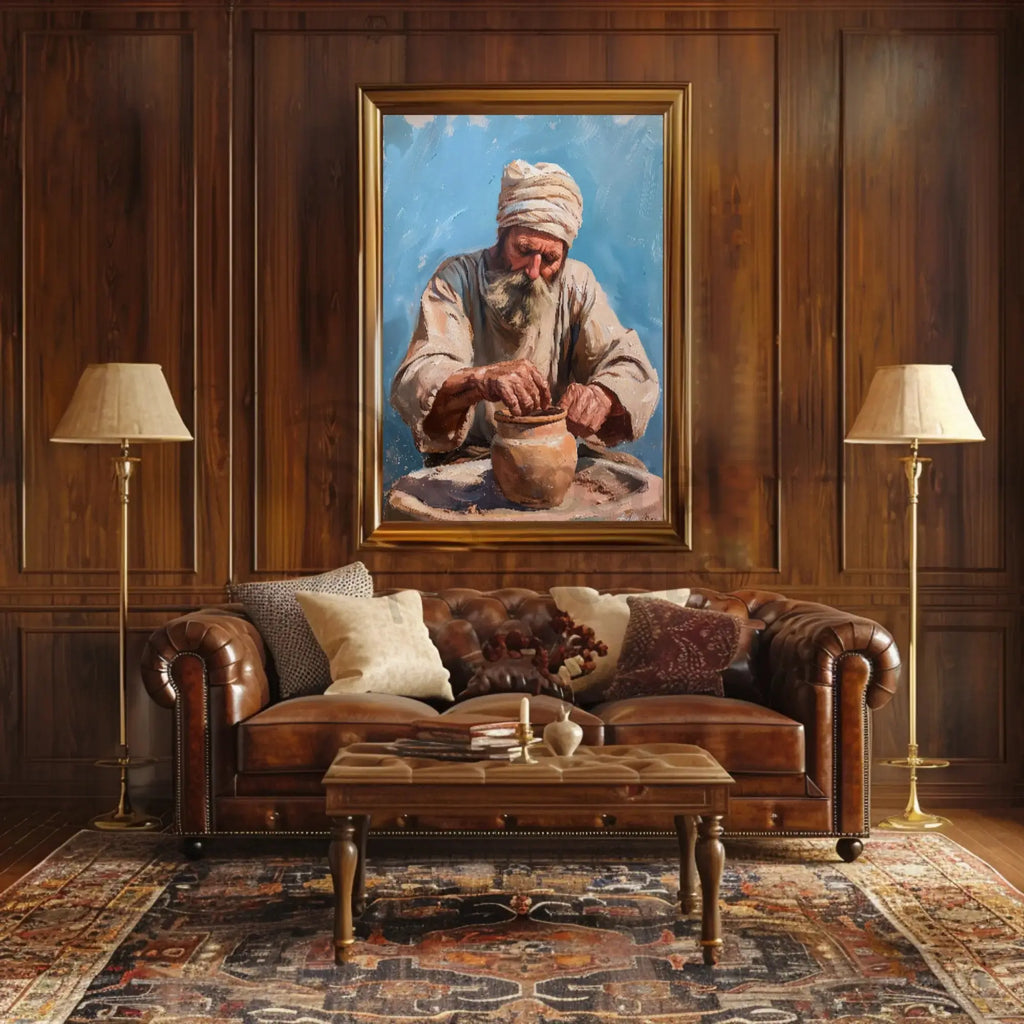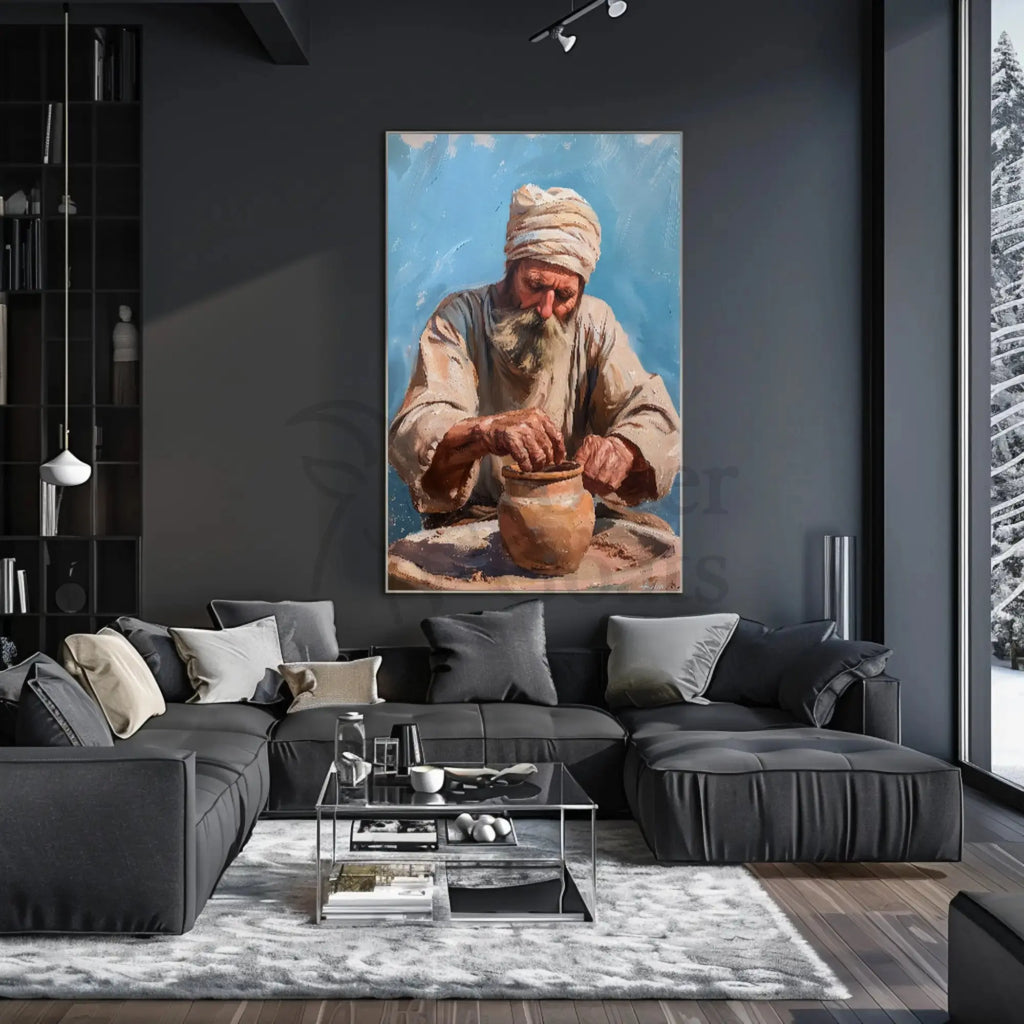 Rendered in earthy tones against a serene blue background, this artwork focuses on a contemplative artisan at his wheel: a weathered, bearded potter shaping a humble vessel with practiced hands. The painterly brushwork and lifelike texture deliver a realistic style that brings traditional artisanship to life and adds depth to any interior.