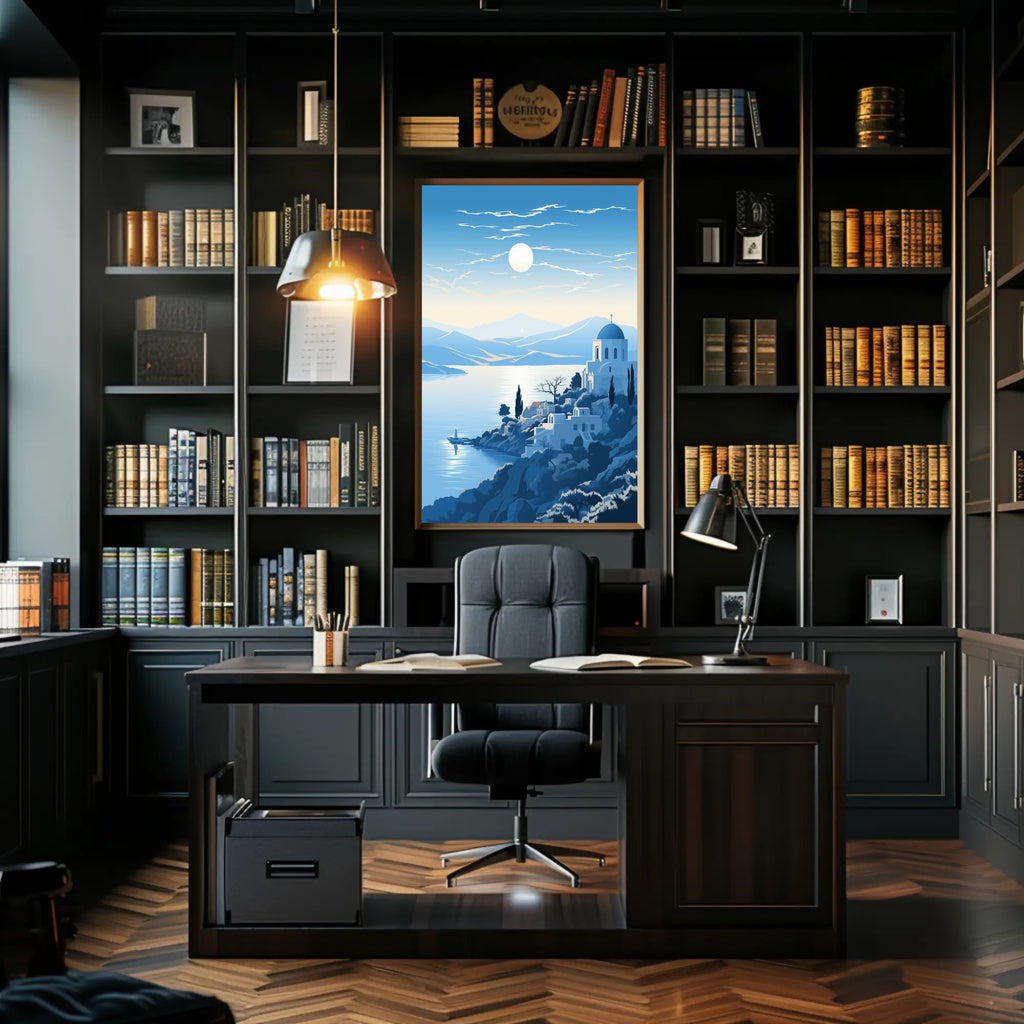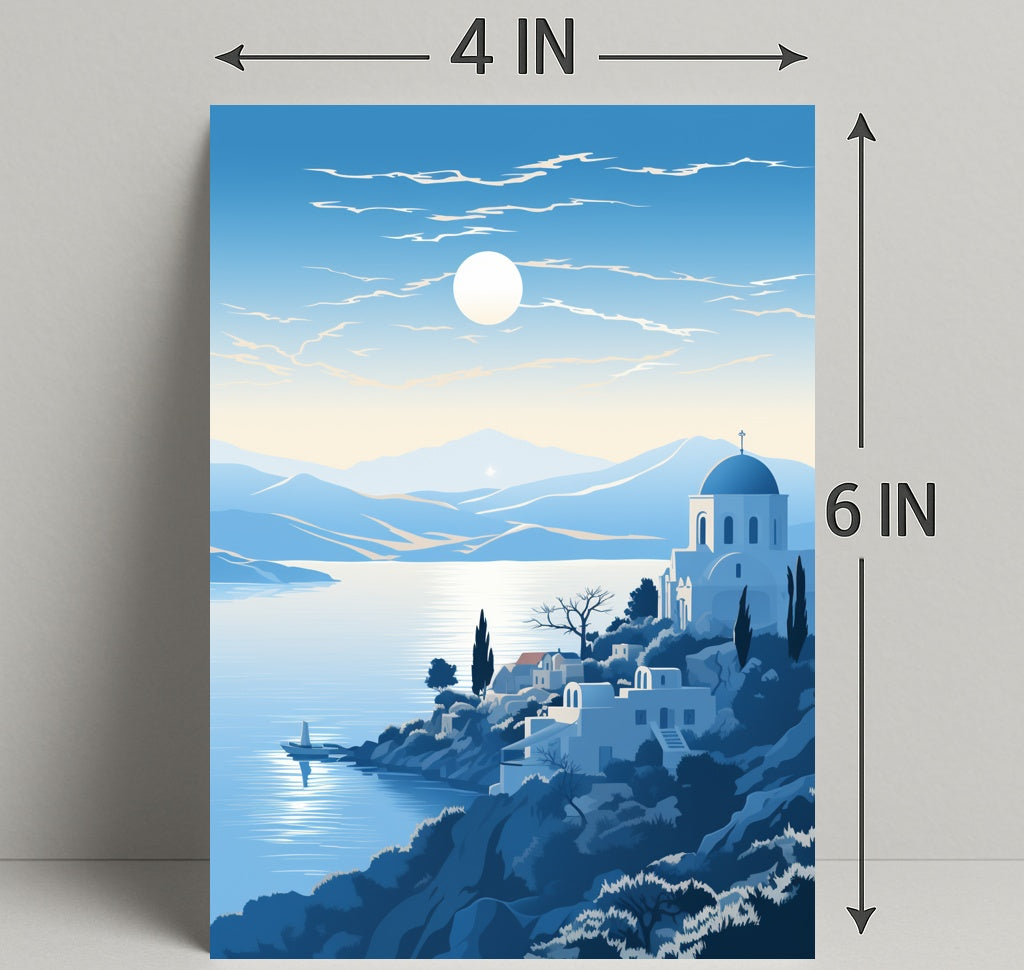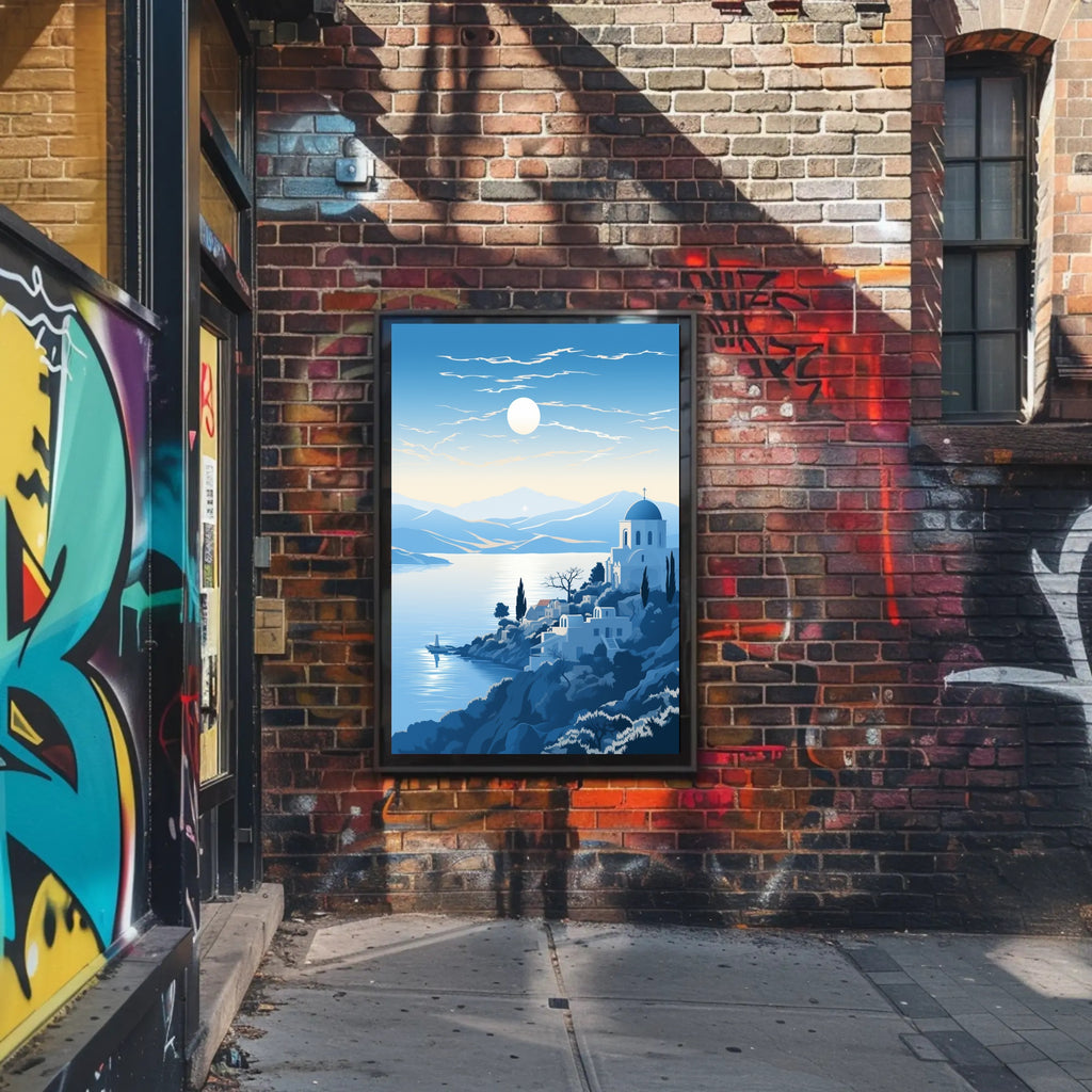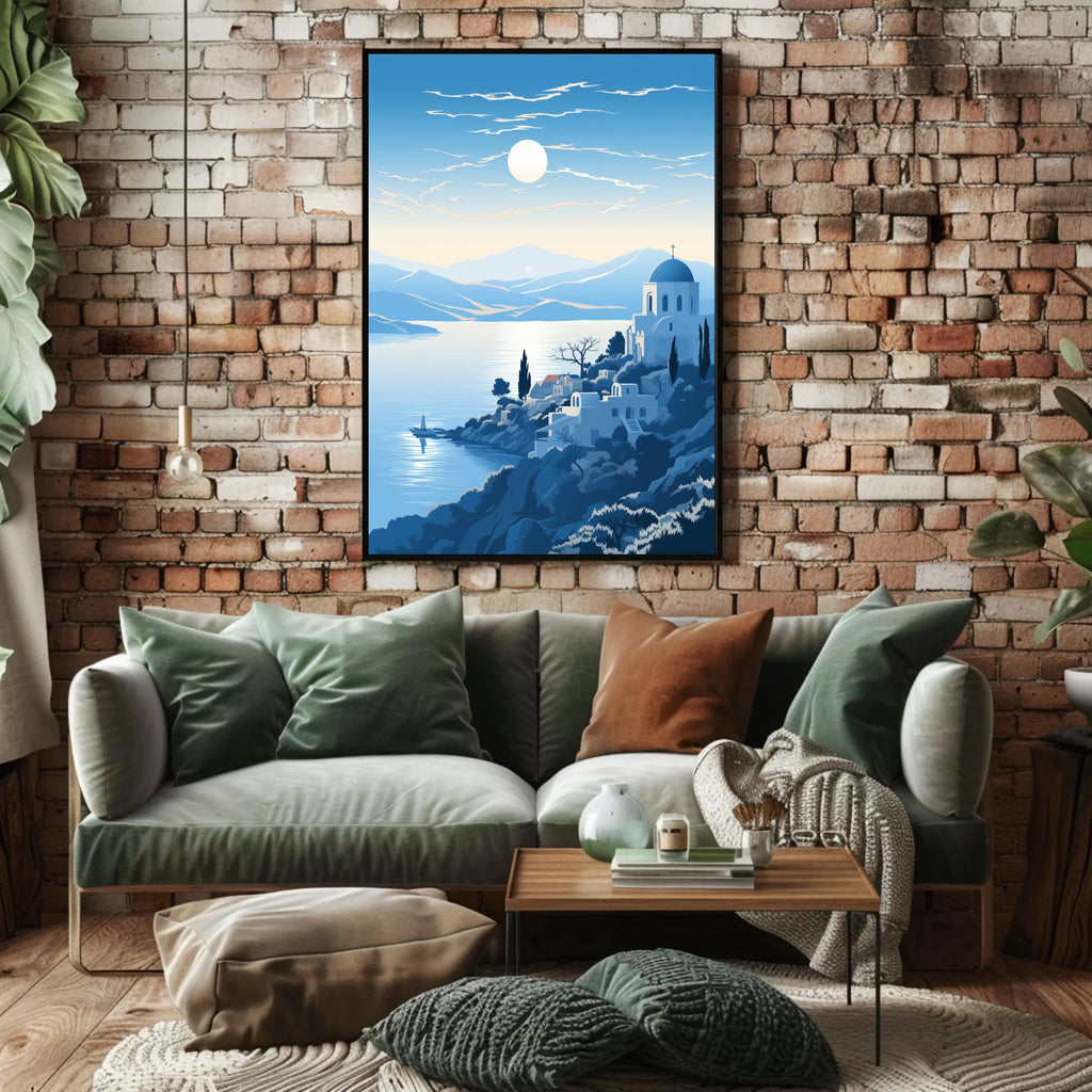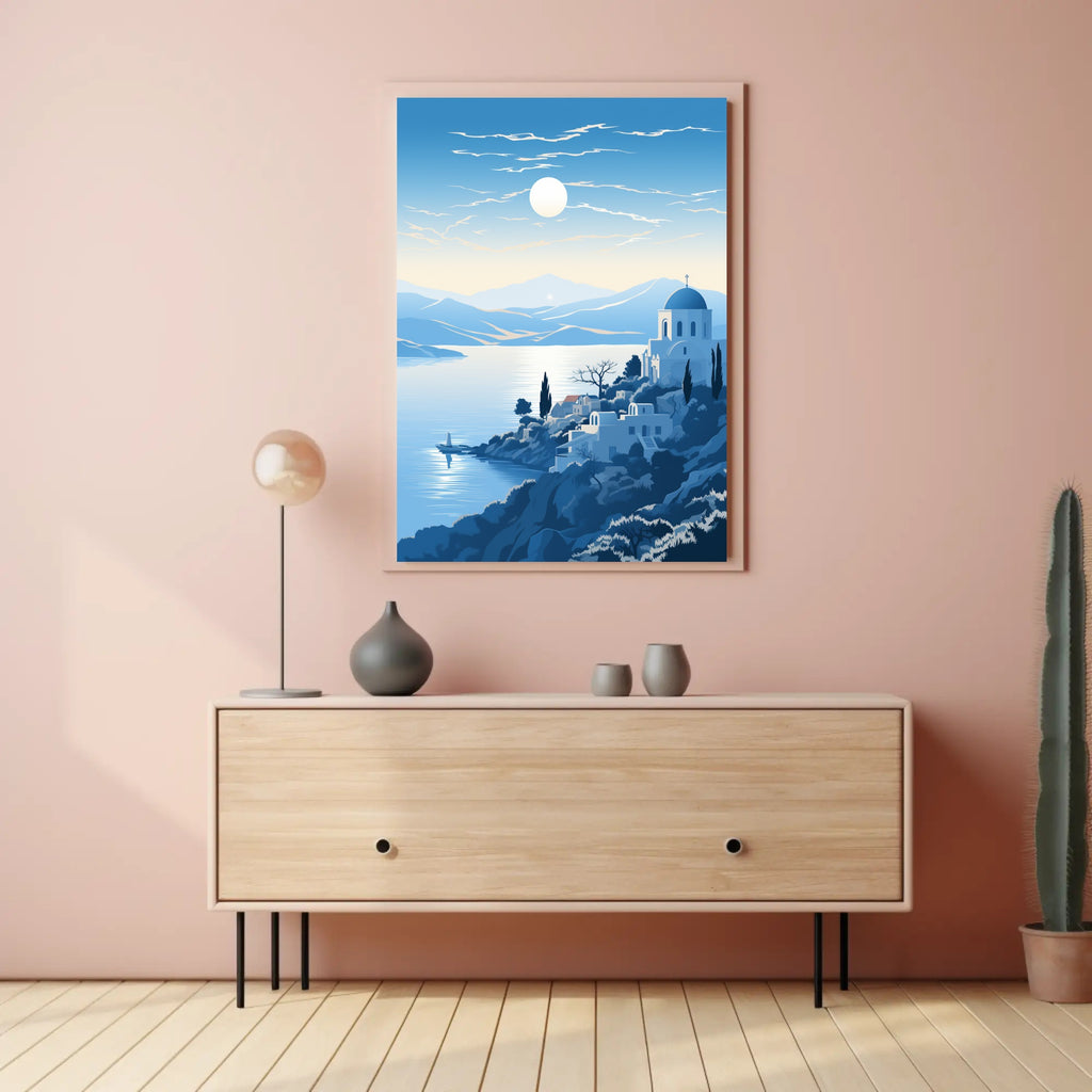 Bring the calm of the coast into your home with the Tranquil Mediterranean Landscape Poster from PosterGoat — an evocative art print that captures a sunlit bay, whitewashed architecture and rolling blue hills in a minimalist, scenic composition perfect for modern interiors.