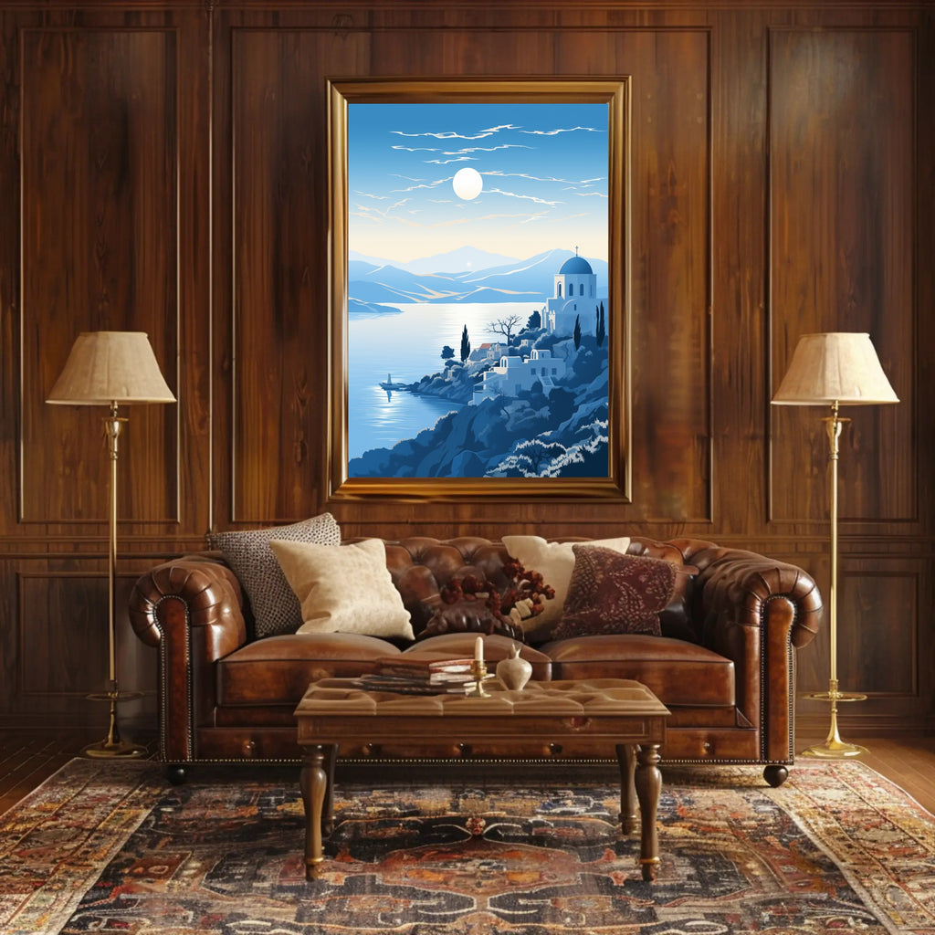 Serene Mediterranean mood: Soft gradients of blue and warm horizon tones recreate the tranquil light and timeless charm of Mediterranean landscapes, inviting relaxation and wanderlust into any room.