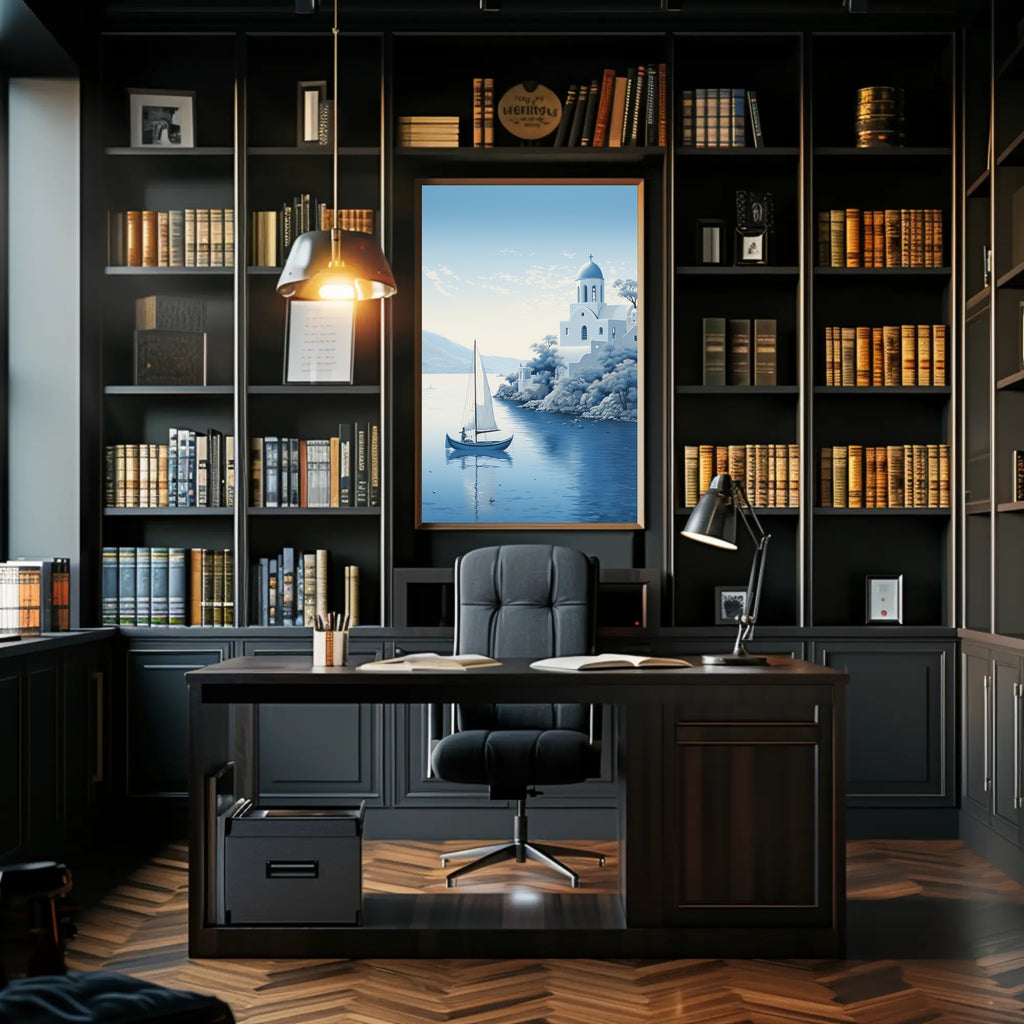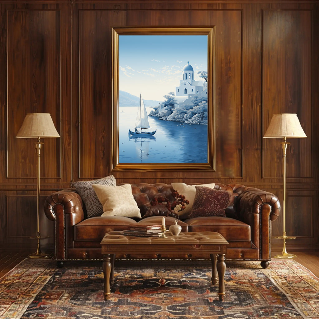 Serene coastal imagery: Detailed illustration of a sailboat, reflective water, rocky shoreline and iconic Mediterranean architecture that creates a peaceful focal point for any room.