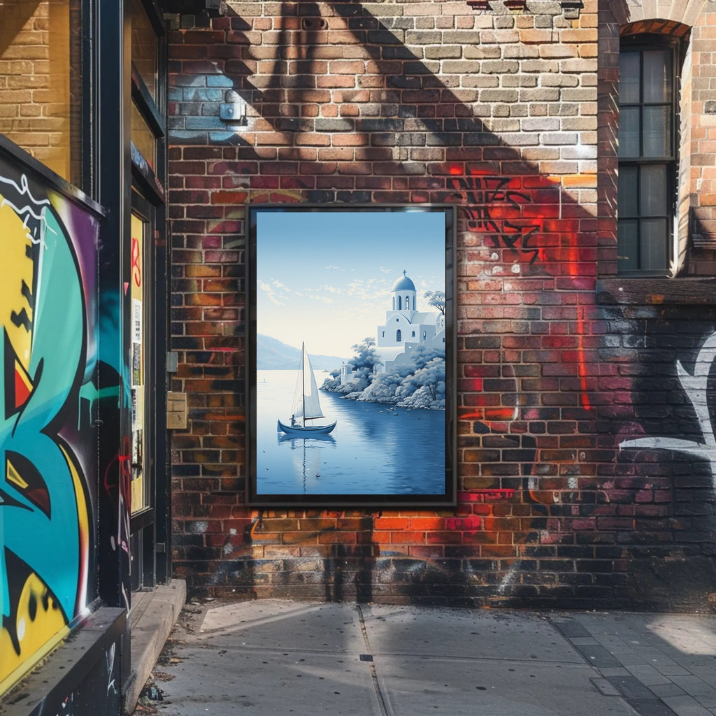 Bring the calm of the coast into your home with the Tranquil Mediterranean Scene Poster from PosterGoat. This minimalist, scenic print captures a sunlit seaside cove — a lone sailboat gliding across glassy water, a classic whitewashed church with a domed roof and cross perched on rocky cliffs, and soft, tree-lined terraces fading into distant hills — all rendered in a soothing blue palette that evokes Mediterranean serenity.