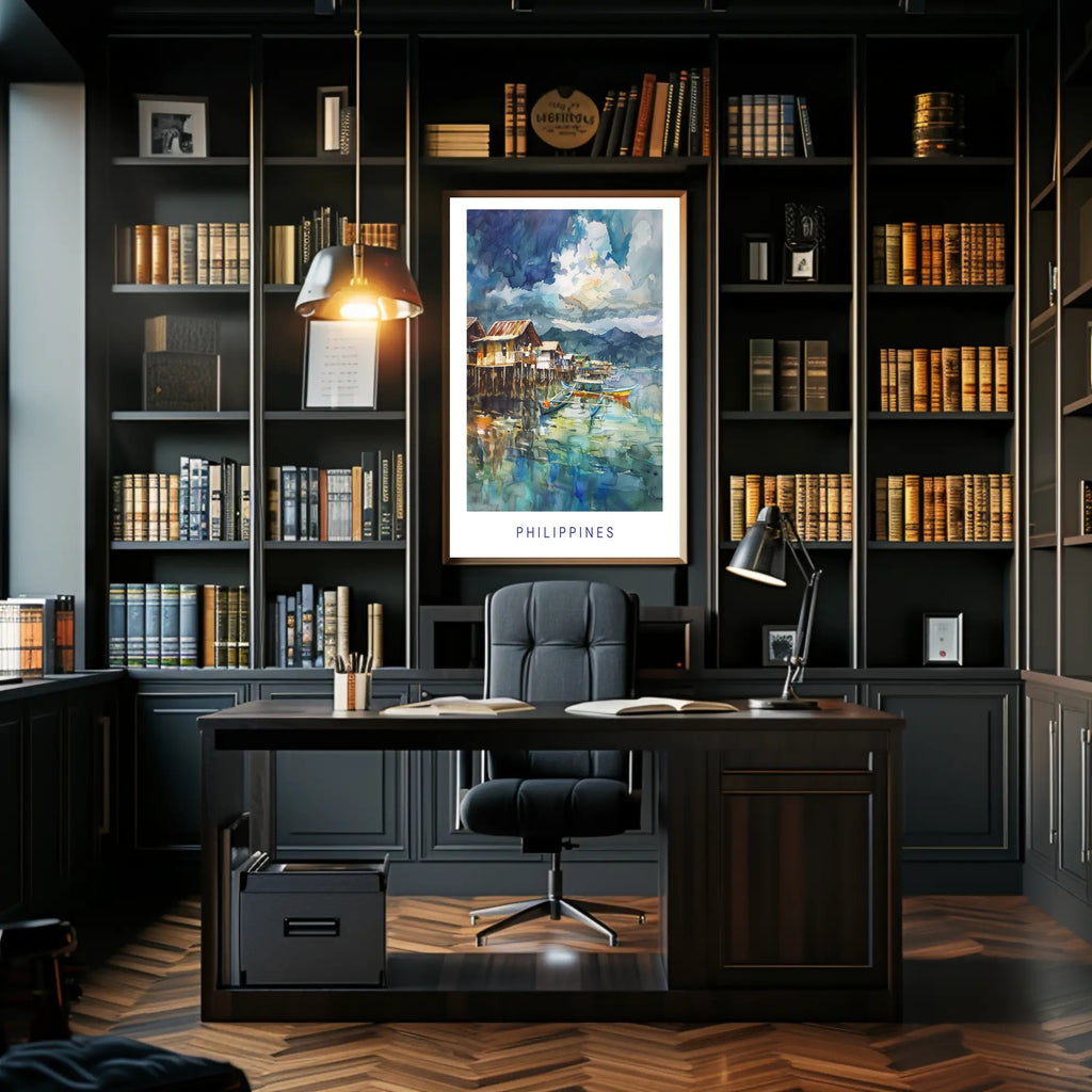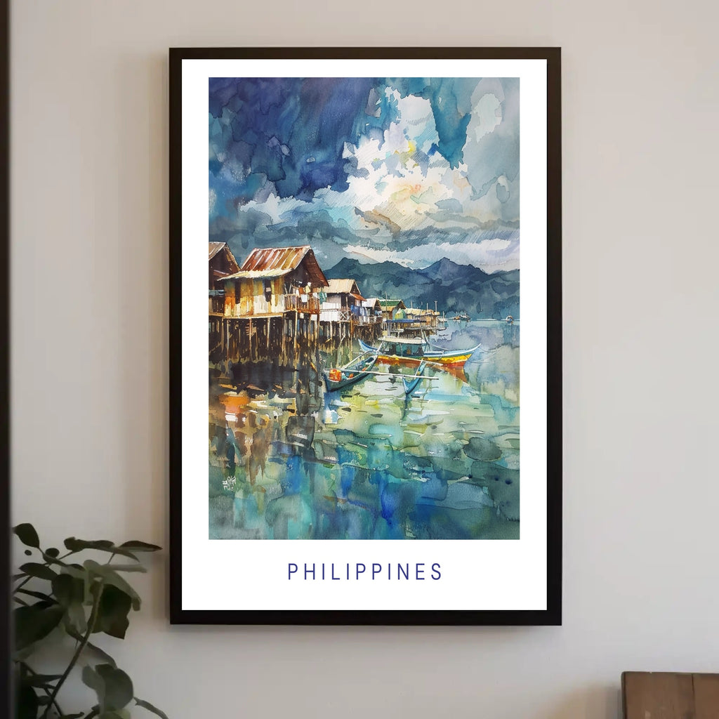 Immerse yourself in the serene beauty of a quaint coastal scene from the Philippines with this exquisite watercolor poster. The composition features traditional stilt houses with their rustic, corrugated rooftops, casting reflections on a calm and vibrant water surface. Small, vividly painted wooden boats anchor the foreground, complementing the lush mountainous backdrop under a dramatic, cloudy sky. The artwork's fluid brushstrokes and soothing color palette capture the essence of coastal life, offering a peaceful, idyllic slice of nature and culture. Perfect for travel enthusiasts and art lovers alike, this piece beautifully combines tranquility with cultural charm.