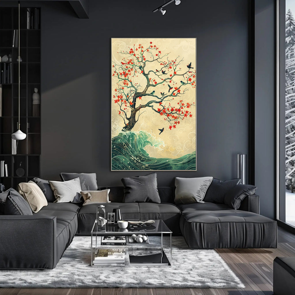 Why it stands out: The artwork marries soft, parchment-like background textures with bold teal waves and vibrant red floral accents, delivering high-contrast visual drama while maintaining an overall sense of serenity. Fine linework on the trunk and branches, paired with stylized wave patterns and splash details, gives the piece a hand-crafted, vintage collage aesthetic that complements contemporary and classic interiors alike.