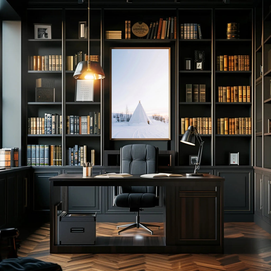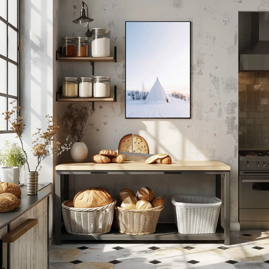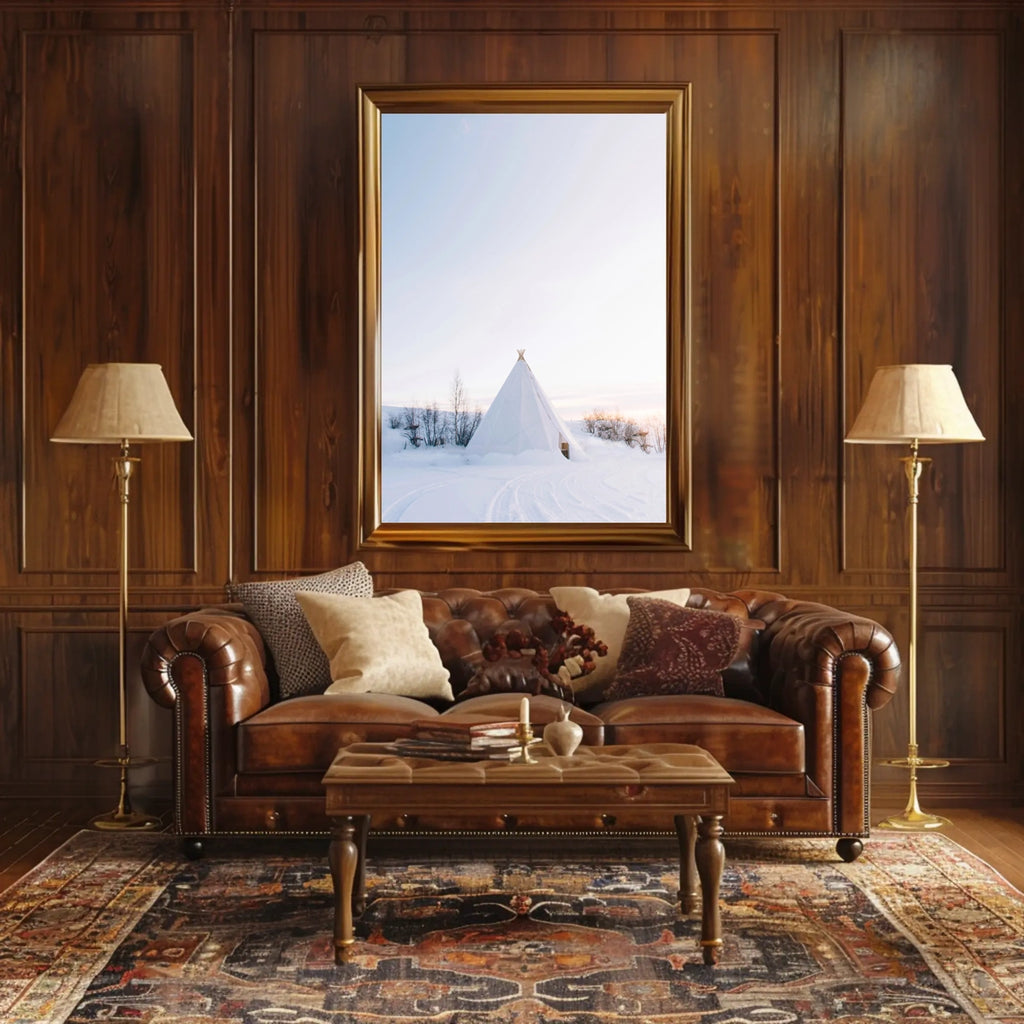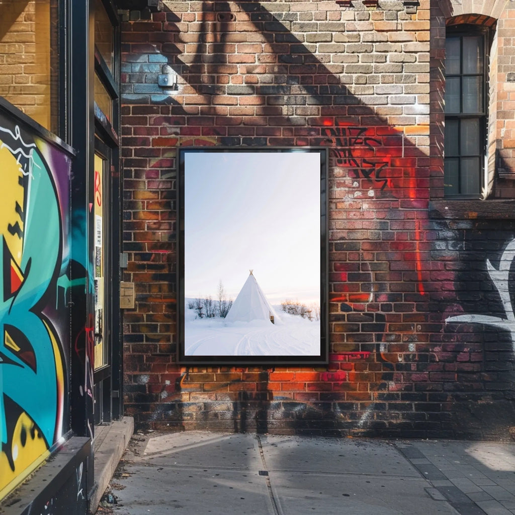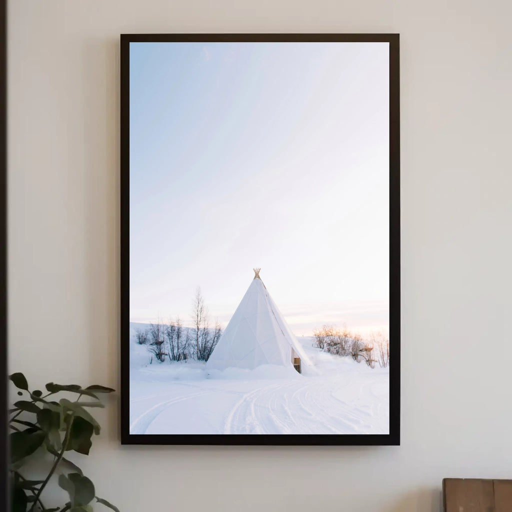 This photorealistic poster captures a serene winter wonderland: a white tipi nestled in snow-blanketed terrain, with bare, spindly trees dotting the landscape. The soft pastel hues of dawn or dusk wash the sky, inviting a sense of calm and quiet. Its minimalistic style echoes Nordic and Scandinavian aesthetics, offering a touch of peaceful elegance to any room. Perfect for fans of artistic landscape, calm home decor, and minimalistic art.