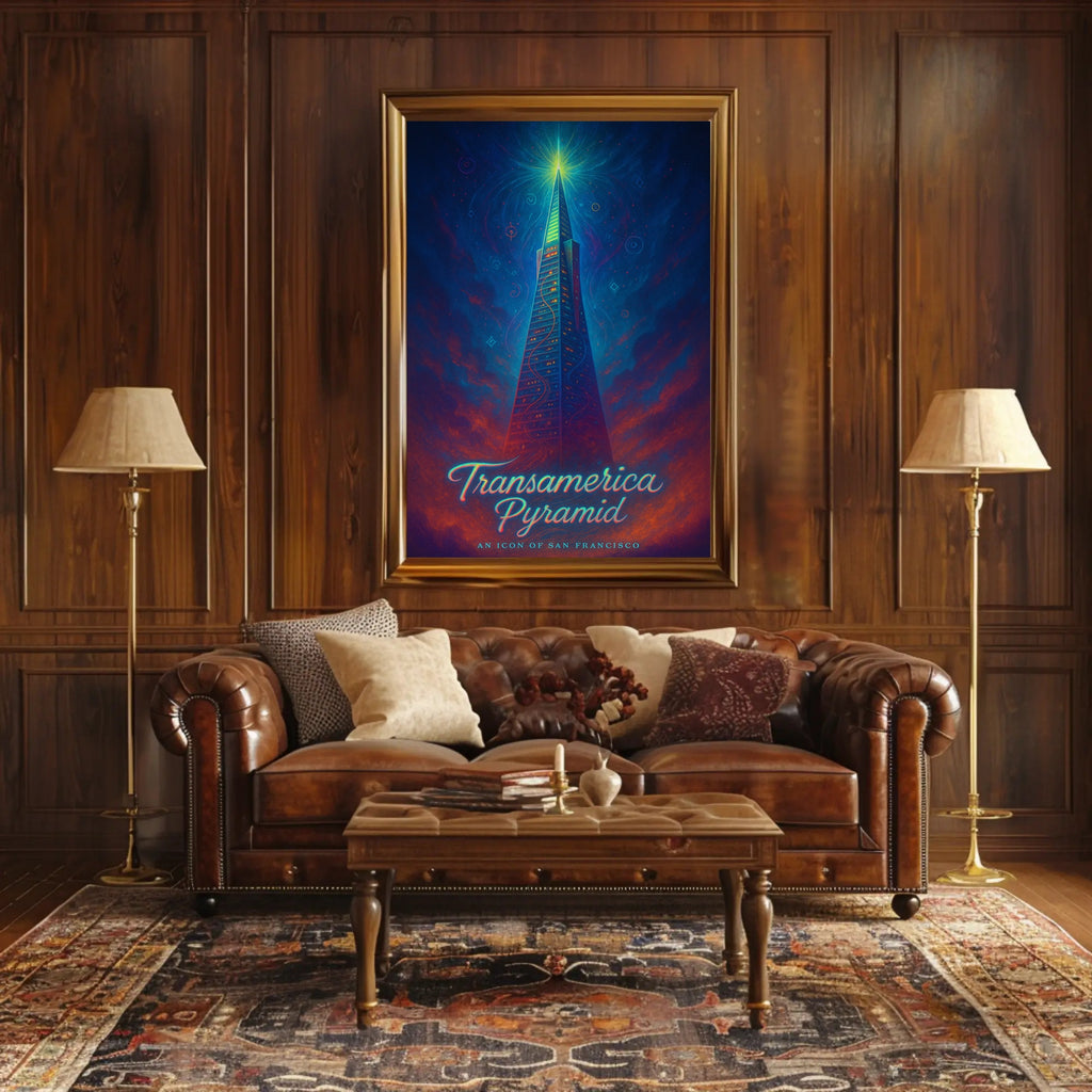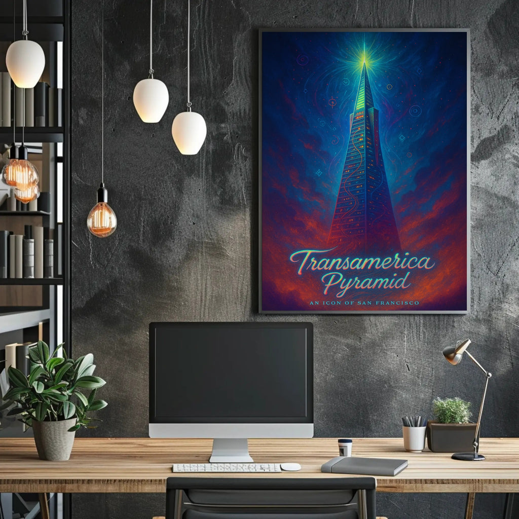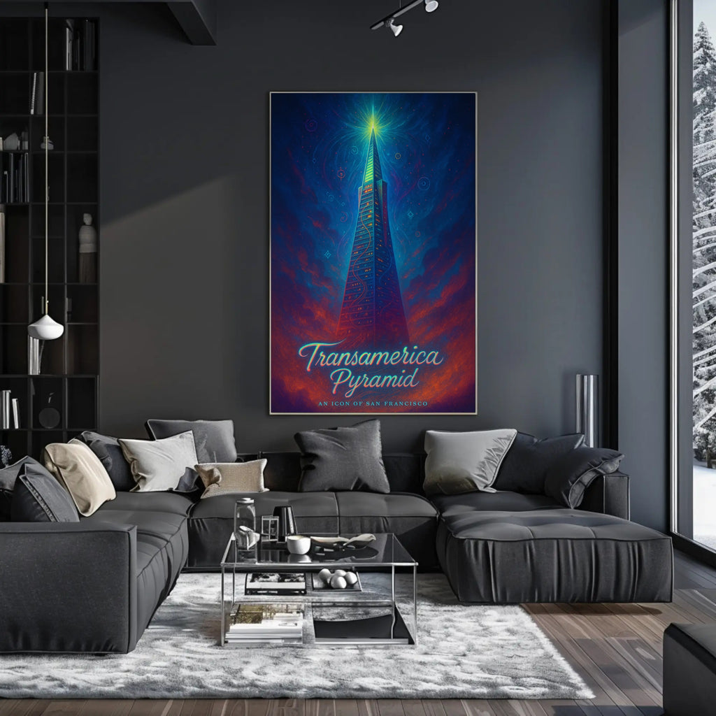 Celebrate San Francisco's most recognizable silhouette with this striking Transamerica Pyramid poster from PosterGoat. Rendered in a vivid, cinematic palette with glowing highlights and a minimalist travel-inspired aesthetic, this art print turns any room into a tribute to iconic architecture and city wanderlust.
