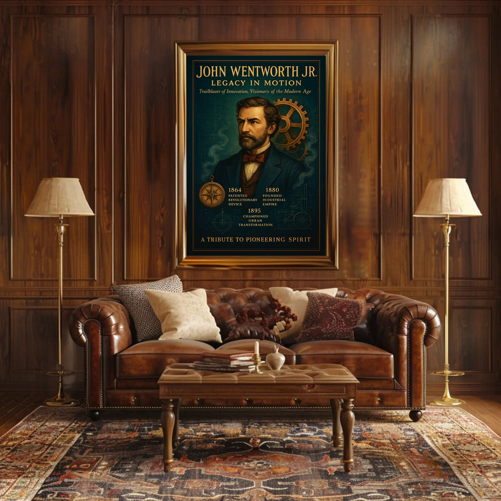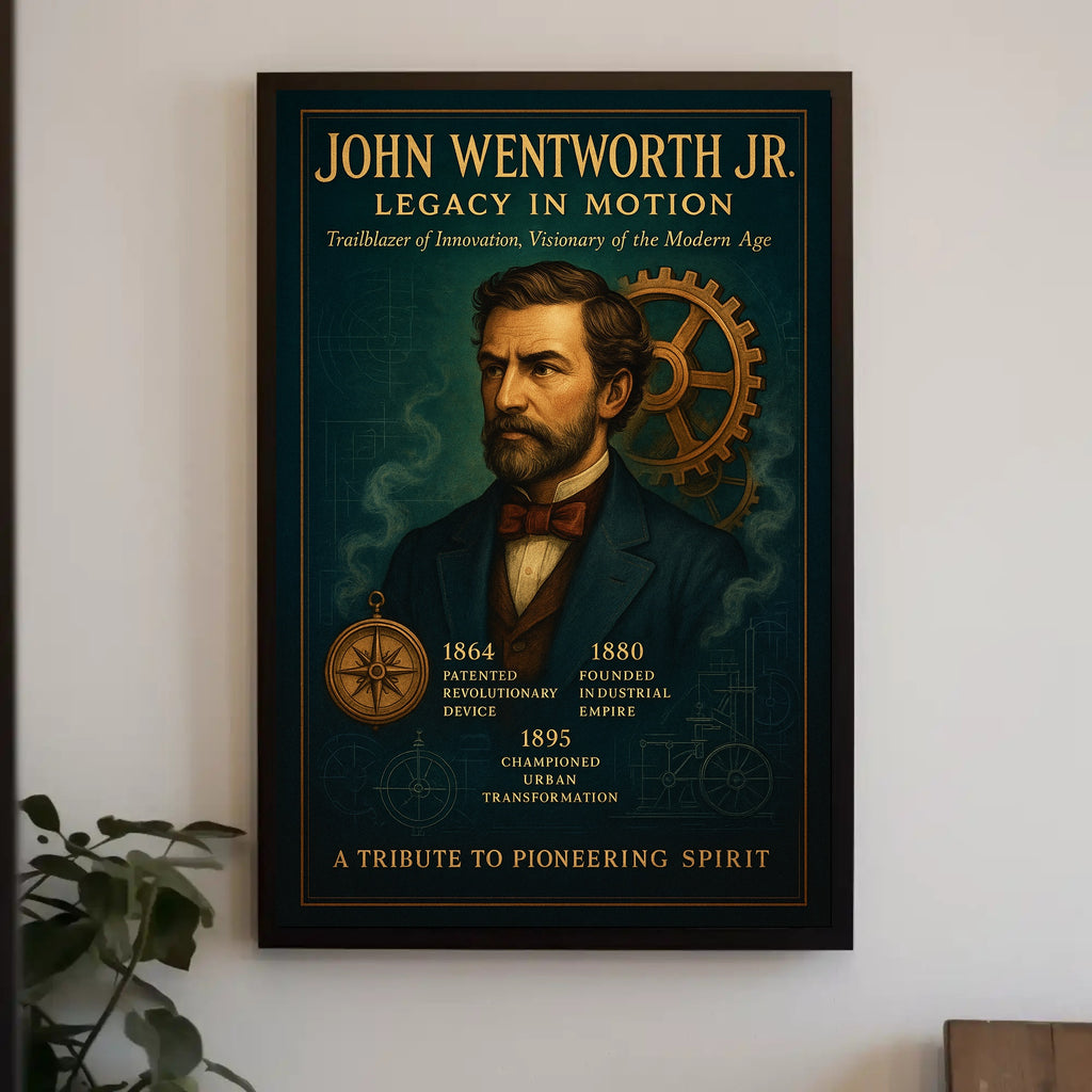 Immerse your space in the grit and grandeur of the industrial age with the "Tribute to Pioneering Spirit" poster by PosterGoat. This vintage-style print presents a photorealistic portrait of a distinguished gentleman—John Wentworth Jr.—set against a deep teal backdrop, hand-rendered mechanical sketches, brass gears and a classic compass emblem that together evoke innovation, urban transformation, and technological ambition.