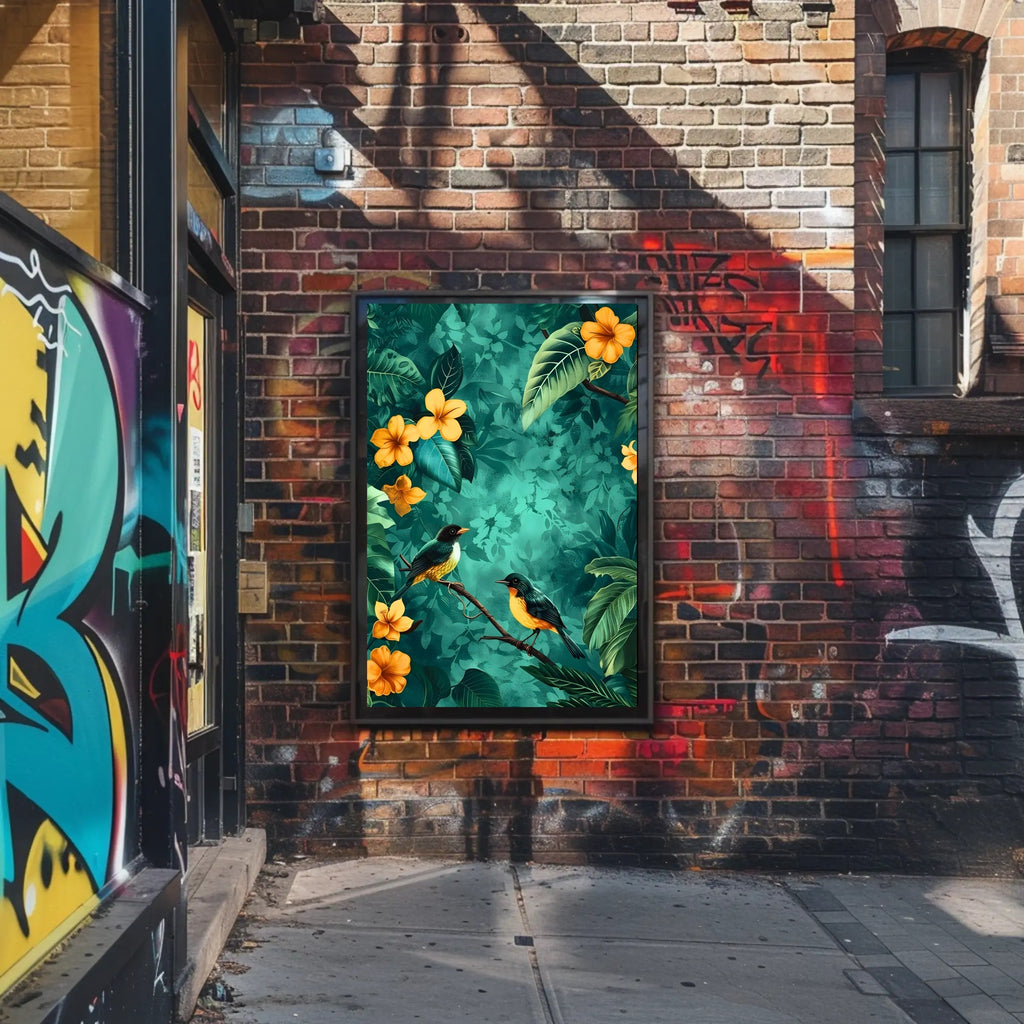 Bring a slice of tropical paradise indoors with the "Tropical Birds in Lush Jungle Animal Poster" from PosterGoat. This modern illustrative poster captures two vibrant birds perched on a delicate branch, set against a textured teal jungle backdrop and framed by oversized botanical leaves and warm golden blooms. The rich contrast of deep greens and bright yellows creates a striking focal point that enlivens living rooms, bedrooms, offices, or entryways.
