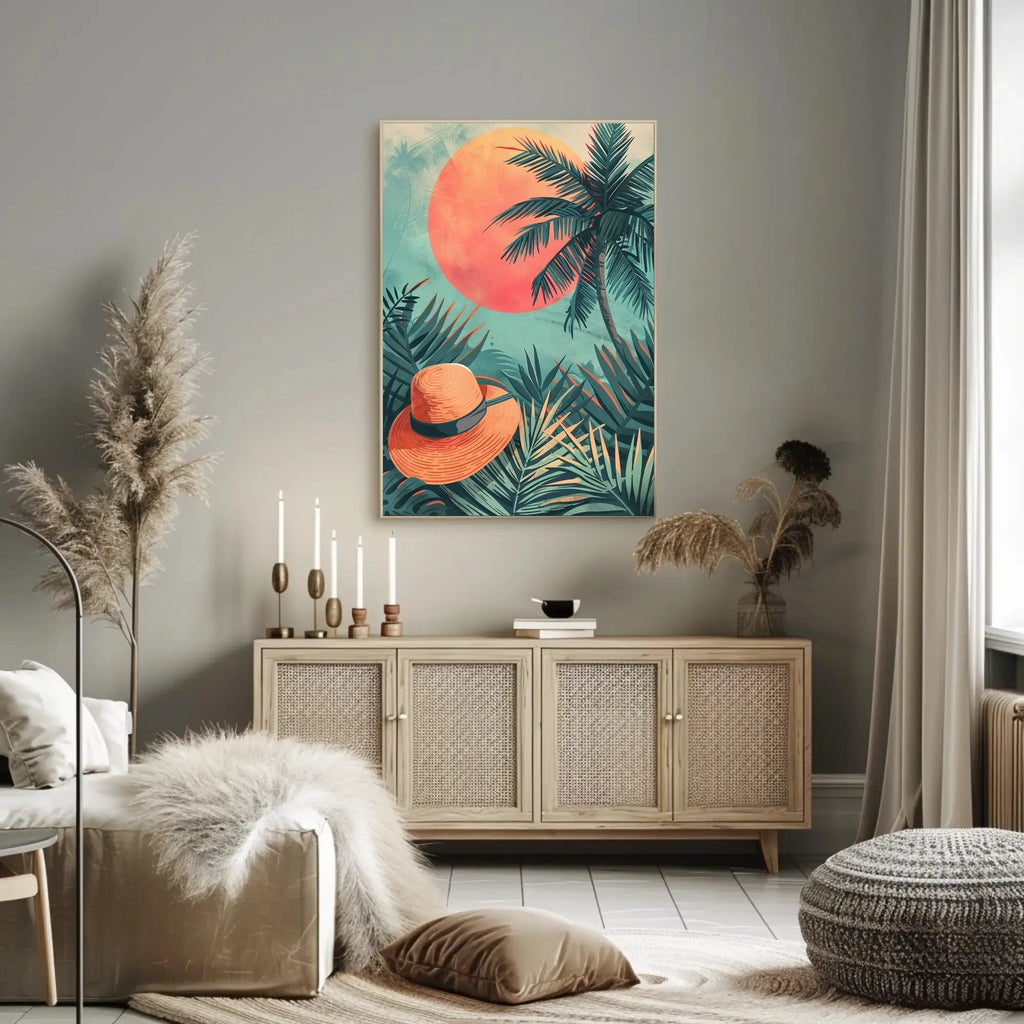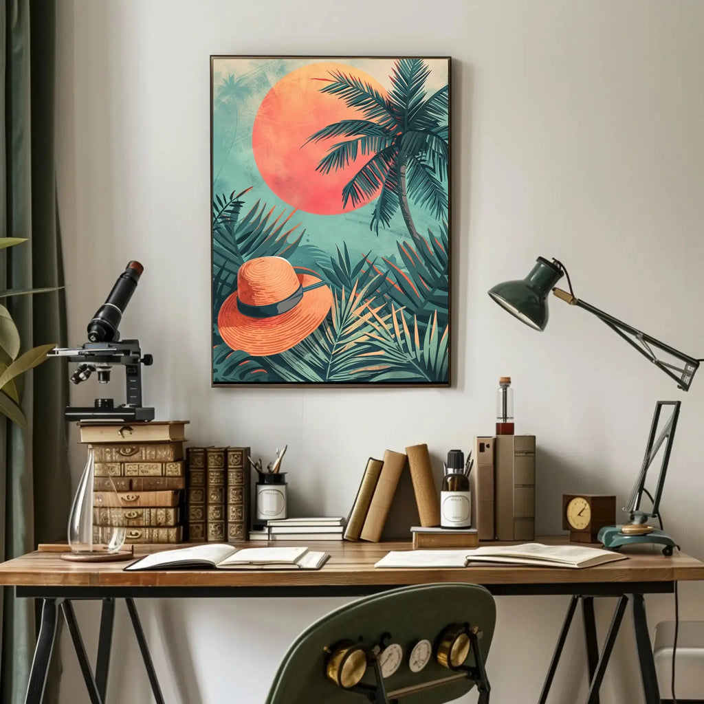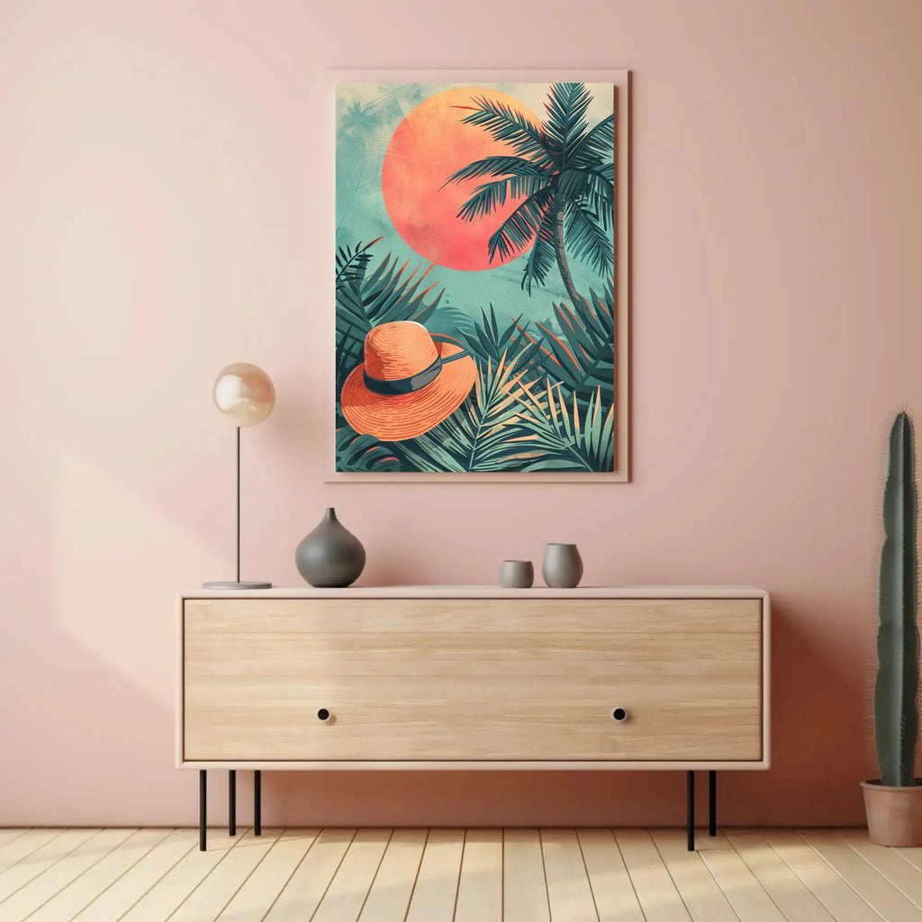 Bring the warmth of a coastal getaway into your home with the Tropical Sunset Escape Art Print Travel Poster by PosterGoat. This retro-inspired poster pairs a vibrant orange sun with lush teal foliage and a sunhat resting among palm fronds to create a serene, mid-century modern scene that invites daydreams of island sunsets.