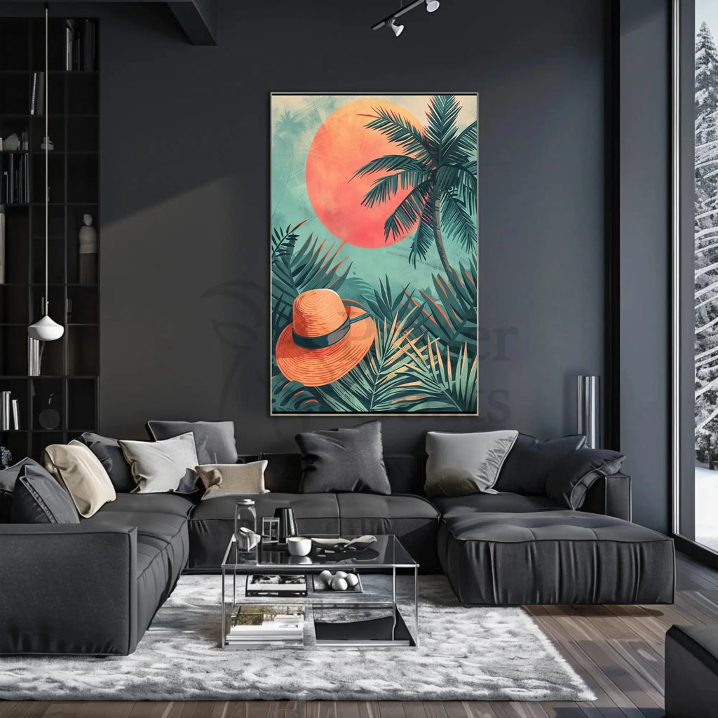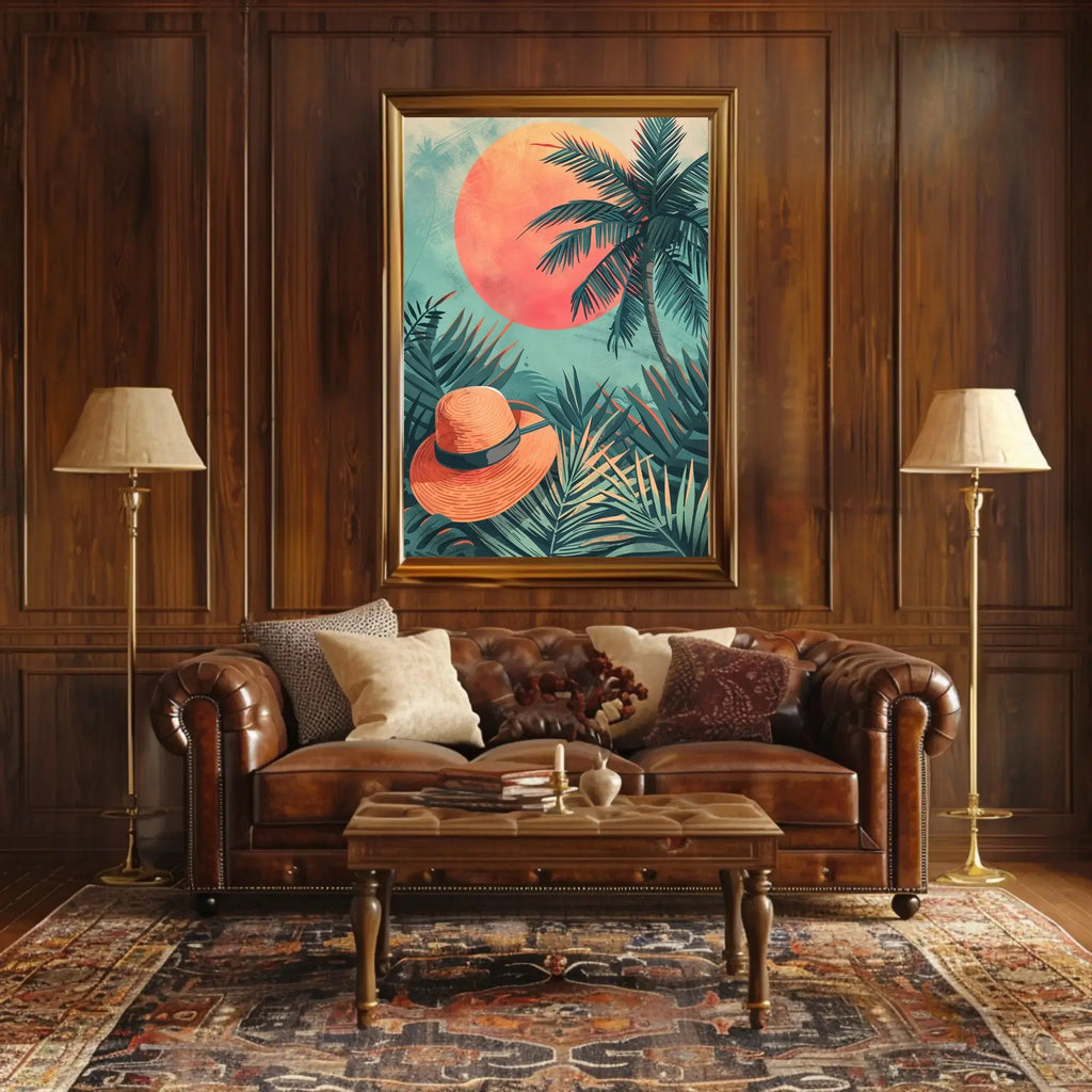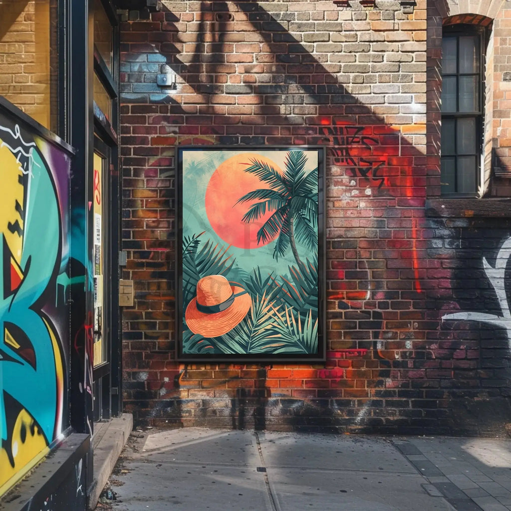 Bring the warmth of a coastal getaway into your home with the Tropical Sunset Escape Art Print Travel Poster by PosterGoat. This retro-inspired poster pairs a vibrant orange sun with lush teal foliage and a sunhat resting among palm fronds to create a serene, mid-century modern scene that invites daydreams of island sunsets.