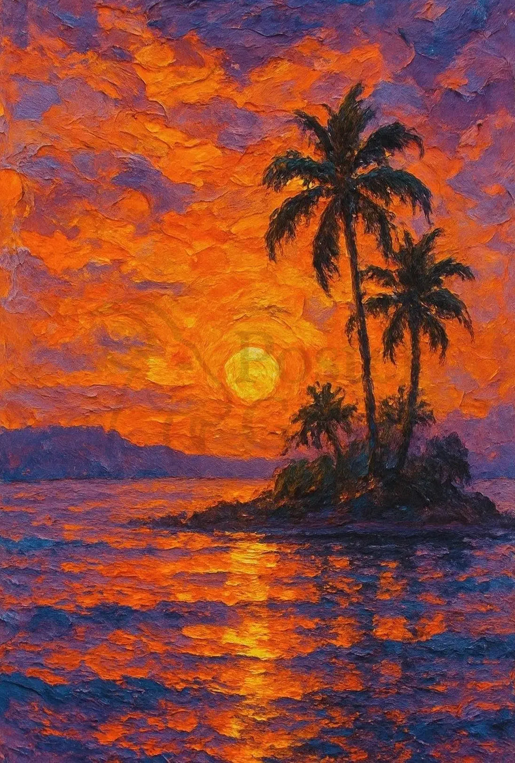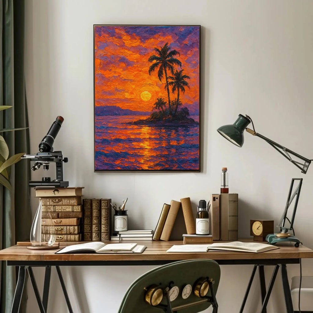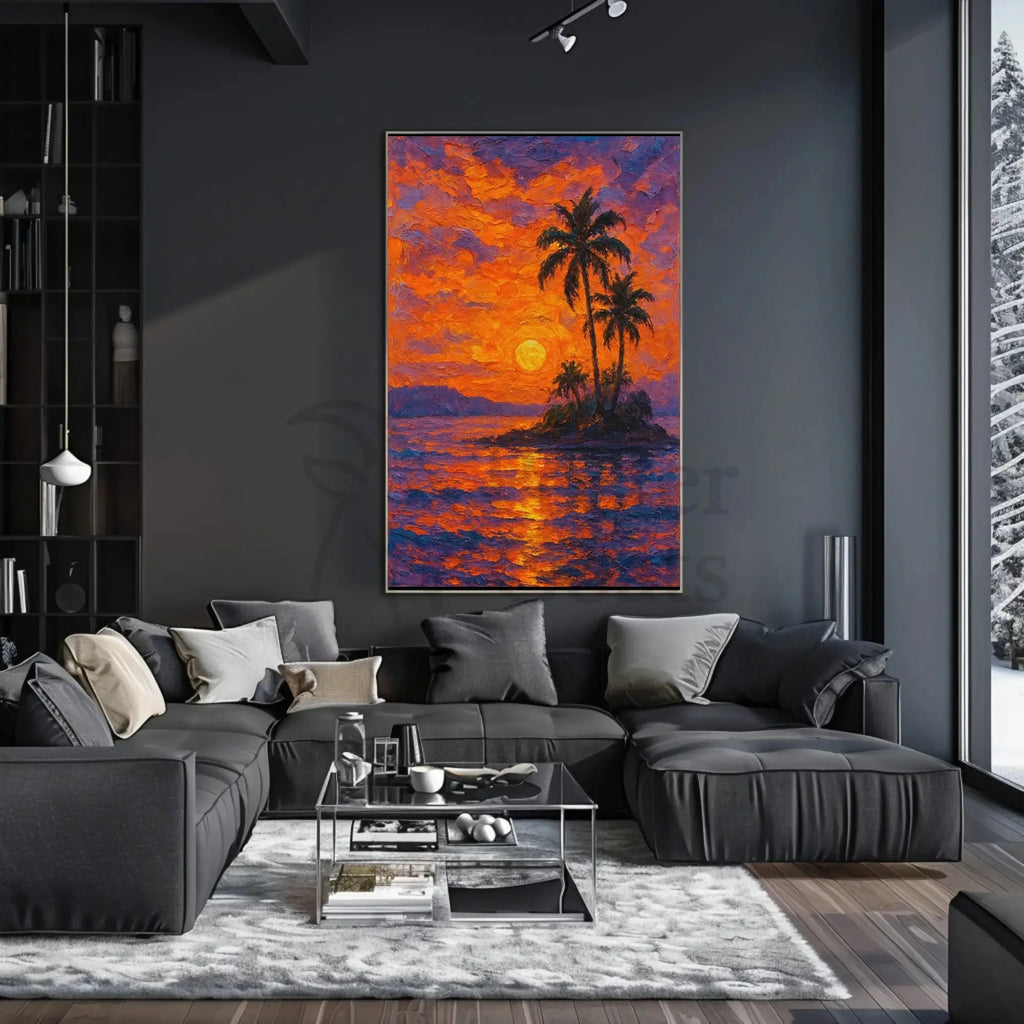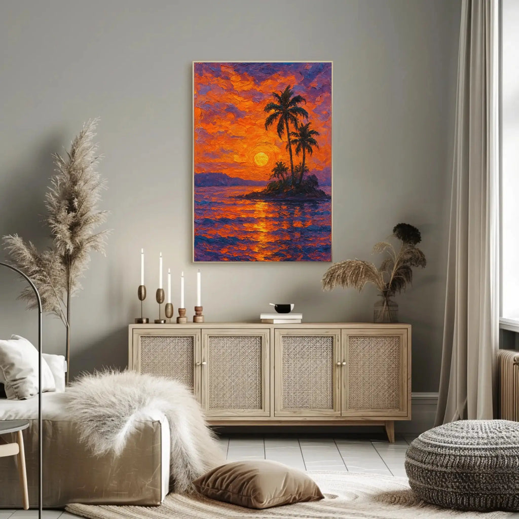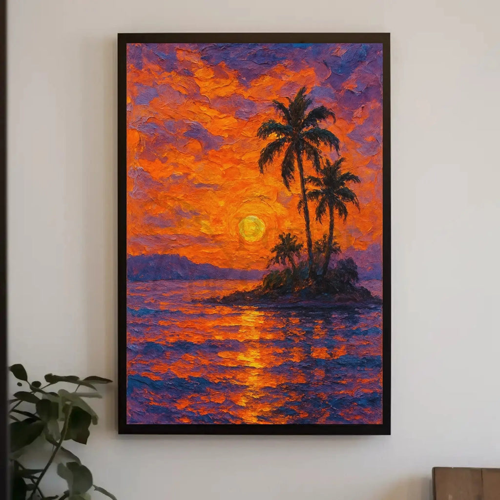 Bring the warm glow of a tropical evening into your home with "Tropical Sunset Serenity" from PosterGoat — an abstract, artistic poster that transforms any wall into a coastal escape. Rich, impressionistic brushstrokes meld fiery oranges, deep purples and oceanic blues to create a dreamlike sunset scene complete with silhouetted palm trees and shimmering water reflections.
