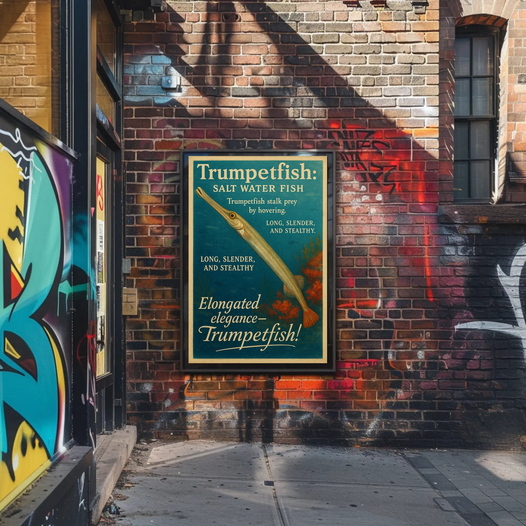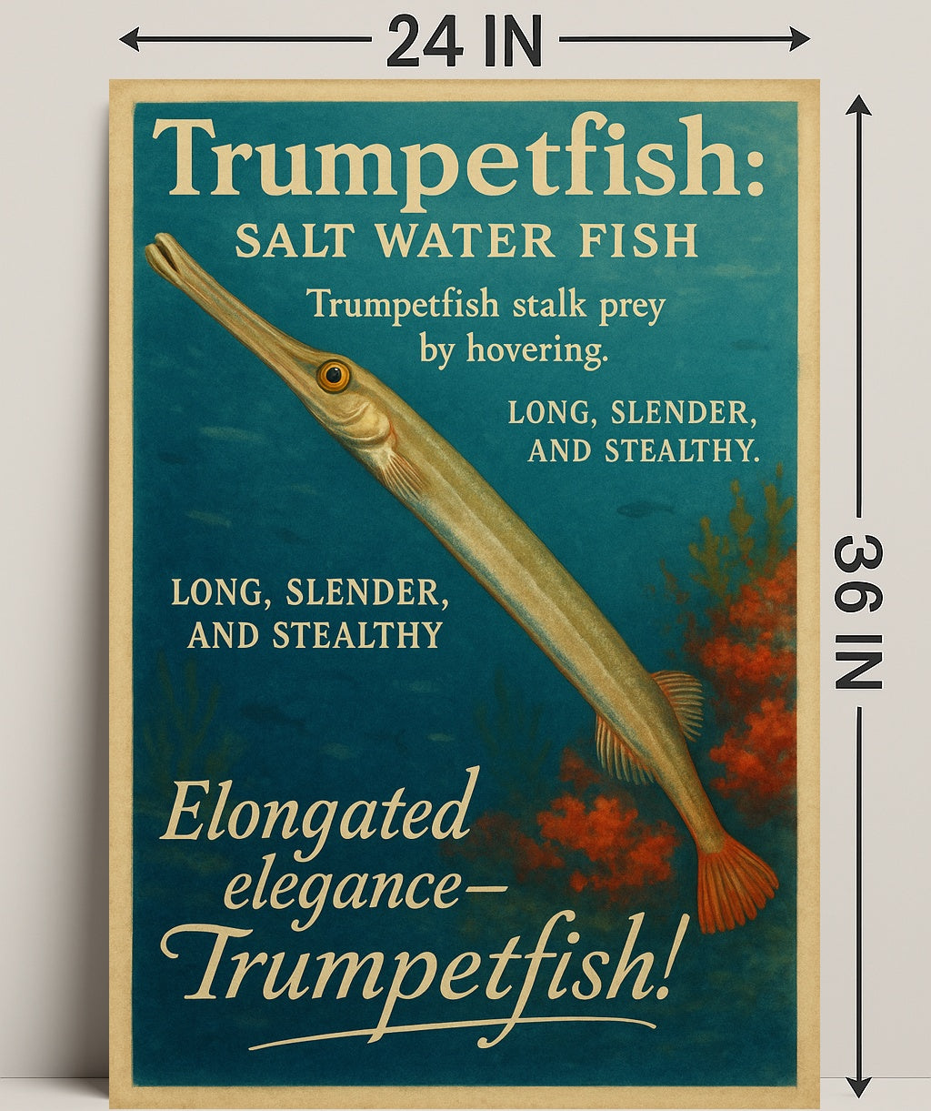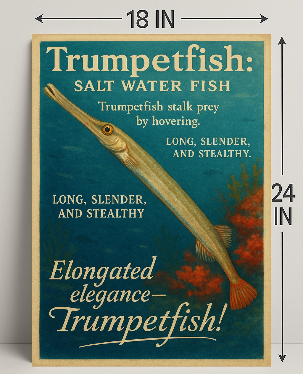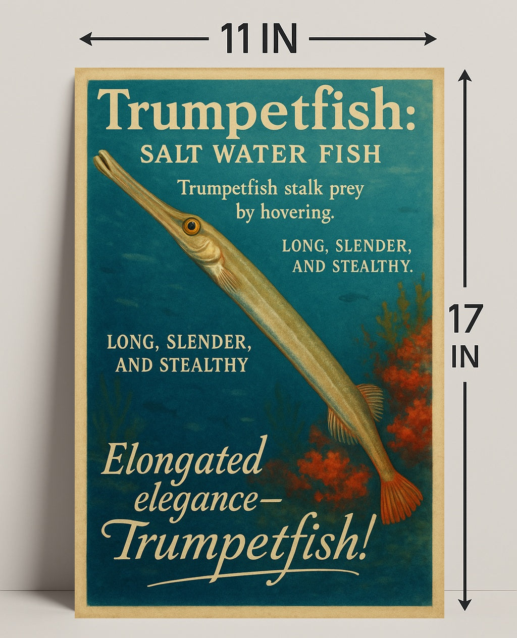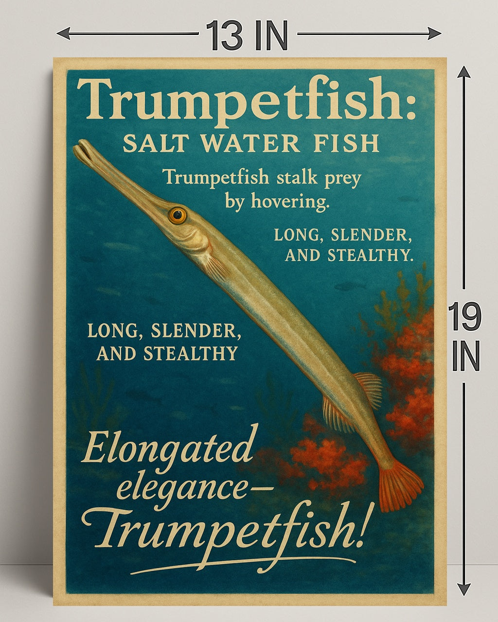 Authentic Design: Features a meticulously crafted illustration that showcases the elegance of the Trumpetfish in its natural habitat.