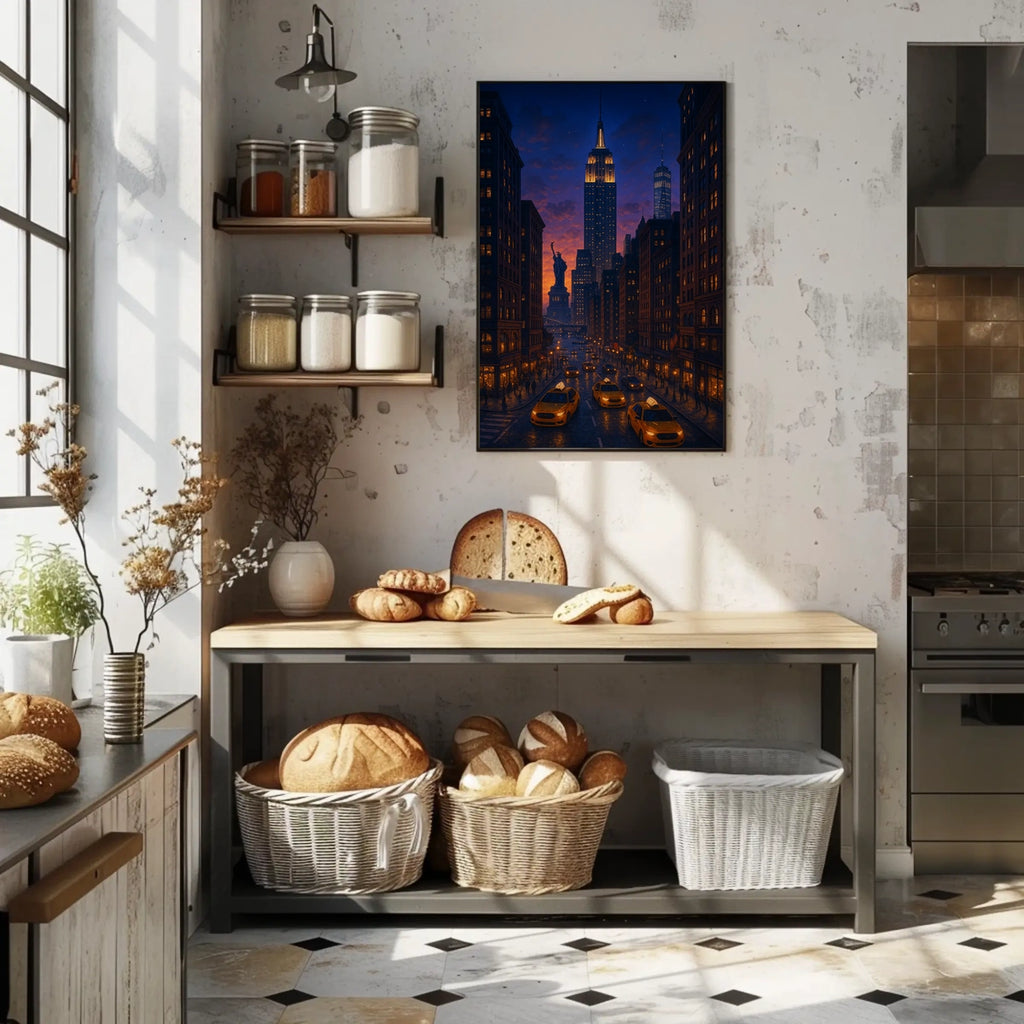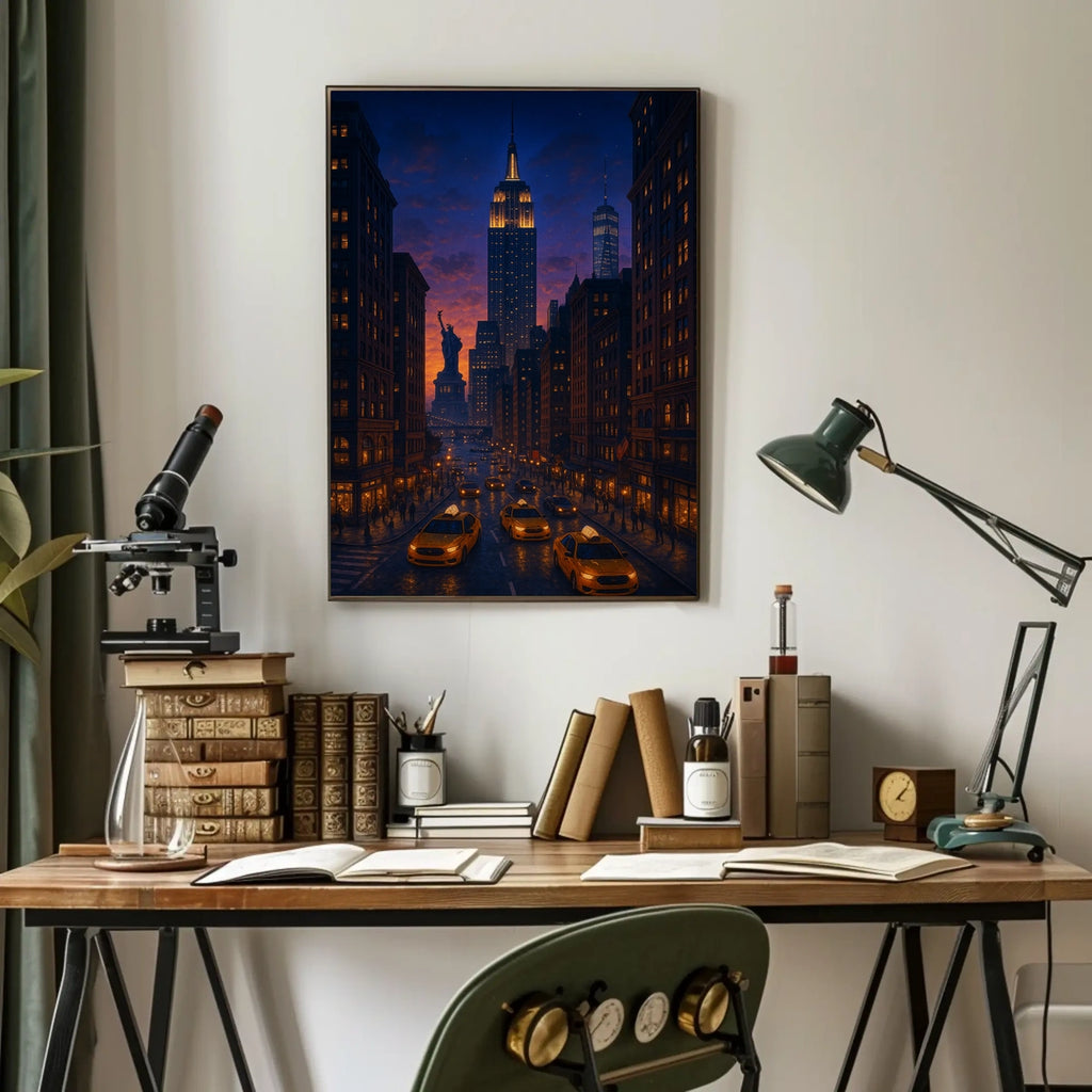 Immerse yourself in the captivating beauty of a city at twilight with this stunning poster. The skyline glows with a warm, inviting balance of light and shadow, capturing the heartbeat of urban life—from streetlights to moving taxis—into a single, atmospheric moment. A perfect piece for lovers of cityscape, dusk, and skyline art, this print adds depth and mood to any room.