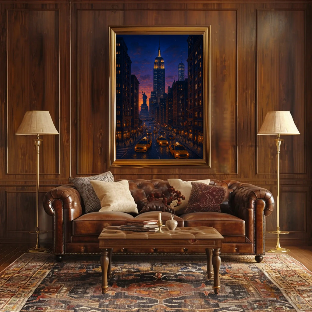 - Dynamic urban details (streetlights, skyscrapers, yellow taxis) evoke authentic city life and movement.